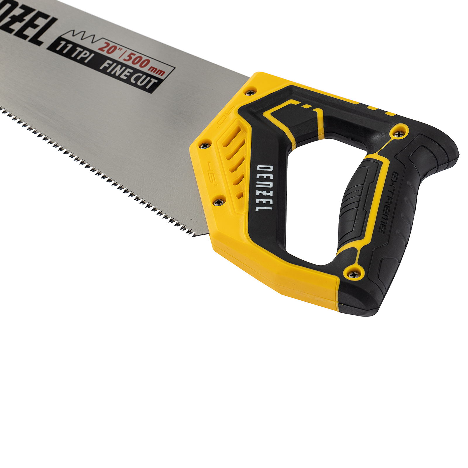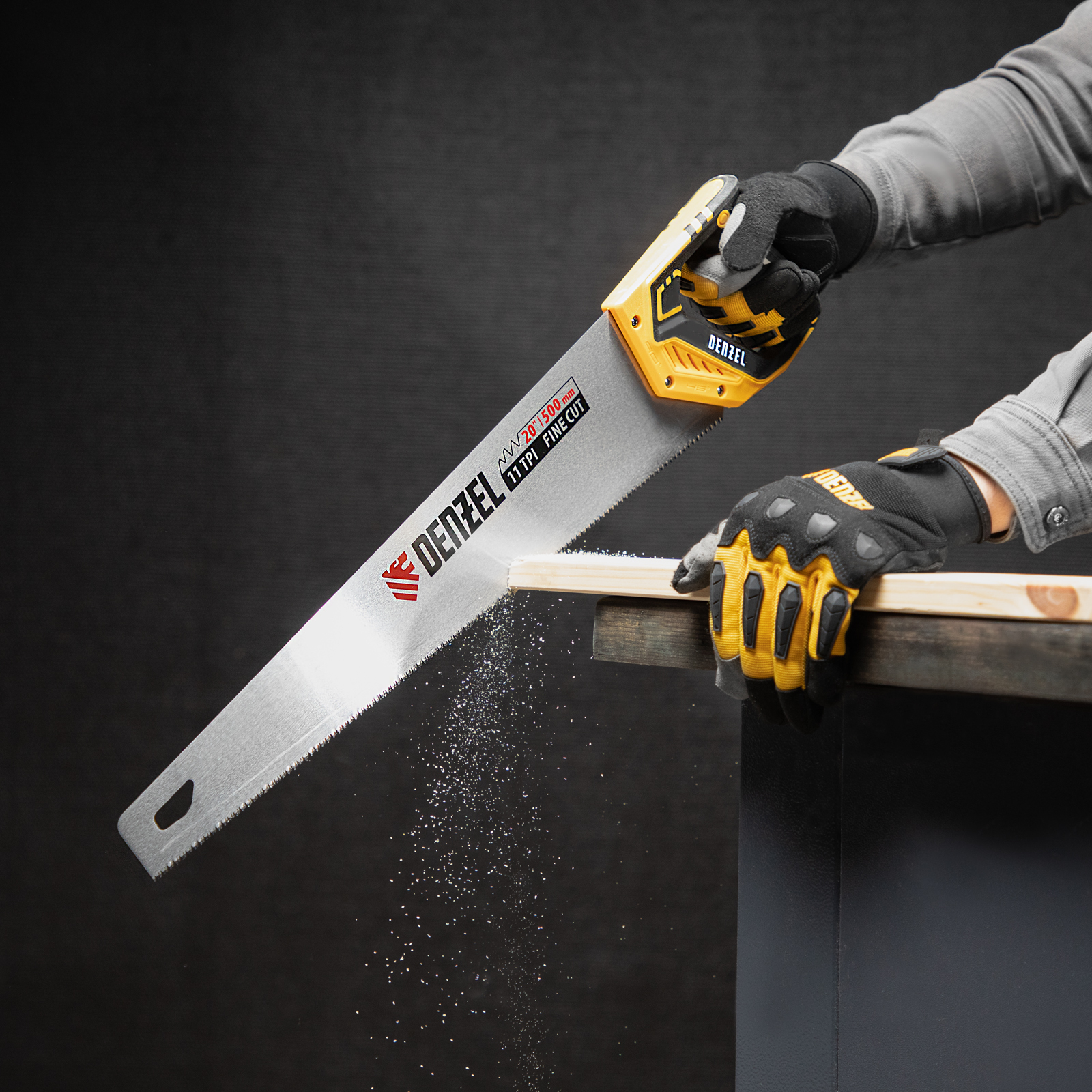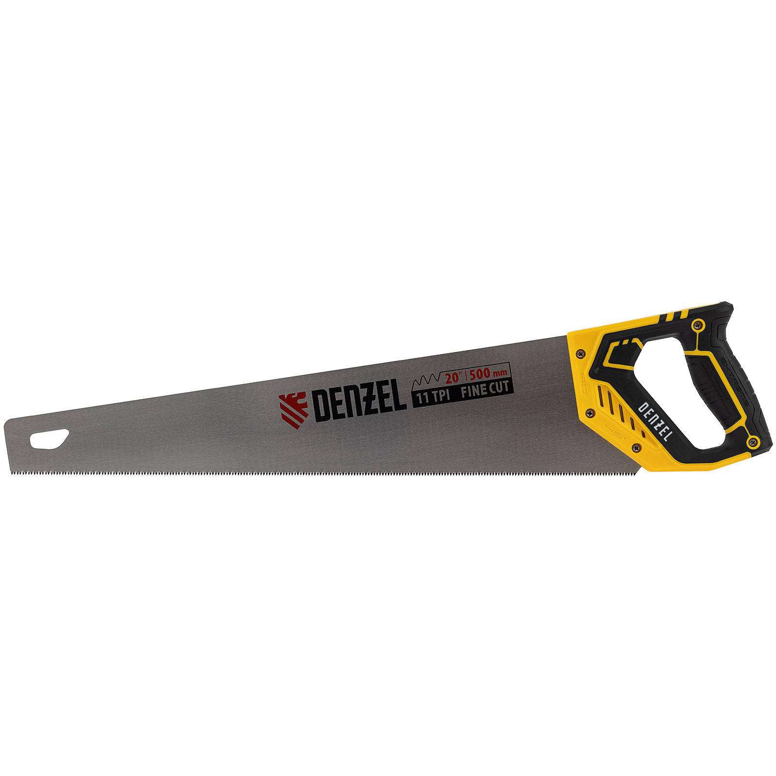 Ножовка по дереву Denzel 24148 длиной 500 мм, с зубьями с шагом 11 TPI и 3D-заточкой, с двухкомпонентной рукояткой, предназначена для продольной и поперечной распиловки заготовок из древесины, ДСП, ДВП, МДФ, ламината, а также из ПВХ (труб, панелей, коробов). Подходит для распиливания плинтусов, вагонки, деревянных профиле й. Мелкие зубья с шагом 11 TPI позволяют выполнять точный и чистый рез. Ножовка используется для проведения столярных работ в мастерской и на дачном участке.