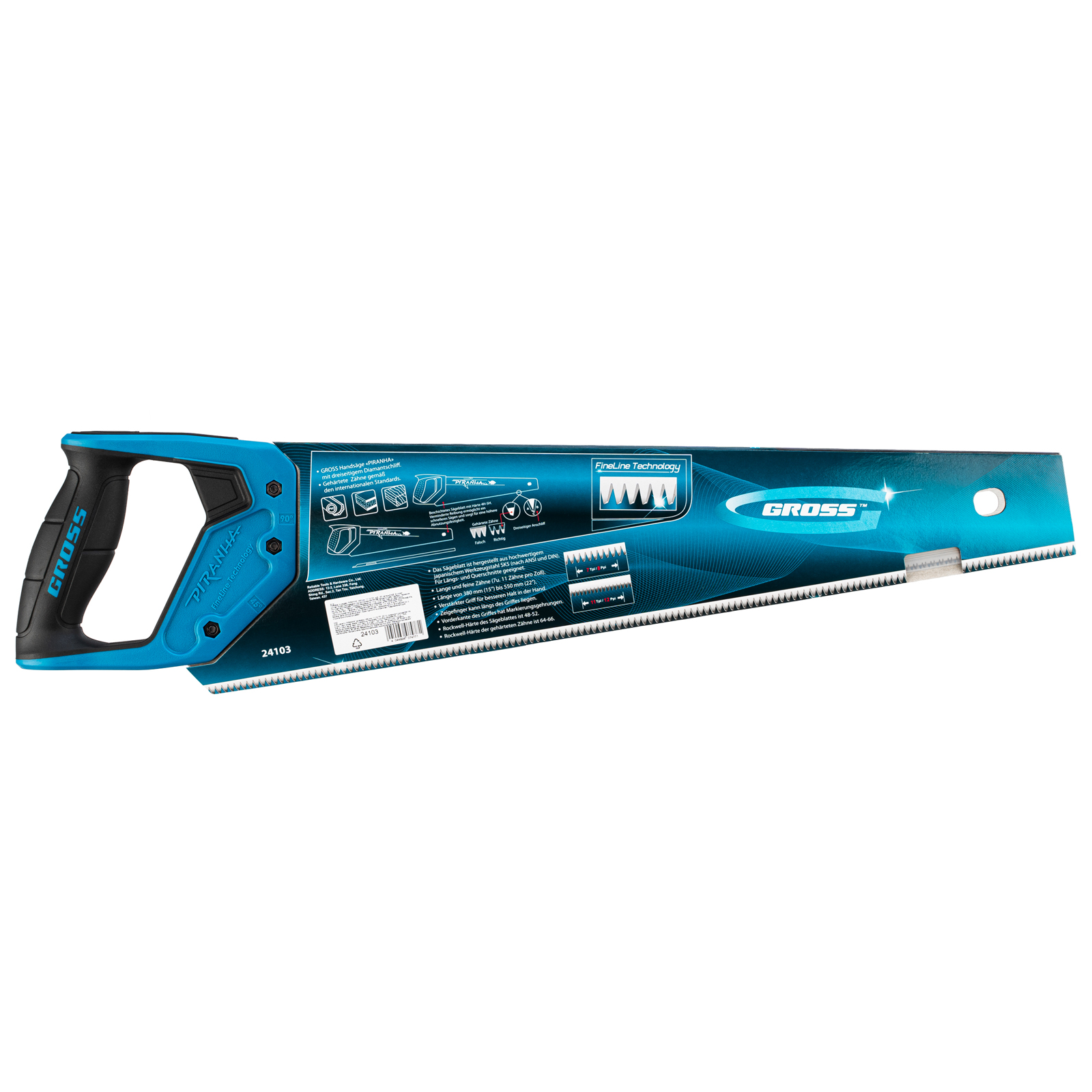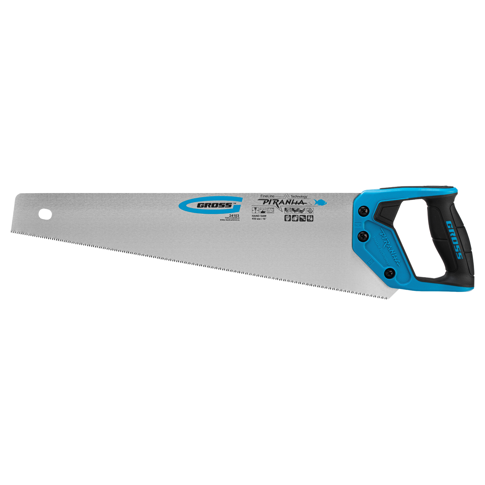 Ножовка по дереву Gross PIRANHA 24103 с полотном длиной 450 мм, калеными зубьями с 3D-заточкой и шагом 11-12 TPI, 2-компонентной рукояткой, предназначена для распиловки заготовок из древесины, ДСП, ДВП, МДФ и ламината, а также из пластических материалов, таких как пенополистирол и полиуретан. Может производить продольный и поперечный распил. Мелкие зубья с шагом 11-12 TPI позволяют выполнять точный и чистый рез. Ножовка обладает высокой производительностью благодаря трехгранной заточке зубьев. Инструмент используется в столярном деле.