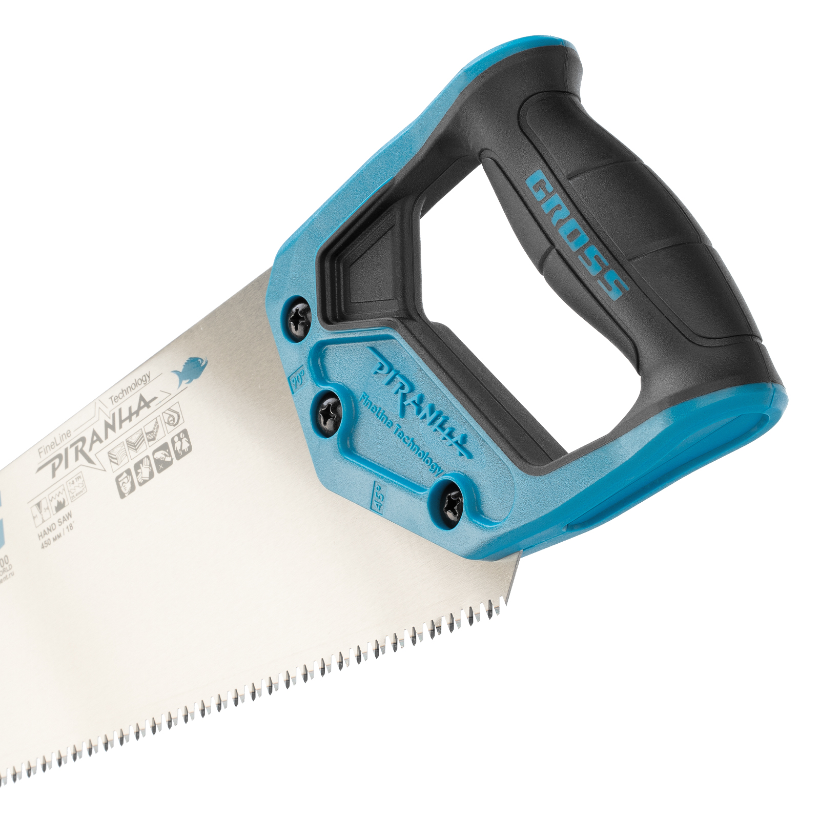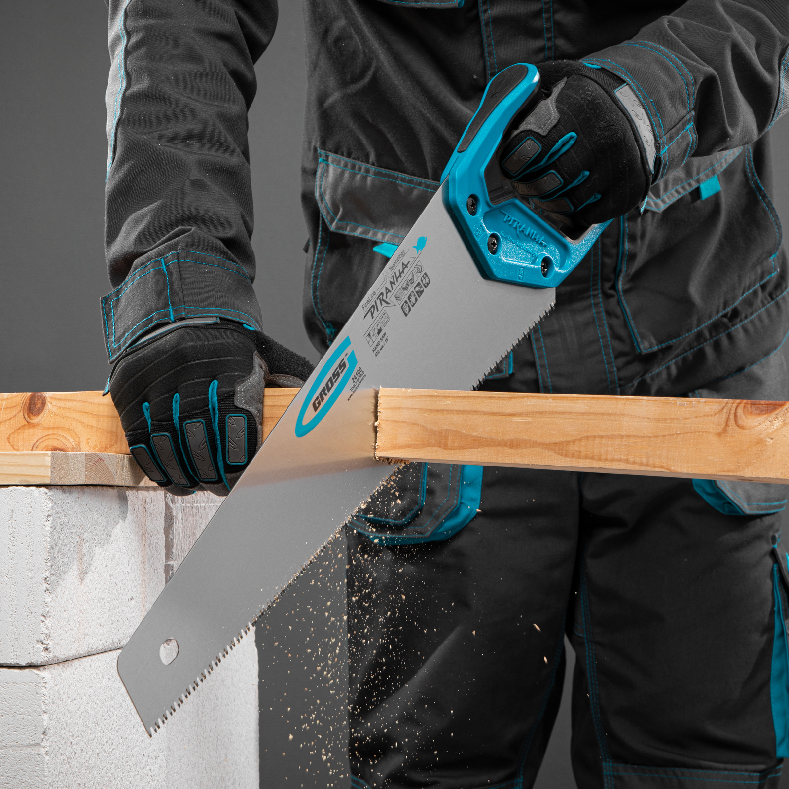 Ножовка по дереву Gross PIRANHA 24100 с полотном длиной 450 мм, калеными зубьями с 3D-заточкой и шагом 7-8 TPI, 2-компонентной рукояткой, используется для распиливания древесины, МДФ, ДСП, ДВП, ламината, а также пенополистирола, полиуретана и других пластических материалов. Подходит для продольного и поперечного пиления. Зубья имеют универсальный шаг 7-8 TPI, поэтому ножовка подходит для решения широкого спектра задач. Трехгранная заточка зубьев обеспечивает максимальную производительность и высокое качество пиления. Ножовка предназначена для столярных и плотницких работ, пригодится во время ремонта и будет полезна в быту.