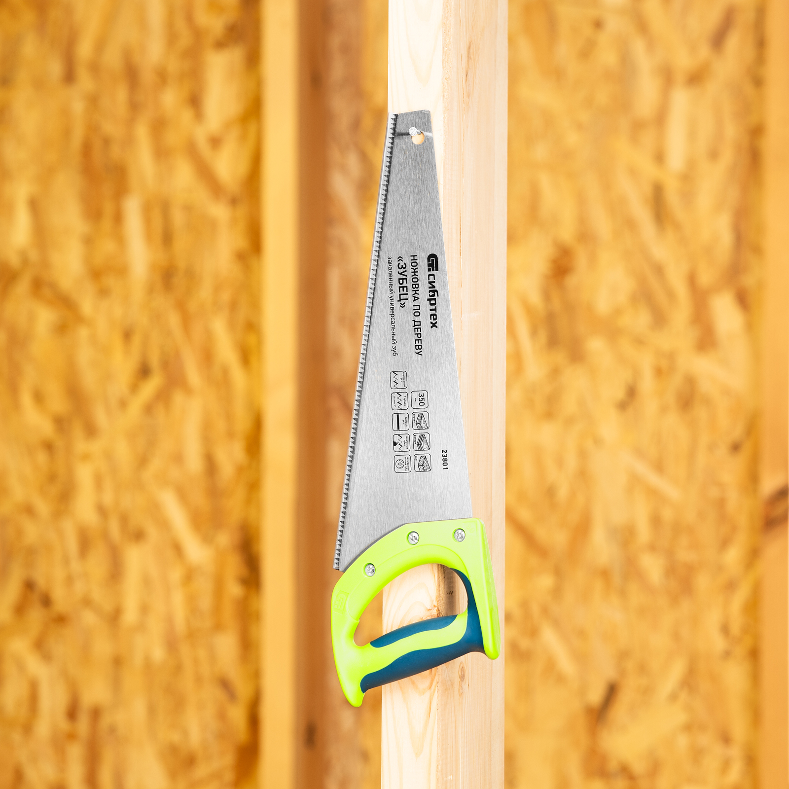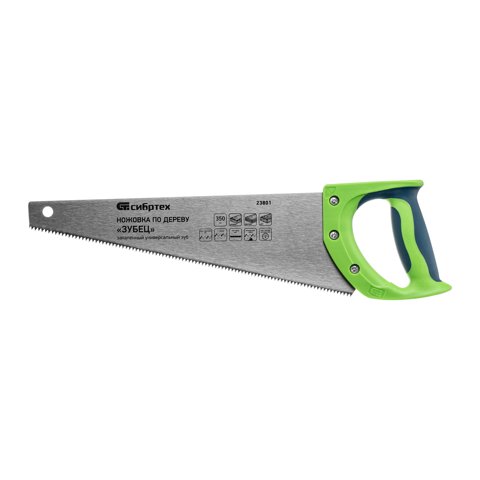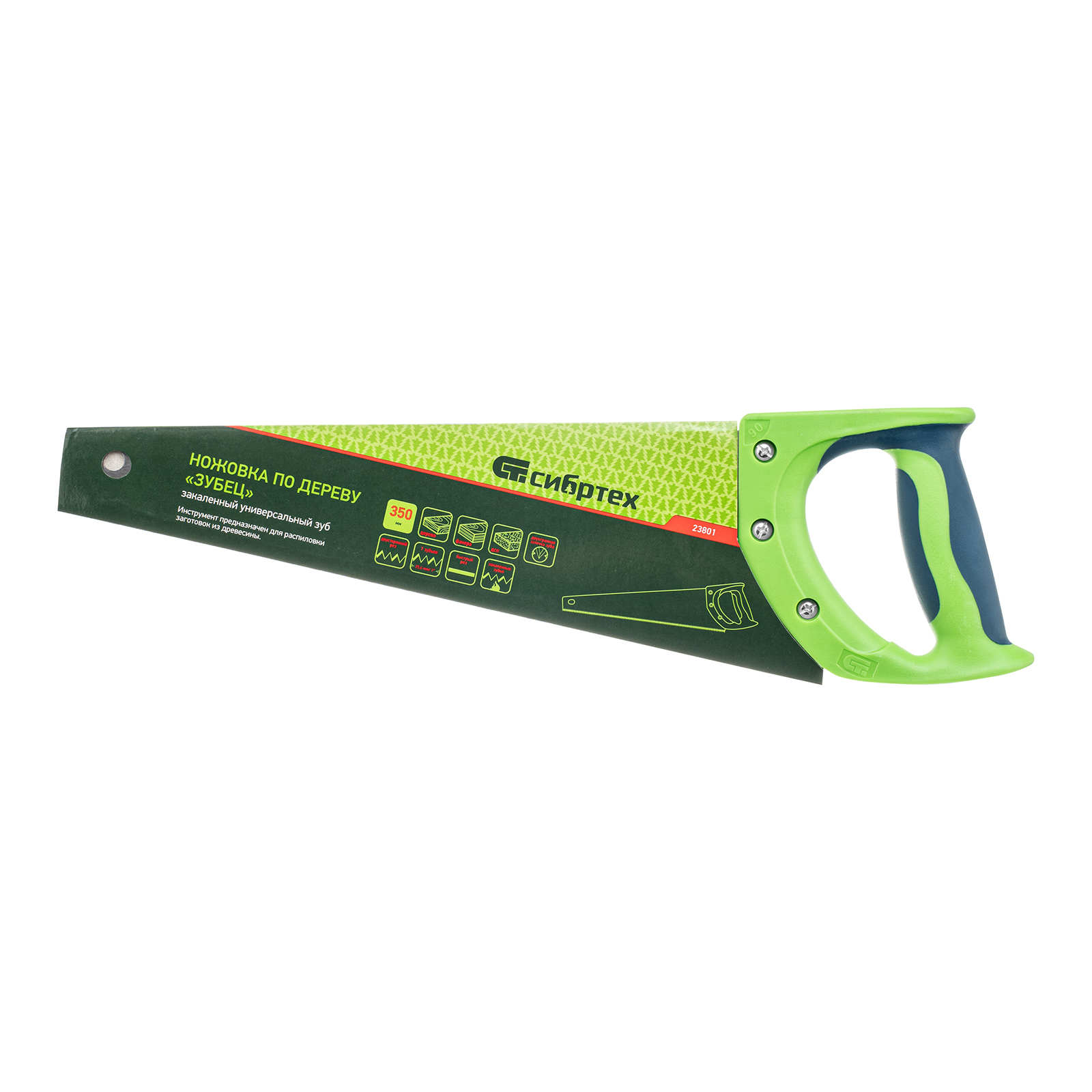 <p>Ножовка по дереву Сибртех «Зубец» 23801 с полотном длиной 350 мм, калеными зубьями с 2D-заточкой и шагом 7 TPI, с 2-компонентной рукояткой, используется для распиливания заготовок из древесины, фанеры и ДСП. Рабочая часть, содержащая 7 зубьев на дюйм, обеспечивает быстрый двусторонний рез. Режущую кромку можно перетачивать при необходимости. Ножовка будет полезна столяру, плотнику и домашнему мастеру.</p><h2>Преимущества</h2><ul><li>Прочность — полотно из пружинной стали 65Mn выдерживает значительные нагрузки.</li><li>Высокий ресурс — зубья прошли закалку до необходимой твердости.</li><li>Антикоррозийная защита — поверхность полотна покрыта лаком.</li><li>Надежная конструкция — рукоятка из ударопрочного пластика прикреплена к полотну 3 винтами.</li><li>Комфортная работа — благодаря резиновым вставкам рукоятка не выскальзывает из ладони.</li></ul>