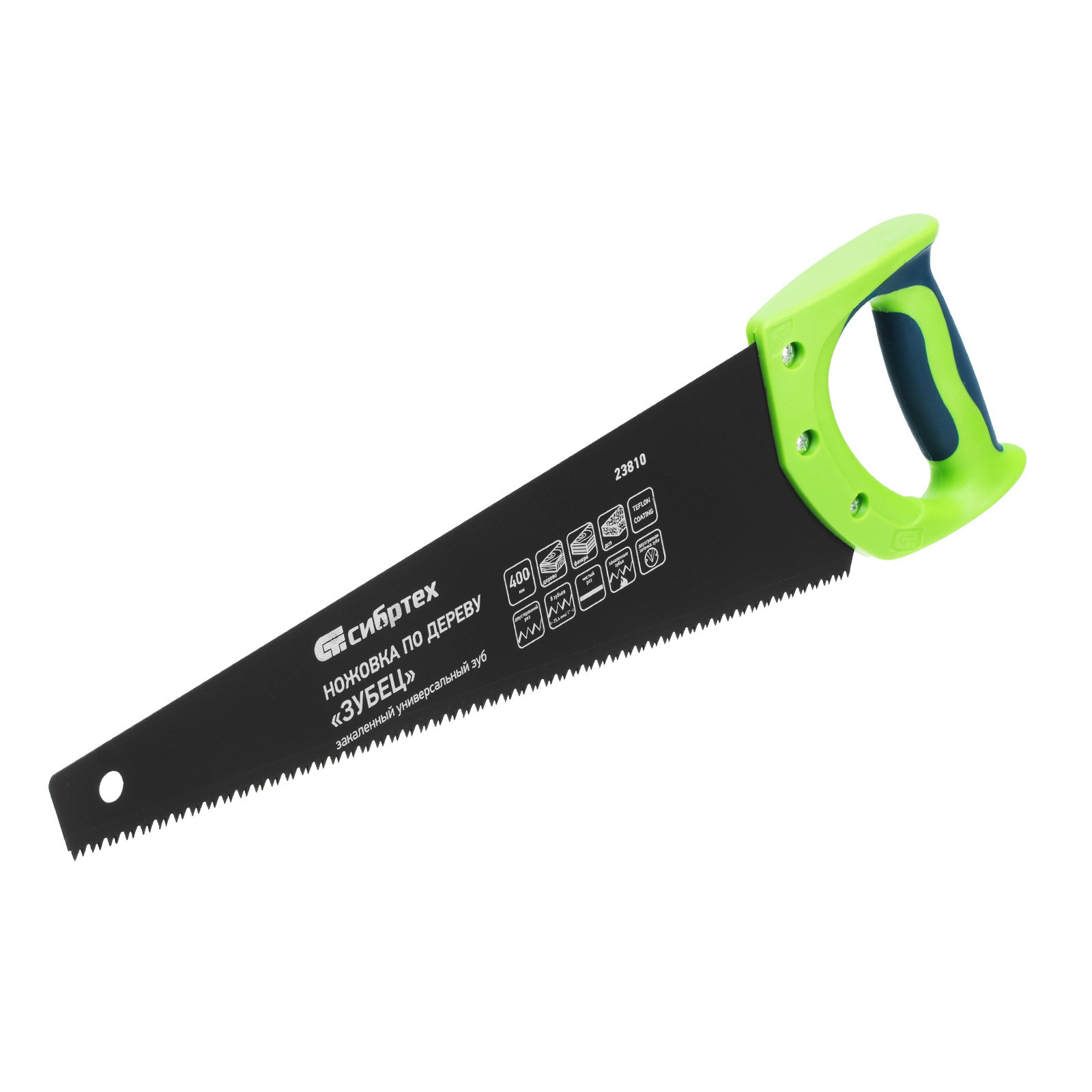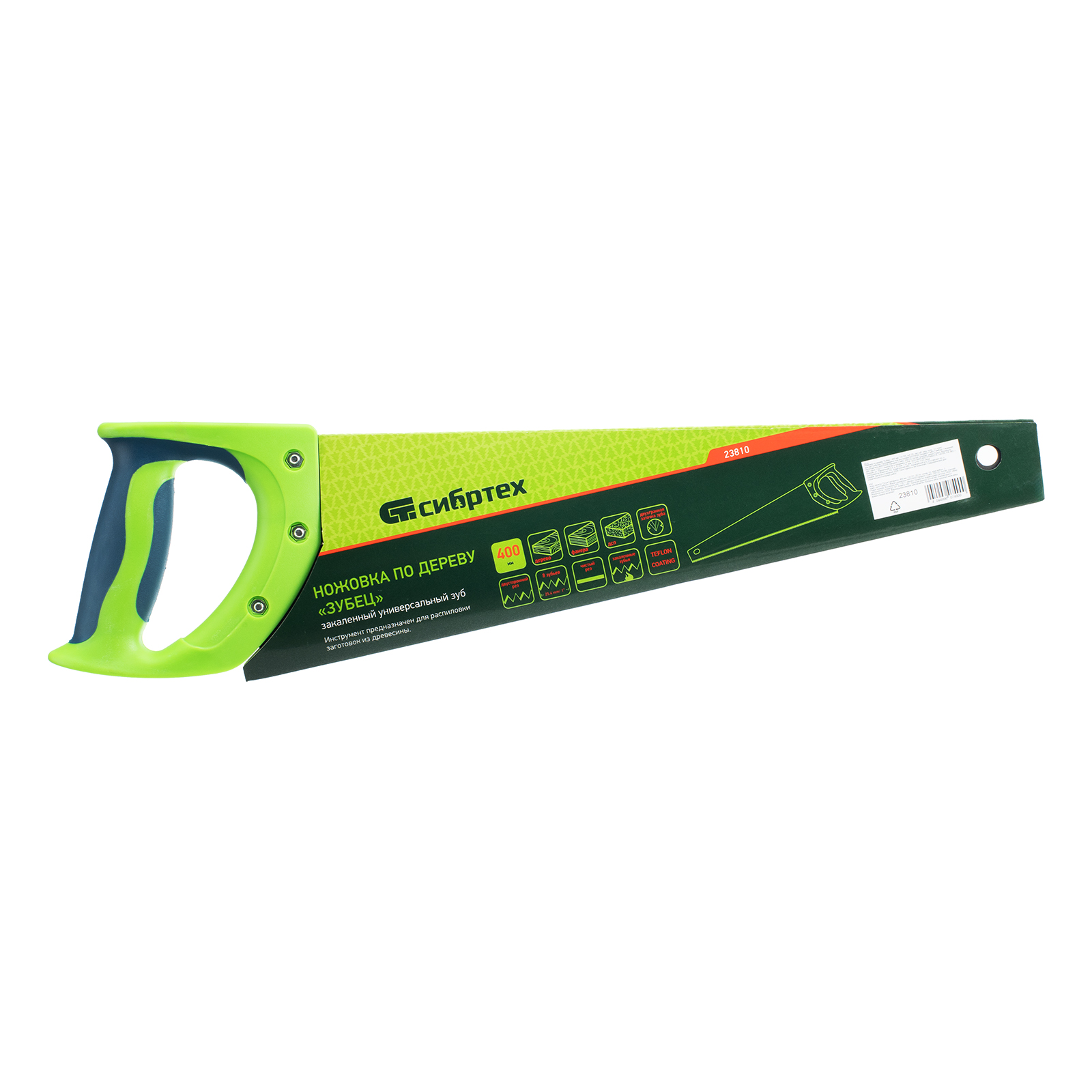 Ножовка по дереву Сибртех «Зубец» 23810 с полотном длиной 400 мм, с калеными зубьями с 2D-заточкой и шагом 7-8 TPI, с защитным покрытием и двухкомпонентной рукояткой, используется для продольного и поперечного распила заготовок из древесины, фанеры и ДСП. Подходит для двустороннего реза. Зубья с универсальным шагом 7-8 TPI обеспечивают оптимальную скорость и качество распиловки. Если режущая кромка затупится, ее можно будет заточить. Ножовка будет полезна в столярной мастерской, а также дома или на даче.