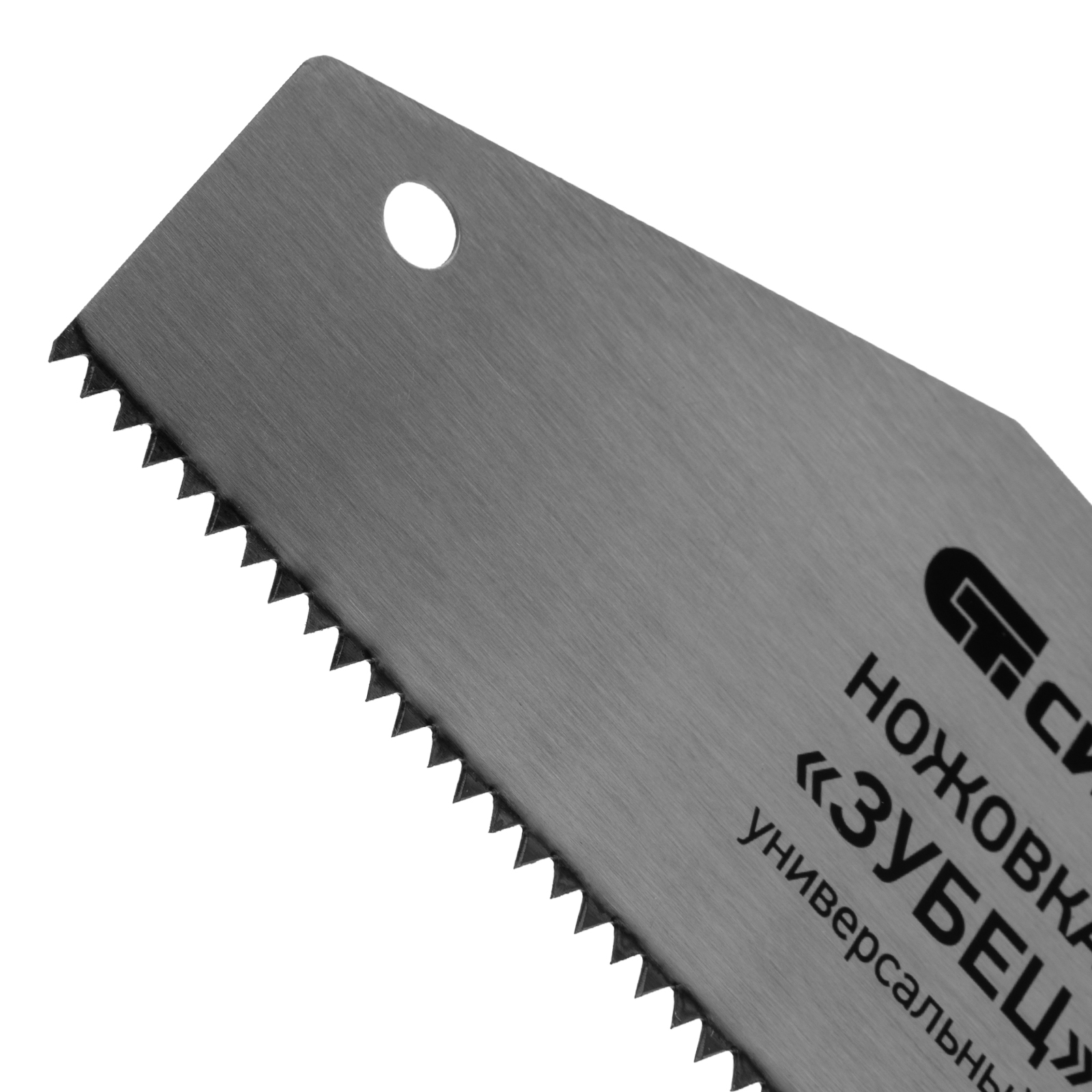 Ножовка по дереву Сибртех «Зубец» 23820 с полотном длиной 400 м, с калеными зубьями с шагом 10 мм и 2D-заточкой, с двухкомпонентной рукояткой, используется для продольного и поперечного пиления древесины и ДСП. Рабочая кромка с шагом зубьев 10 мм обеспечивает быстрый двусторонний рез. Возможна заточка режущей части при необходимости. Ножовка применяется для выполнения плотницких работ, пригодится также и в быту.
