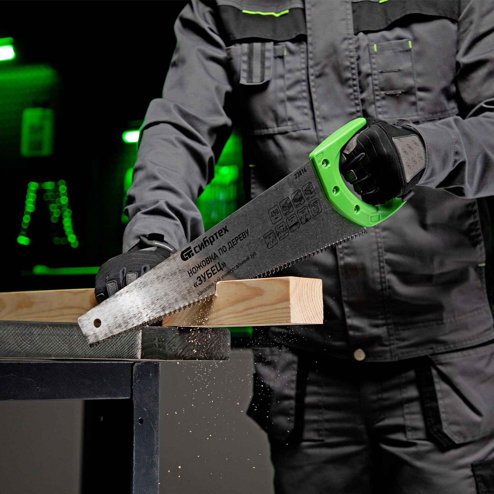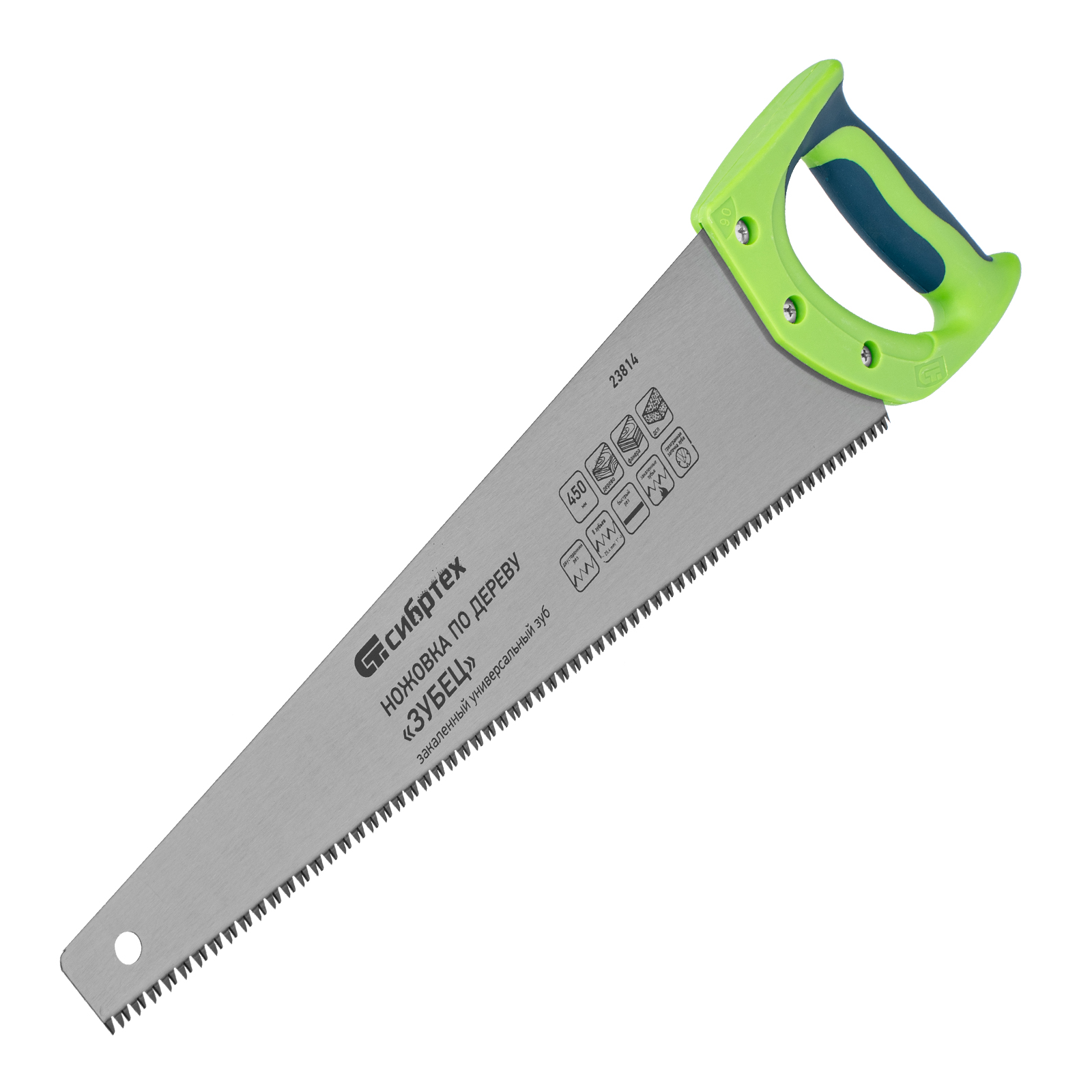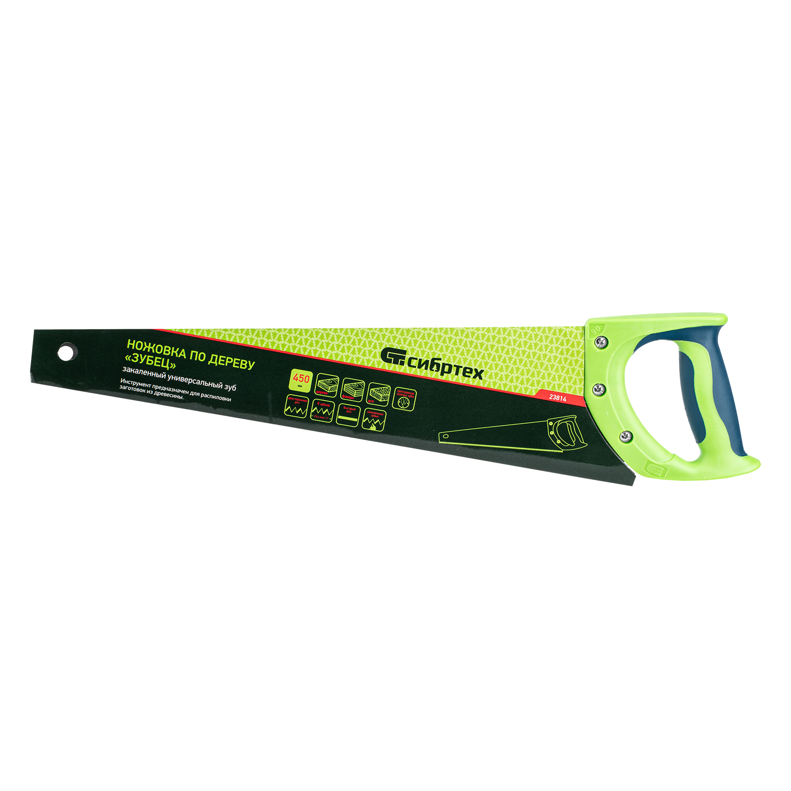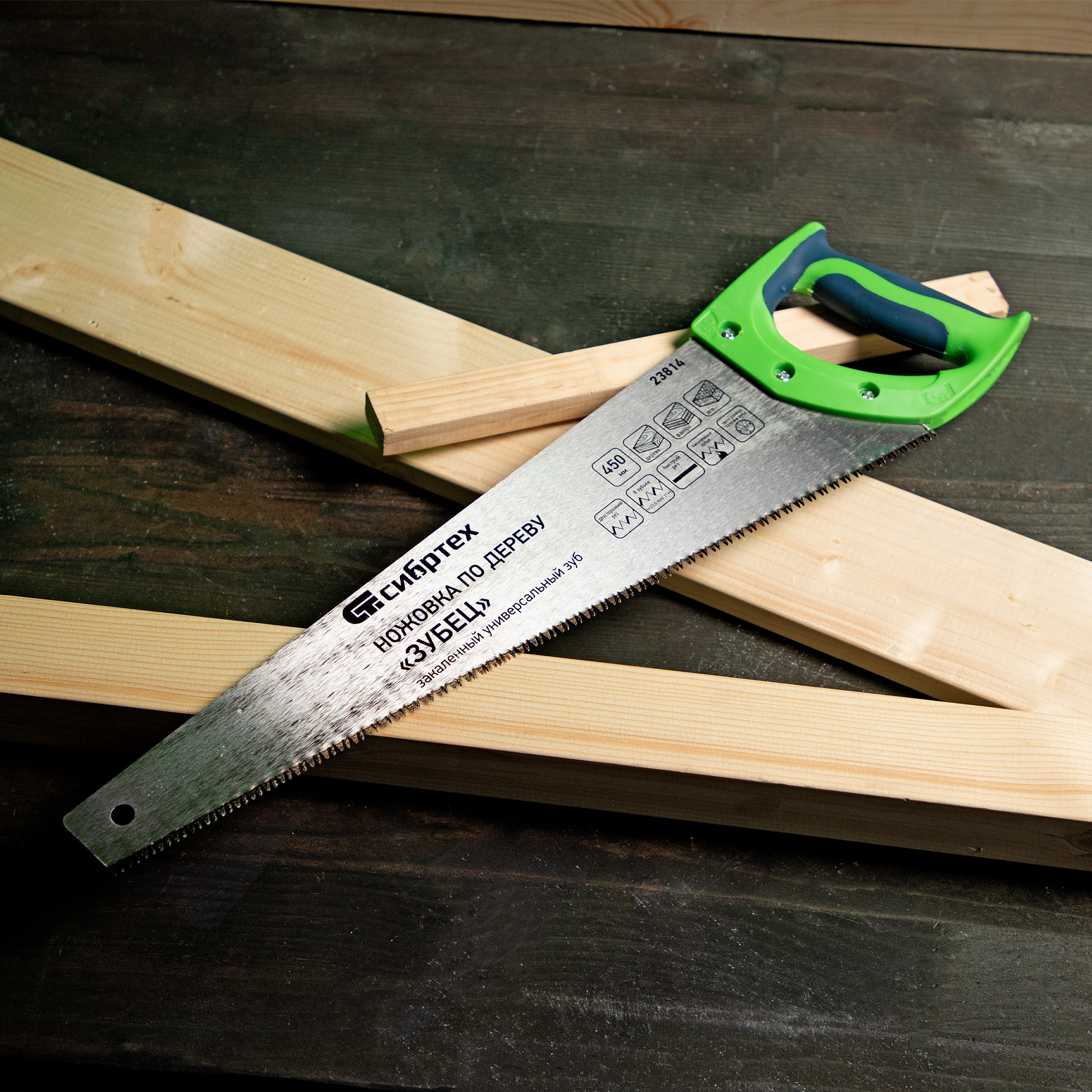 Ножовка Сибртех по дереву «Зубец» 23814 с полотном длиной 450 мм, с калеными зубьями с 3D-заточкой и шагом 7-8 TPI, с двухкомпонентной рукояткой, предназначена для продольной и поперечной распиловки древесины, фанеры и ДСП. Инструмент обладает высокой производительностью благодаря зубьям с универсальным шагом 7-8 TPI и трехгранной заточке. Ножовка используется для выполнения столярных и плотницких работ, будет полезна в быту.