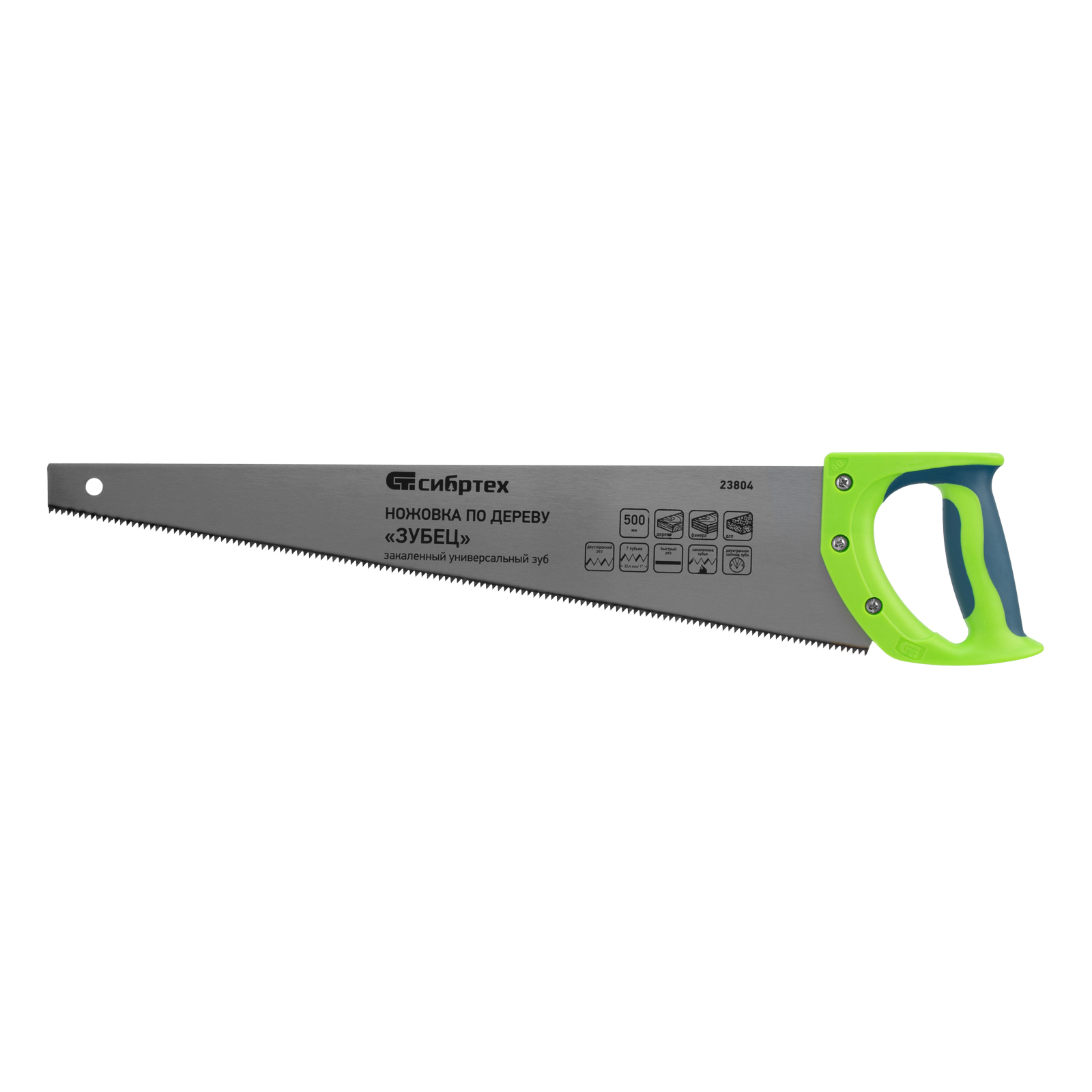 <p>Ножовка по дереву Сибртех «Зубец» 23804 с полотном длиной 500 мм, калеными зубьями с 2D-заточкой и шагом 7-8 TPI, с двухкомпонентной рукояткой, используется для распиливания заготовок из древесины, фанеры и ДСП. Рабочая часть, содержащая 7-8 зубьев на дюйм, обеспечивает быстрый двусторонний рез. Режущую кромку можно перетачивать при необходимости. Ножовка будет полезна столяру, плотнику и домашнему мастеру.</p><h2>Преимущества</h2><ul><li>Прочность — полотно из пружинной стали 65Mn выдерживает значительные нагрузки.</li><li>Высокий ресурс — зубья прошли закалку до необходимой твердости.</li><li>Антикоррозийная защита — поверхность полотна покрыта лаком.</li><li>Надежная конструкция — рукоятка из ударопрочного пластика прикреплена к полотну 3 винтами.</li><li>Комфортная работа — благодаря резиновым вставкам рукоятка не выскальзывает из ладони.</li></ul>