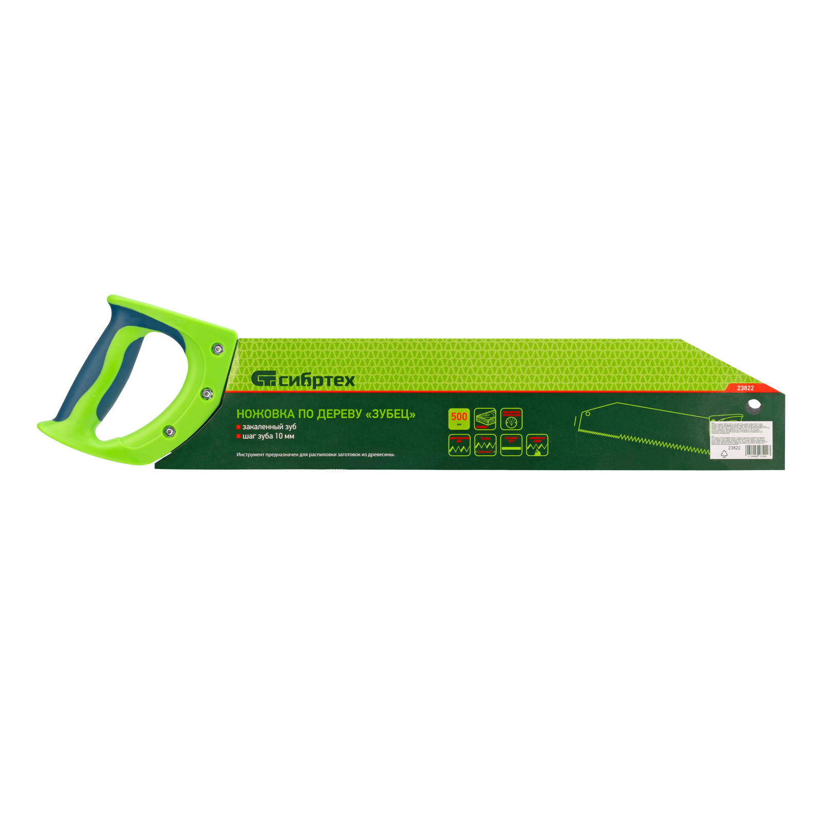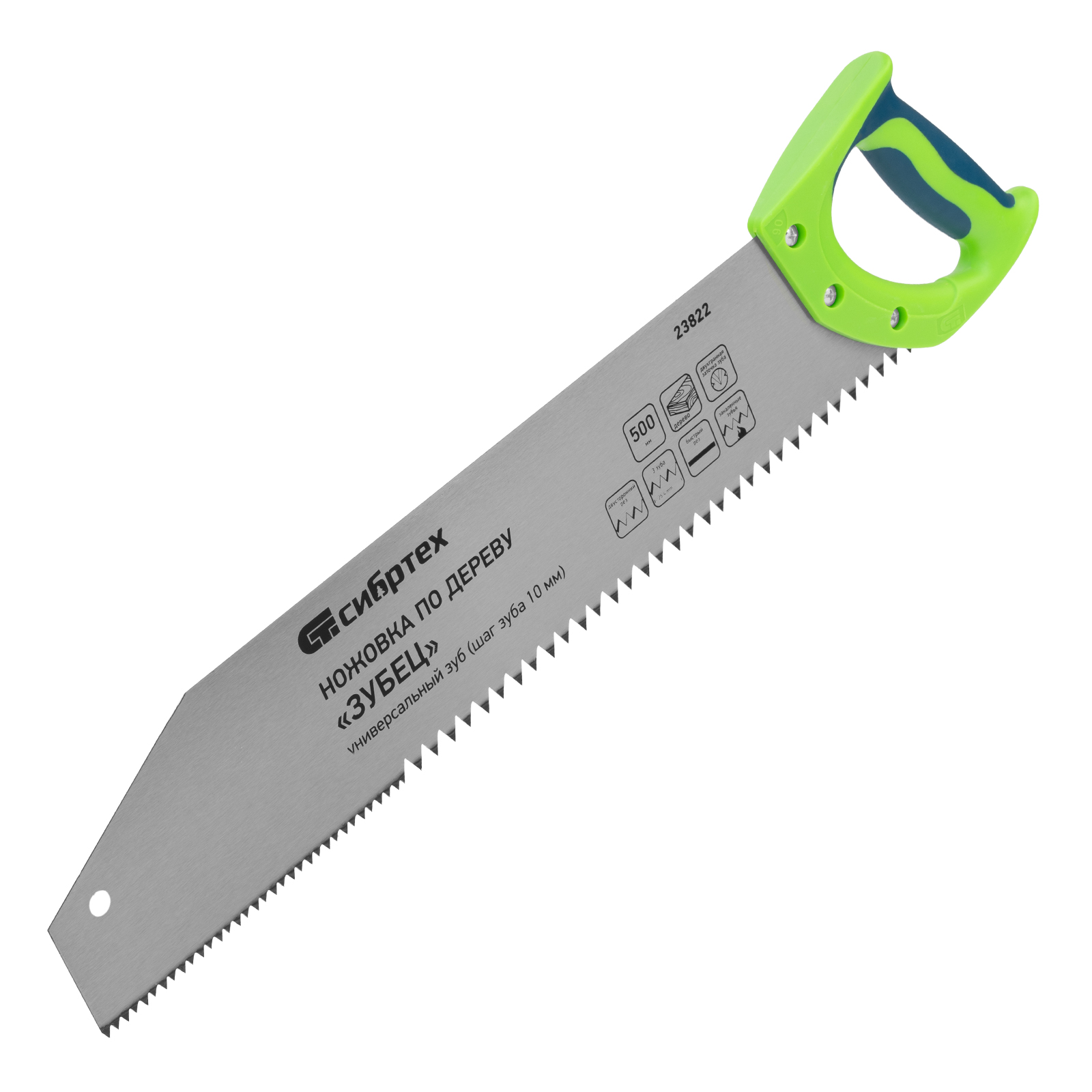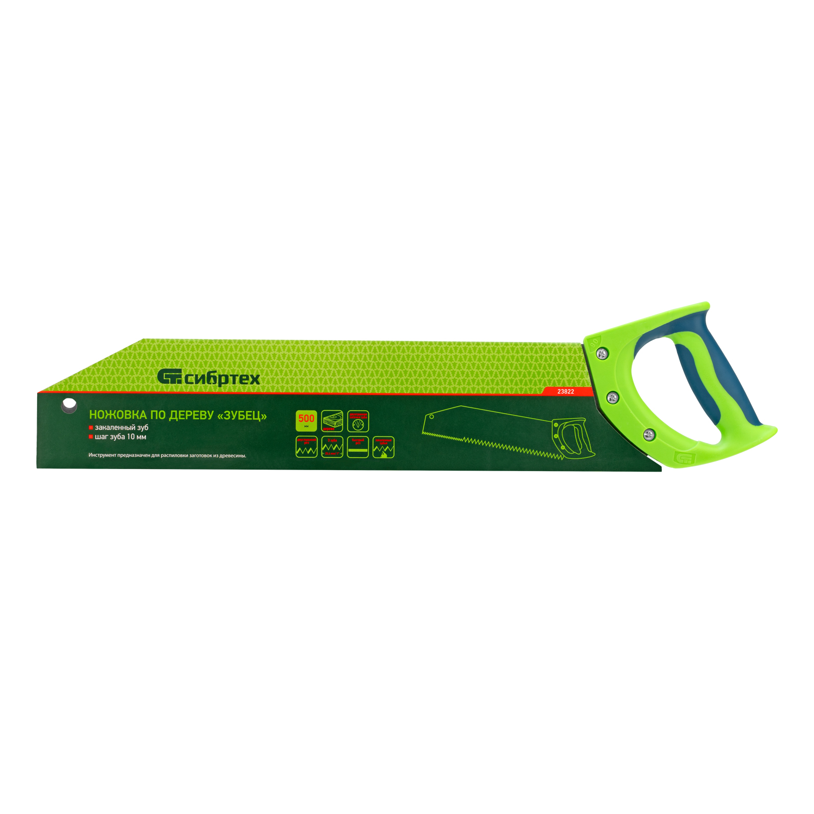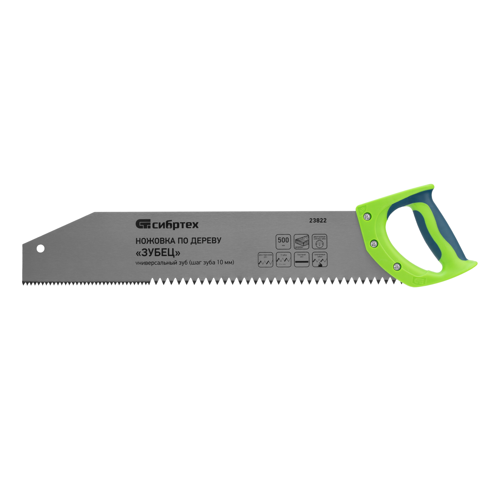 Ножовка по дереву Сибртех «Зубец» 23822 с полотном длиной 500 м, с калеными зубьями с шагом 10 мм и 2D-заточкой, с двухкомпонентной рукояткой, используется для продольного и поперечного пиления древесины и ДСП. Рабочая кромка с шагом зубьев 10 мм обеспечивает быстрый двусторонний рез. Возможна заточка режущей части при необходимости. Ножовка применяется для выполнения плотницких работ, пригодится также и в быту.