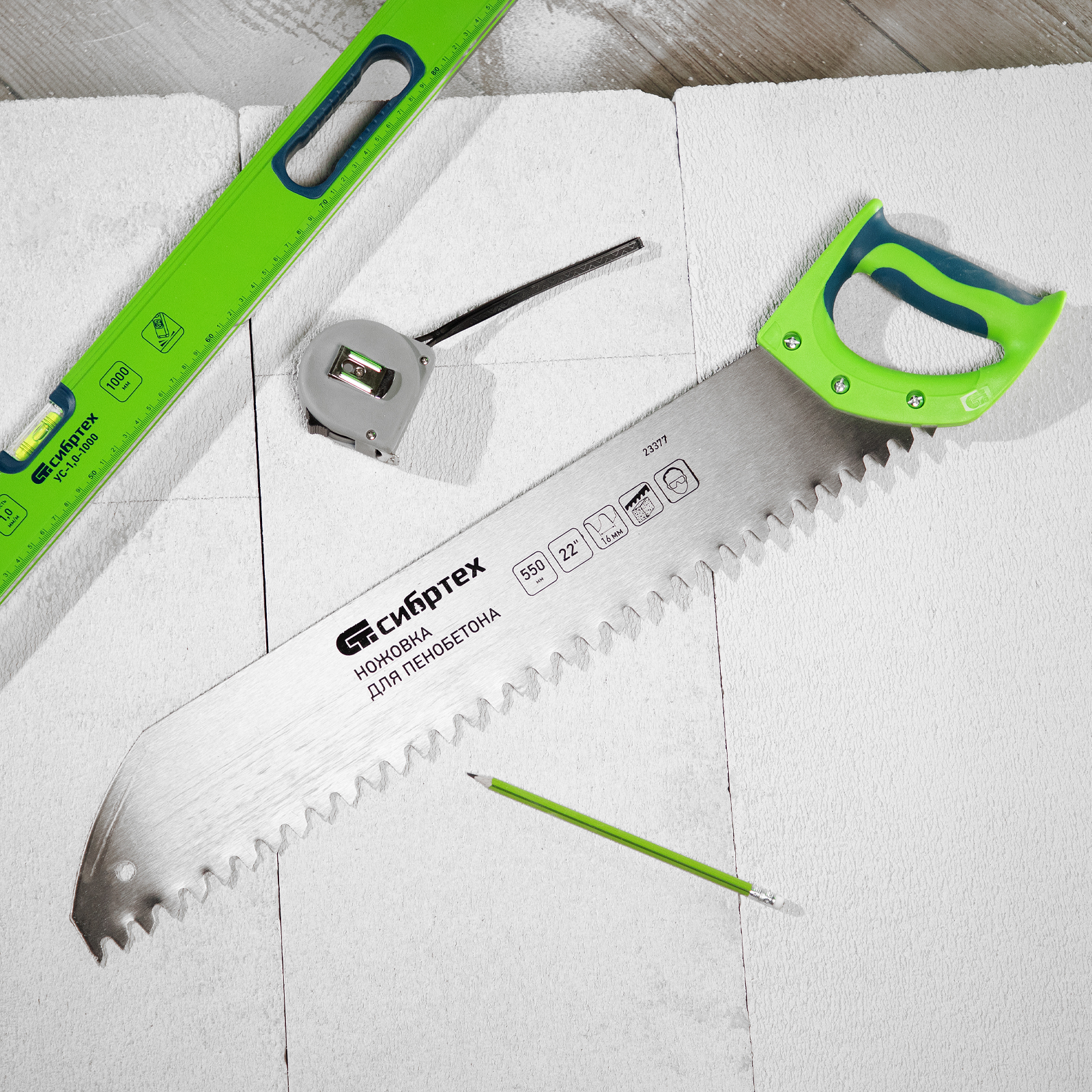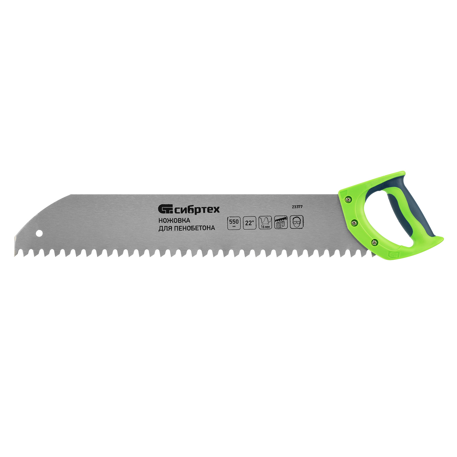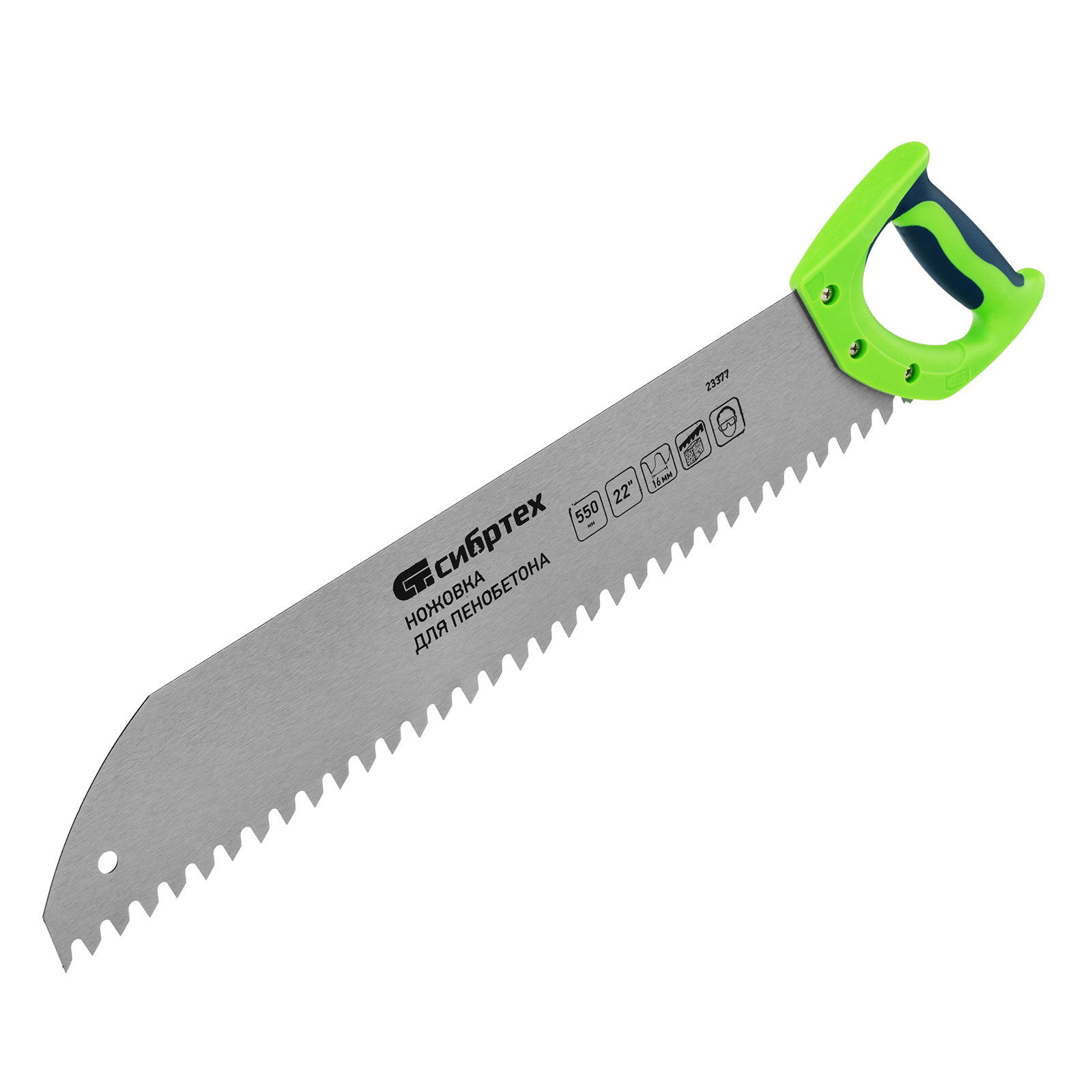 Ножовка Сибртех 23377 с полотном длиной 550 мм, с двухкомпонентной рукояткой, используется для распиливания небольших блоков из пенобетона. Высокая эффективность работы достигается благодаря крупным зубьям с шагом 16 мм и двухгранной заточкой. Ножовка применяется во время строительных работ.