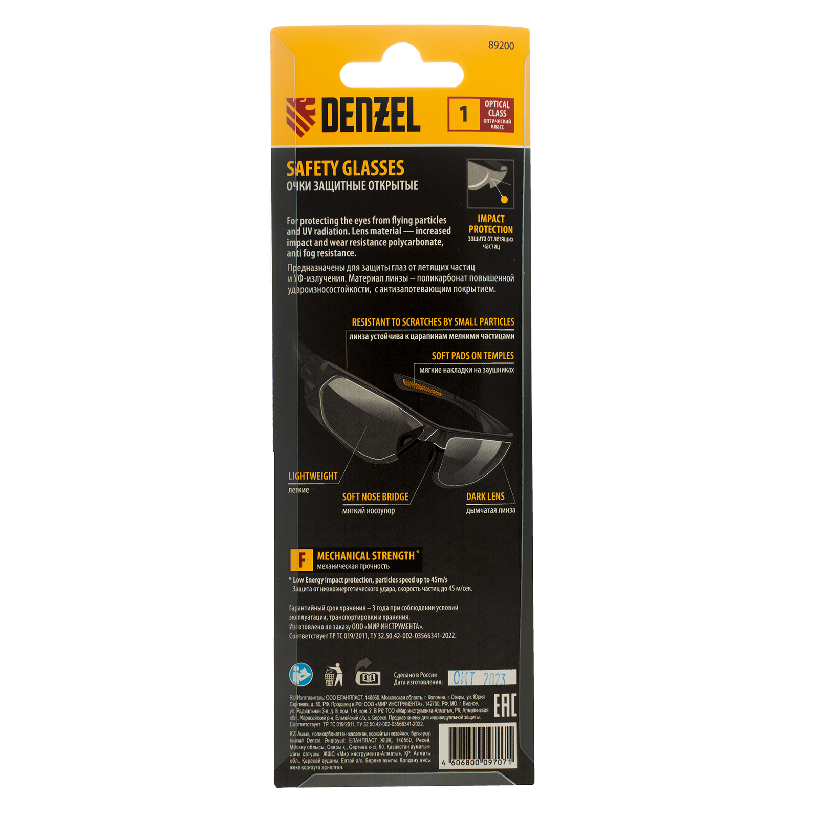 Очки защитные открытые Denzel 89200 с поликарбонатными дымчатыми линзами предназначены для защиты глаз от механических повреждений и УФ-излучения. Очкам присвоен класс механической прочности F, они обеспечивают защиту от высокоскоростных частиц с низкоэнергетическим ударом (скорость частиц до 45 м/с). Легкие универсальные очки используются во время работы с электро- и бензоинструментом, на производстве и в быту.