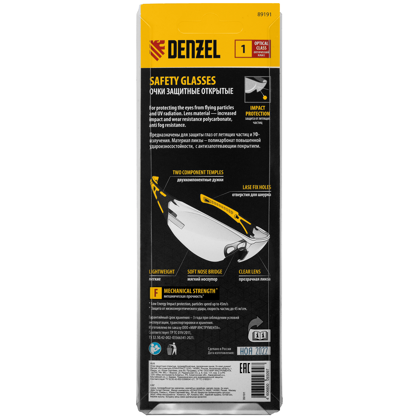 Легкие универсальные защитные очки открытого типа Denzel 89191 с поликарбонатными прозрачными линзами и 2-компонентными дужками предназначены для защиты глаз от механических повреждений и УФ-излучения. Очкам присвоен класс механической прочности F, они обеспечивают защиту от высокоскоростных частиц с низкоэнергетическим ударом V=45 м/с. Очки используются во время работы с электро- и бензоинструментом, на производстве и в быту.