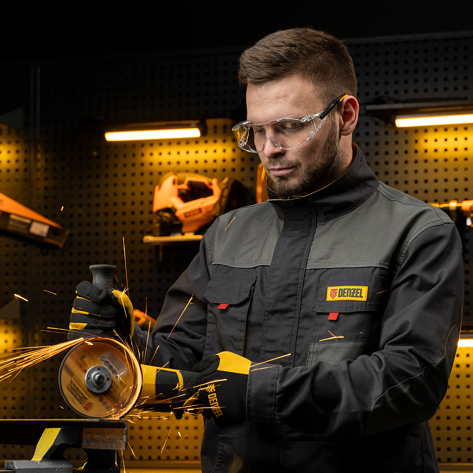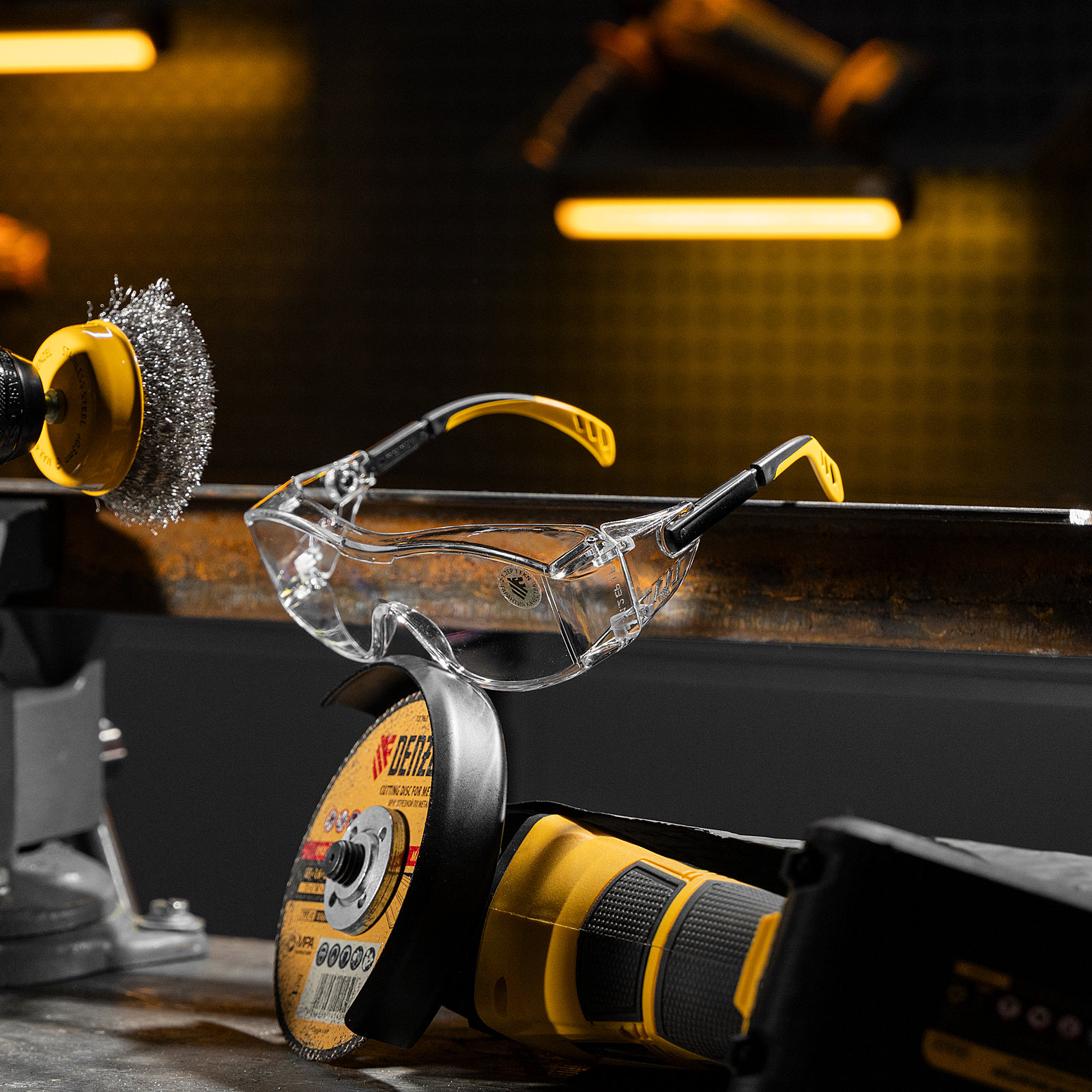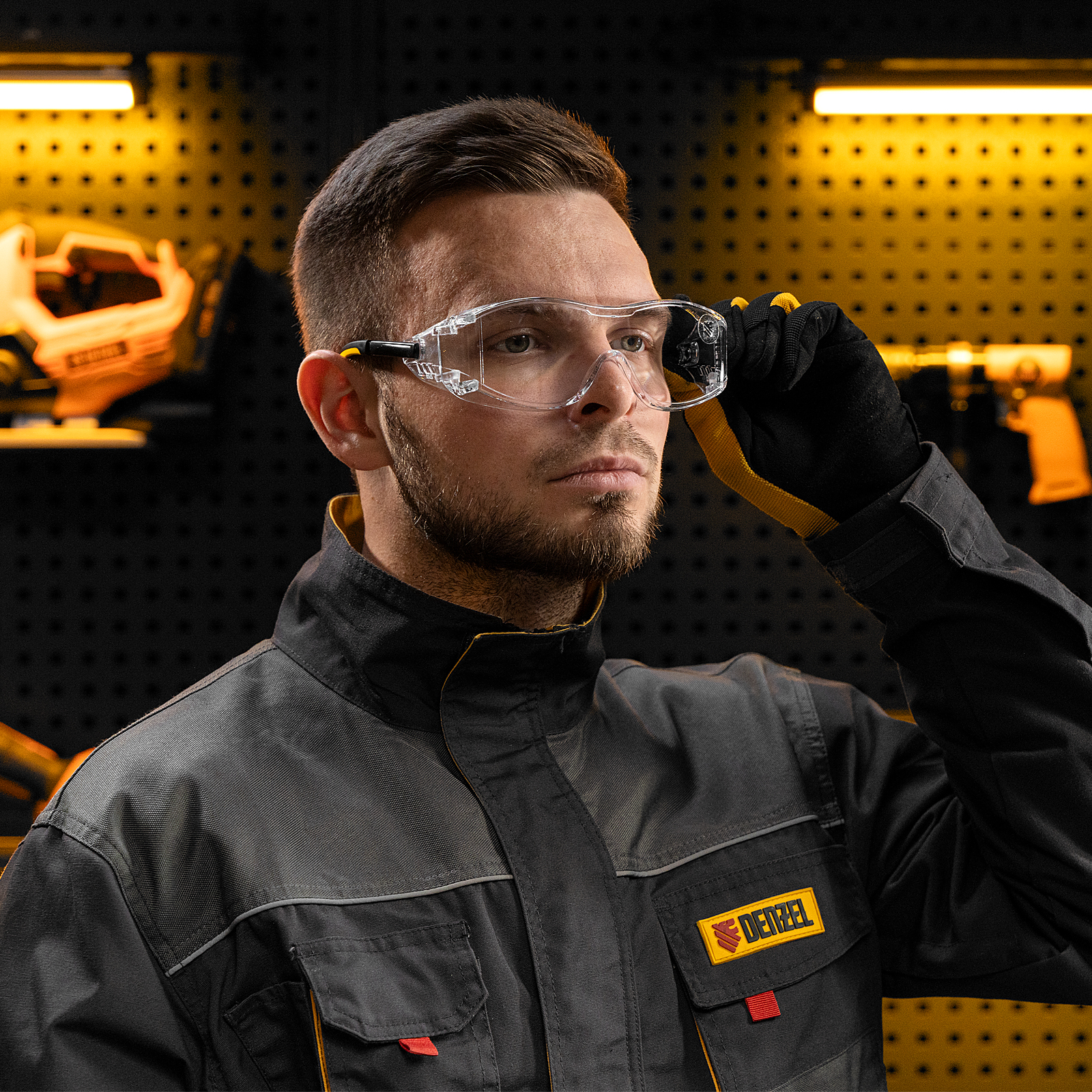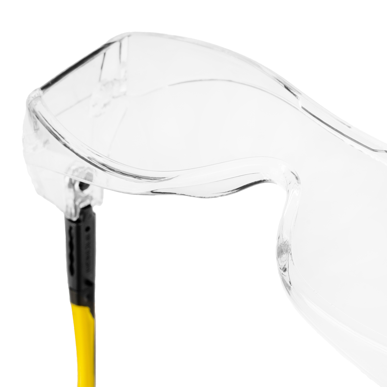 - Продуманная конструкция — особая форма линз обеспечивает боковую и надбровную защиту, а также позволяет носить защитные очки вместе с коррригирующими.