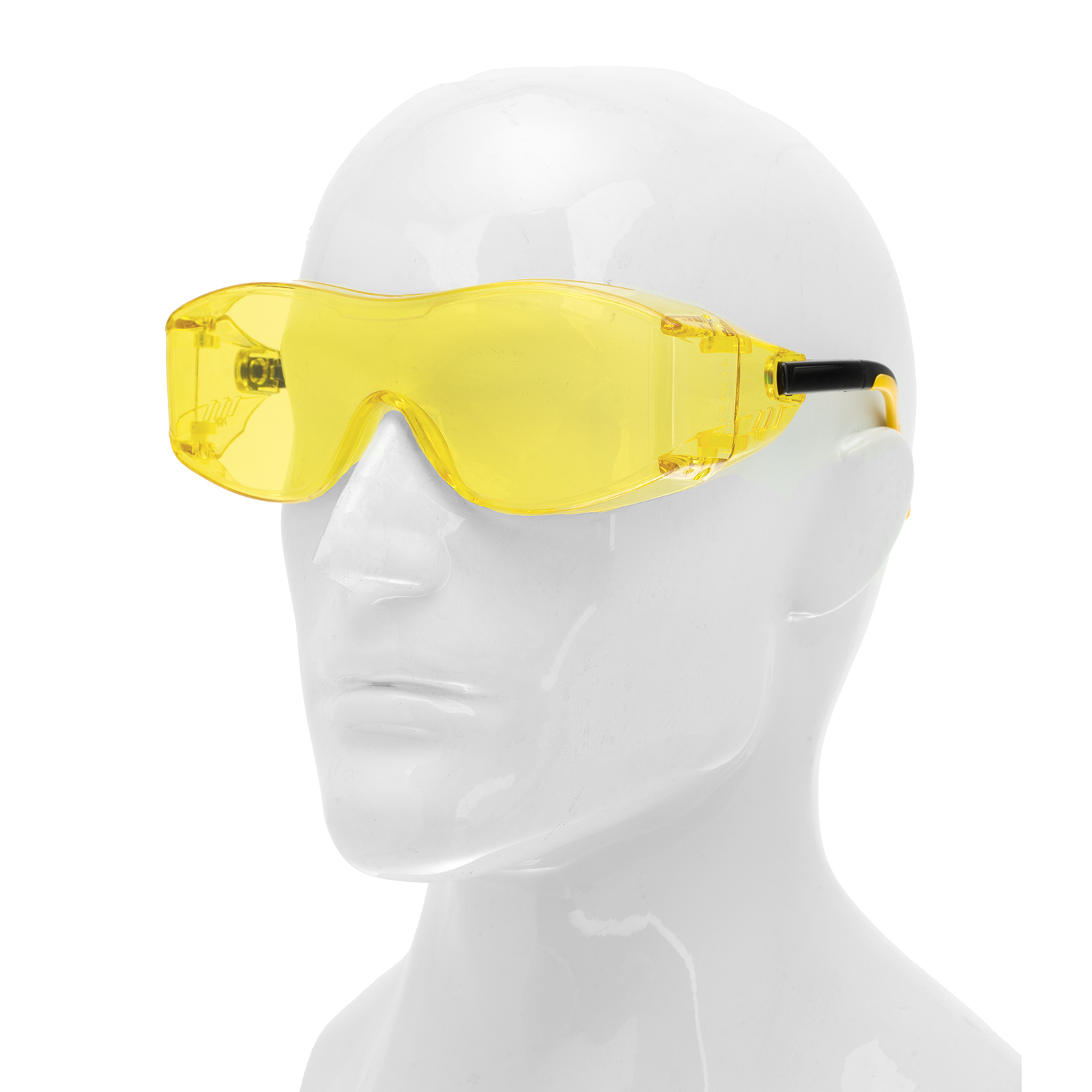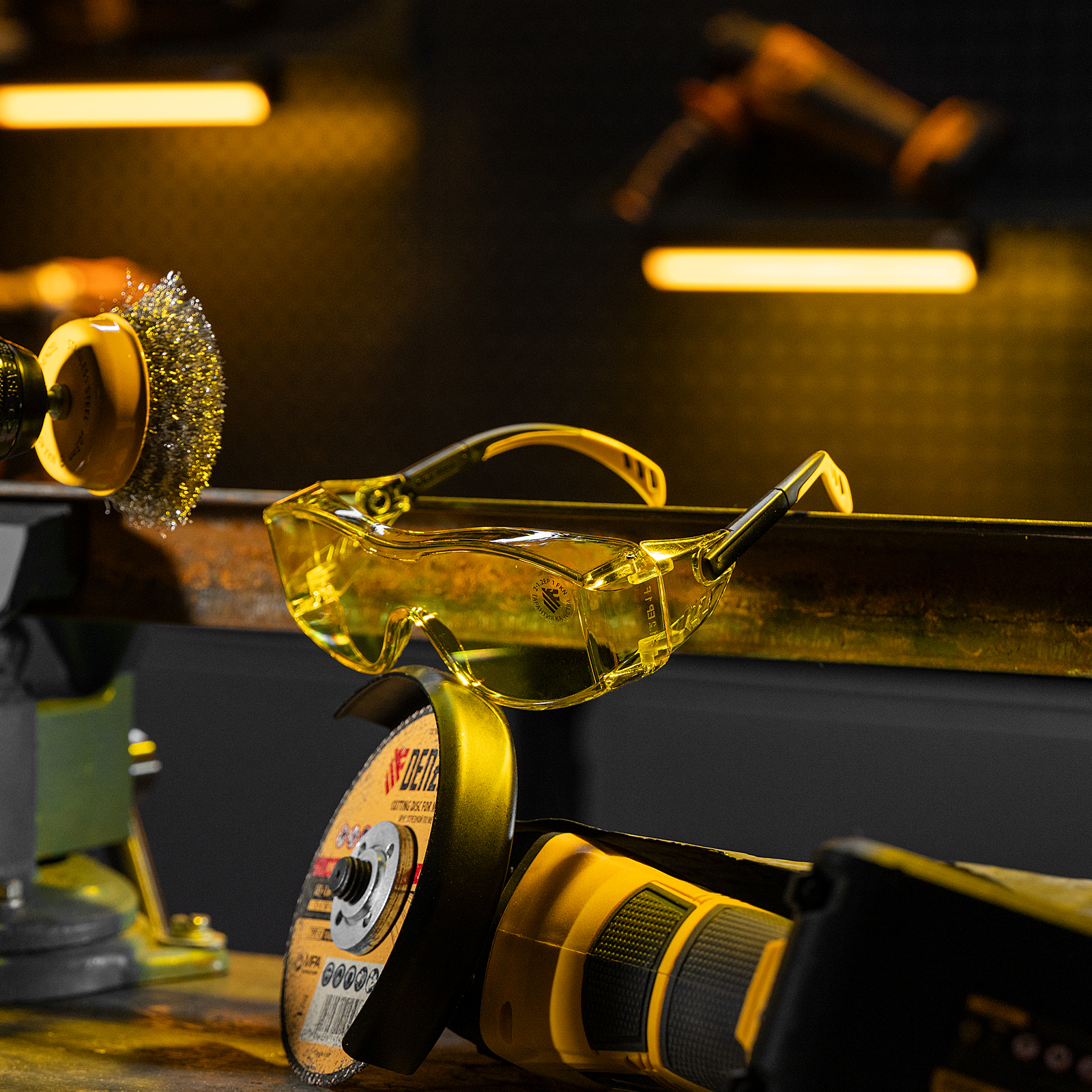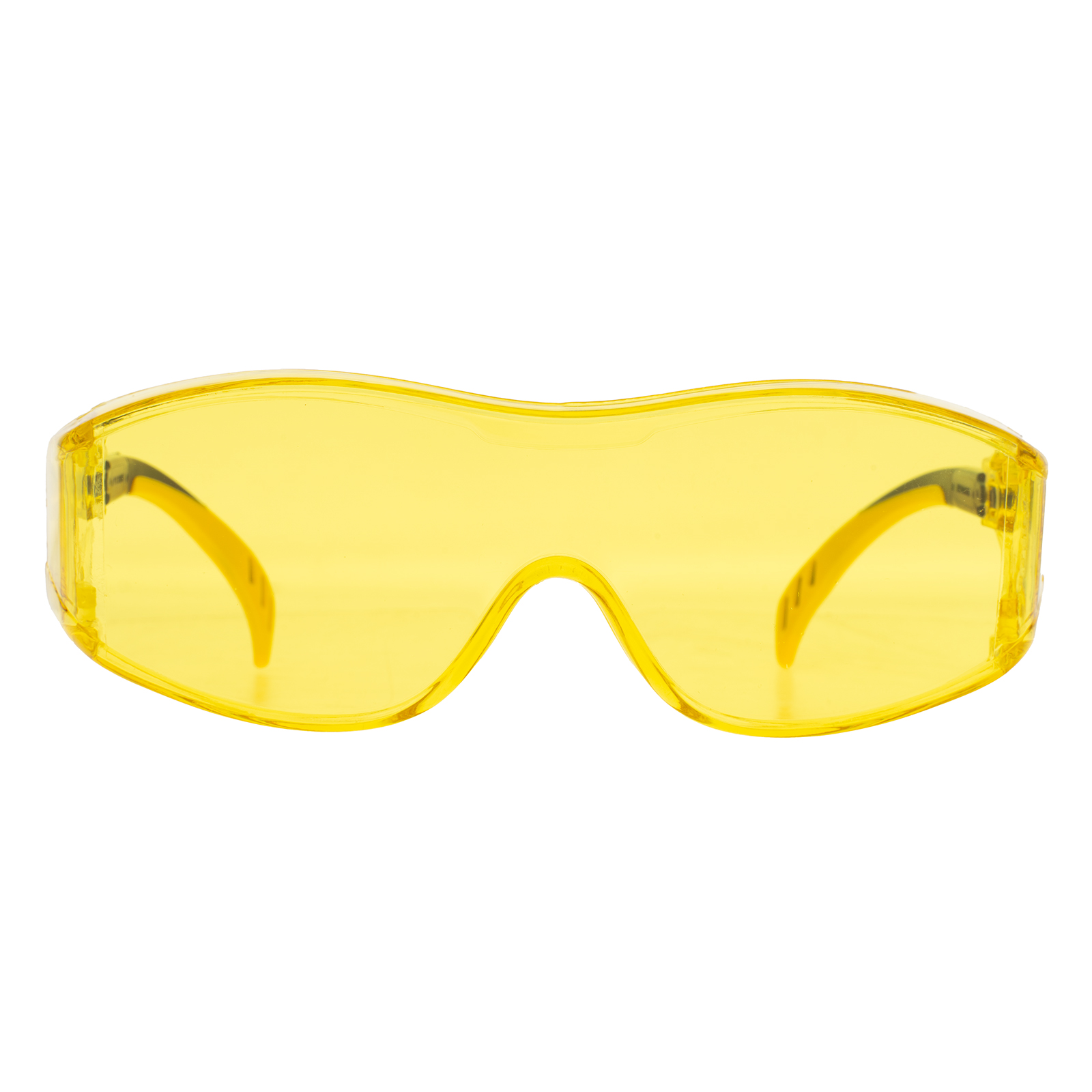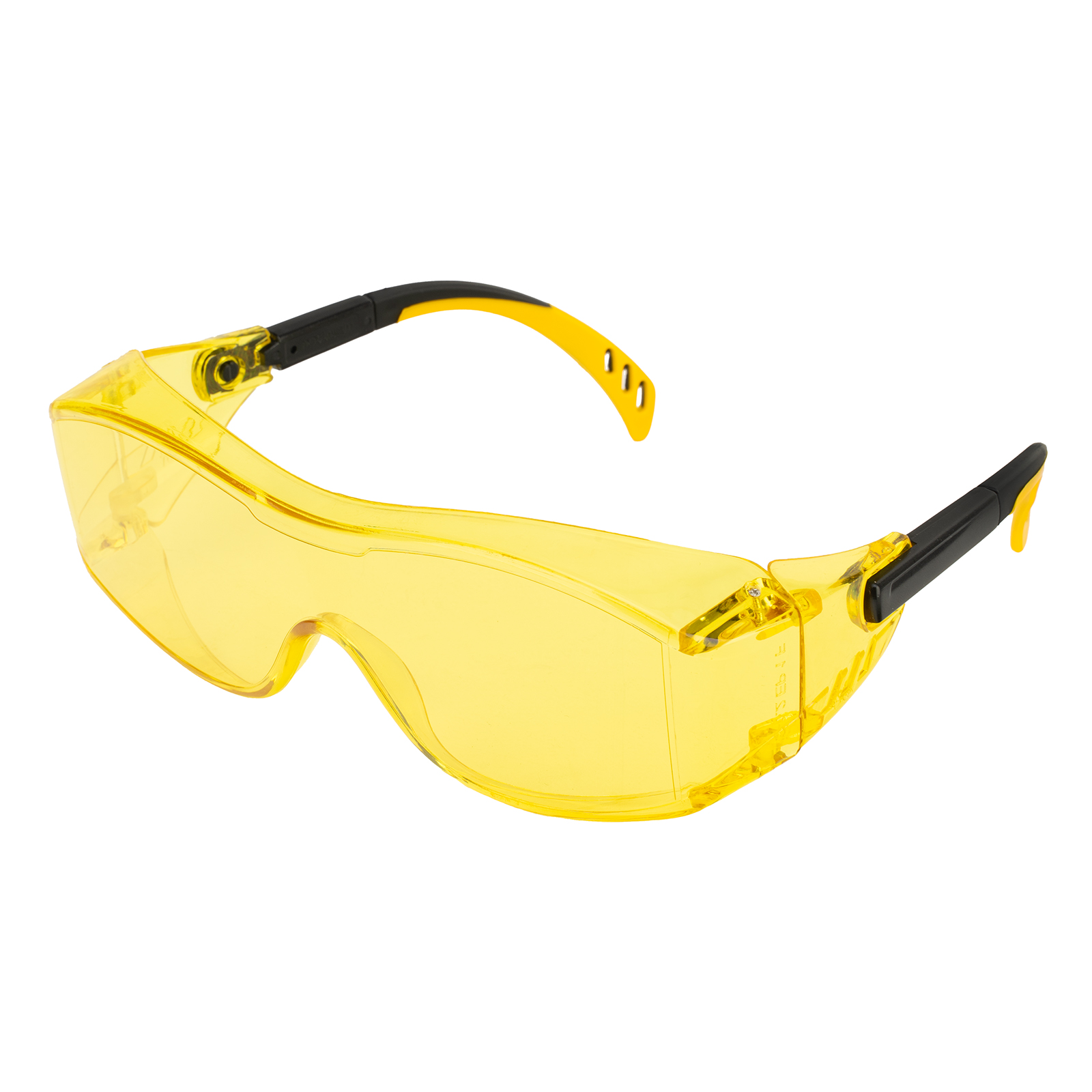 - Продуманная конструкция — особая форма линз обеспечивает боковую и надбровную защиту, а также позволяет носить защитные очки вместе с коррригирующими.