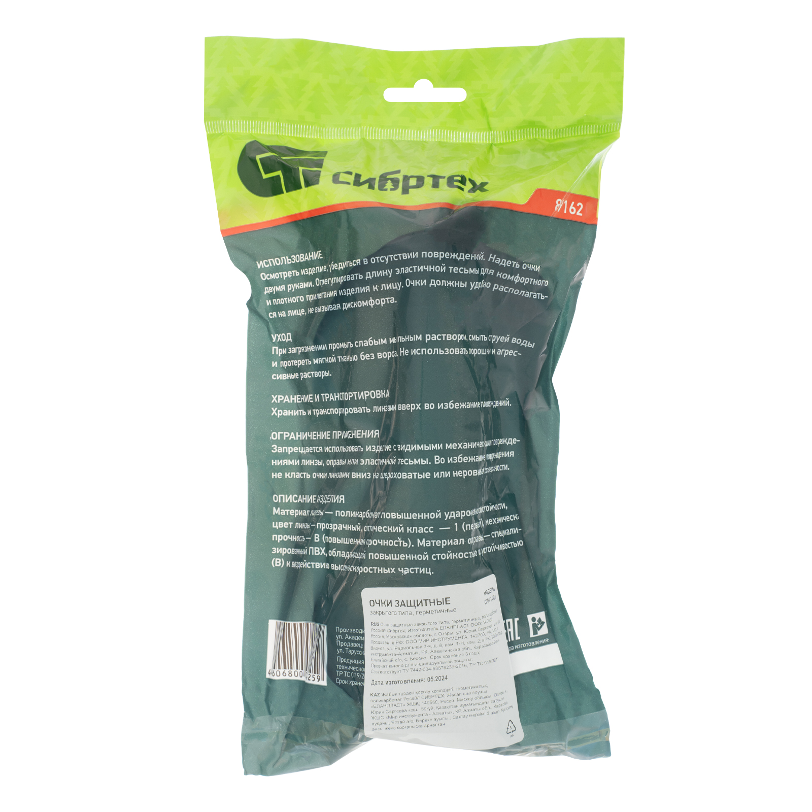 Защитные очки закрытого типа Сибртех 89162, герметичные, из поликарбоната, со всех сторон защищают глаза от попадания пыли, механического повреждения твердыми частицами, а также от разъедания газами, парами и жидкостями. Очки плотно прилегают к лицу благодаря обтюратору анатомической формы. Цельный корпус изготовлен из материала, не боящегося возгорания, что обеспечивает высокую степень защиты. Очки используются на производственных предприятиях, строительной площадке, в слесарной или столярной мастерской, а также будут полезны дома или в гараже.