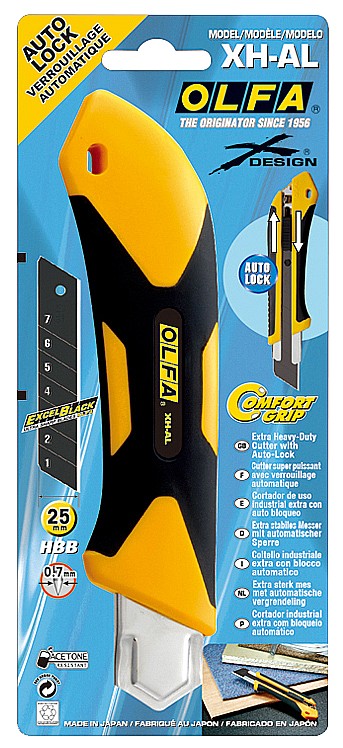 В серию OLFA X-design ComfortGrip был добавлен сверхпрочный нож XH-AL с системой фиксации лезвия Auto-Lock. Корпус инструмента изготовлен из армированного фибергласса, что делает его легким, но очень прочным. Увеличенная рукоятка позволяет резать даже твердые материалы, а противоскользящие резиновые накладки по периметру обеспечивают максимальный контроль над резом.