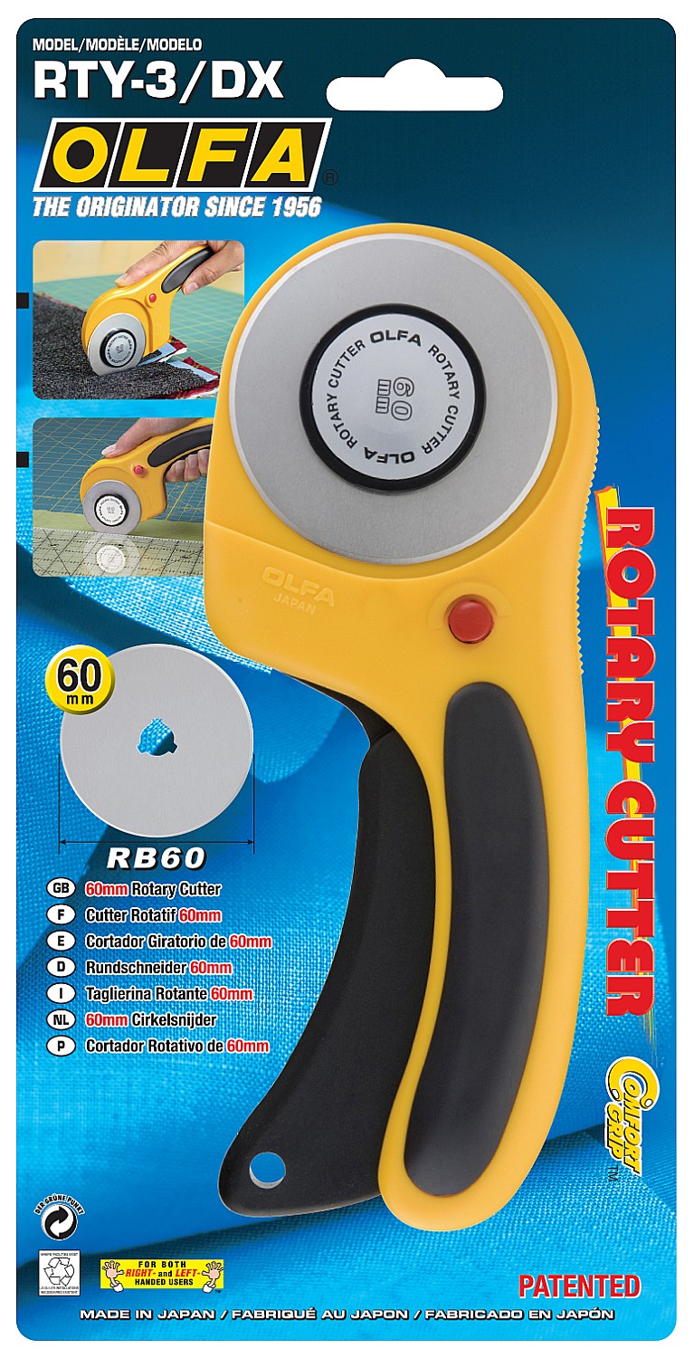 Эргономичный круговой нож OLFA RTY-3/DX может похвастаться высокой производительностью и безопасностью. Идеально подходит и для тонких, и для плотных тканей, включая флис, шерсть, кожу и т. д.