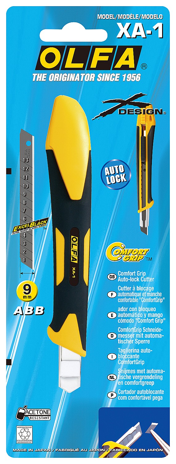 Нож OLFA XA-1 — хорошо известная и зарекомендовавшая себя модель с автоблокировкой и острым черным лезвием. Изготовлен из армированного фиберглассом полипропилена, соединенного с эластомером. Такая рукоятка более стойкая к ацетону, кислоте и повреждениям, что делает нож оптимальным для строительных и малярных работ.