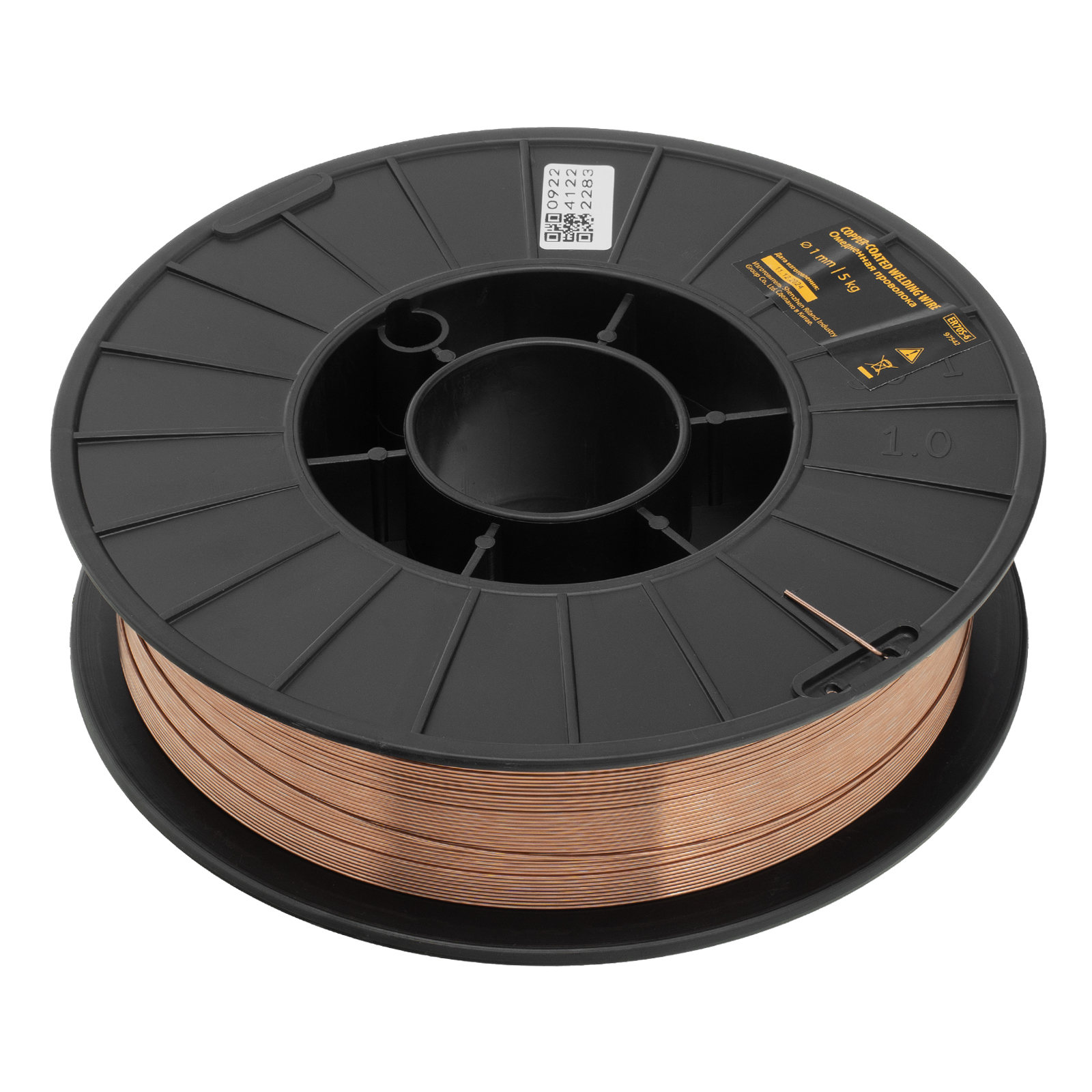 Омедненная проволока Denzel ER70S-6 97542 диаметром 1 мм и весом 5 кг, на катушке типа D200, предназначена для полуавтоматической сварки MIG/MAG углеродистых и низколегированных сталей в среде защитных газов. Необходима профессиональным сварщикам, пригодится также частному мастеру.