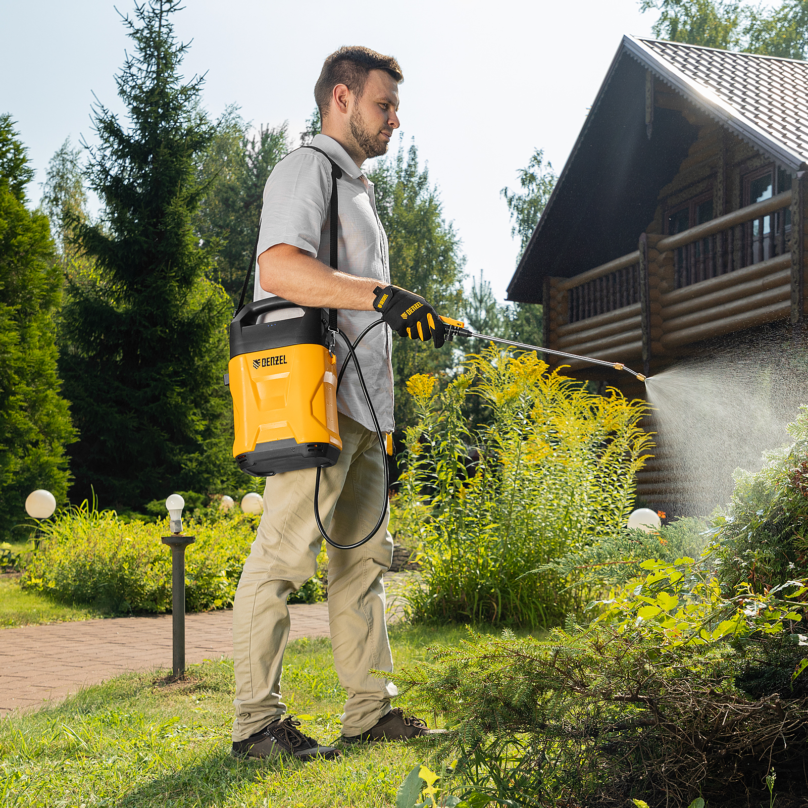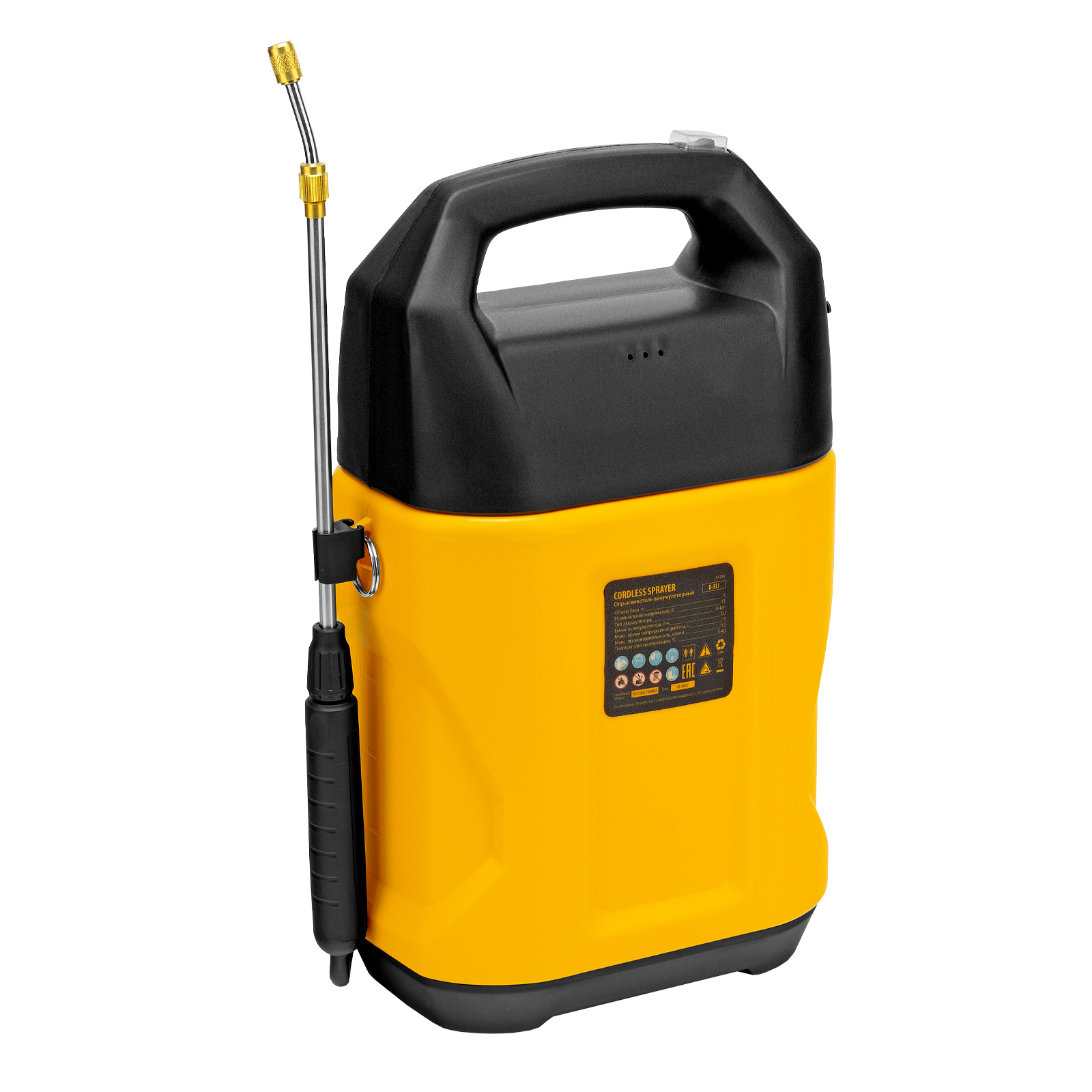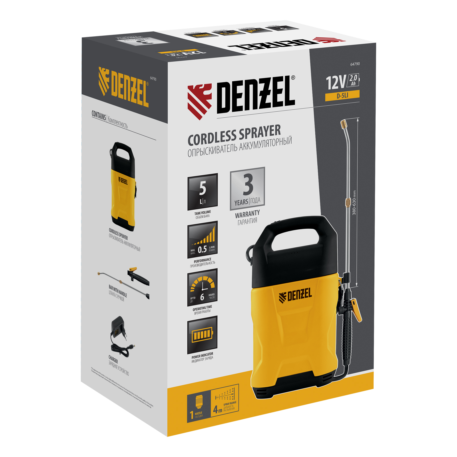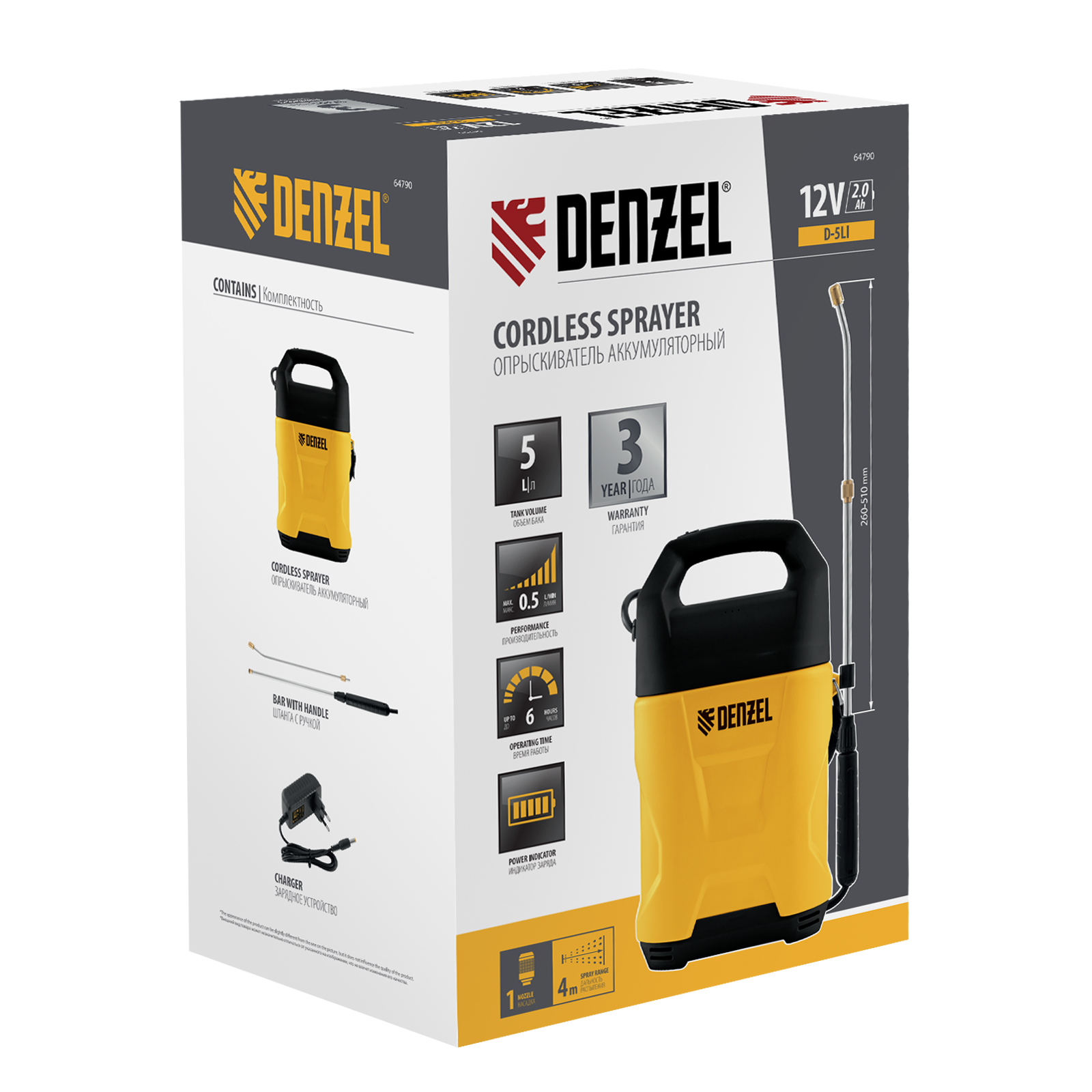Аккумуляторный опрыскиватель Denzel D-5LI 64790 с баком объемом 5 л и Li-Ion батареей на 12 В, емкостью 2 Ач, используется для ухода за растениями, а также распыления инсектицидных жидкостей, мытья окон, стен и дорожек. Длина штанги регулируется в диапазоне 260-510 мм, а максимальная дальность распыления составляет 4 м, что позволяет обрабатывать участки большой площади и труднодоступные места. Опрыскиватель экономит силы и время пользователя, будет полезен в быту и на производстве.
