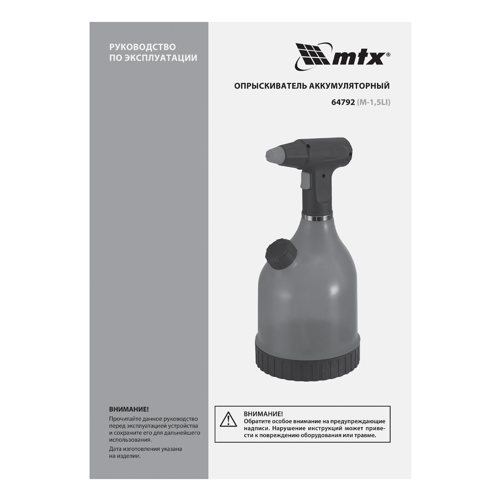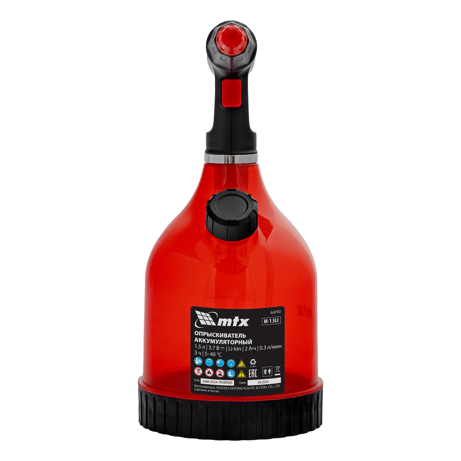 Аккумуляторный опрыскиватель MTX M-1,5LI 64792 с баком объемом 1,5 л и Li-Ion батареей на 3,7 В, емкостью 2 Ач, используется для ухода за растениями, а также распыления инсектицидных жидкостей, мытья окон, стен и дорожек. Регулировка факела распыления в сочетании с максимальной дальностью распыления 2 м позволяет обрабатывать участки различной площади и труднодоступные места. Опрыскиватель экономит силы и время пользователя, будет полезен в быту и на производстве.