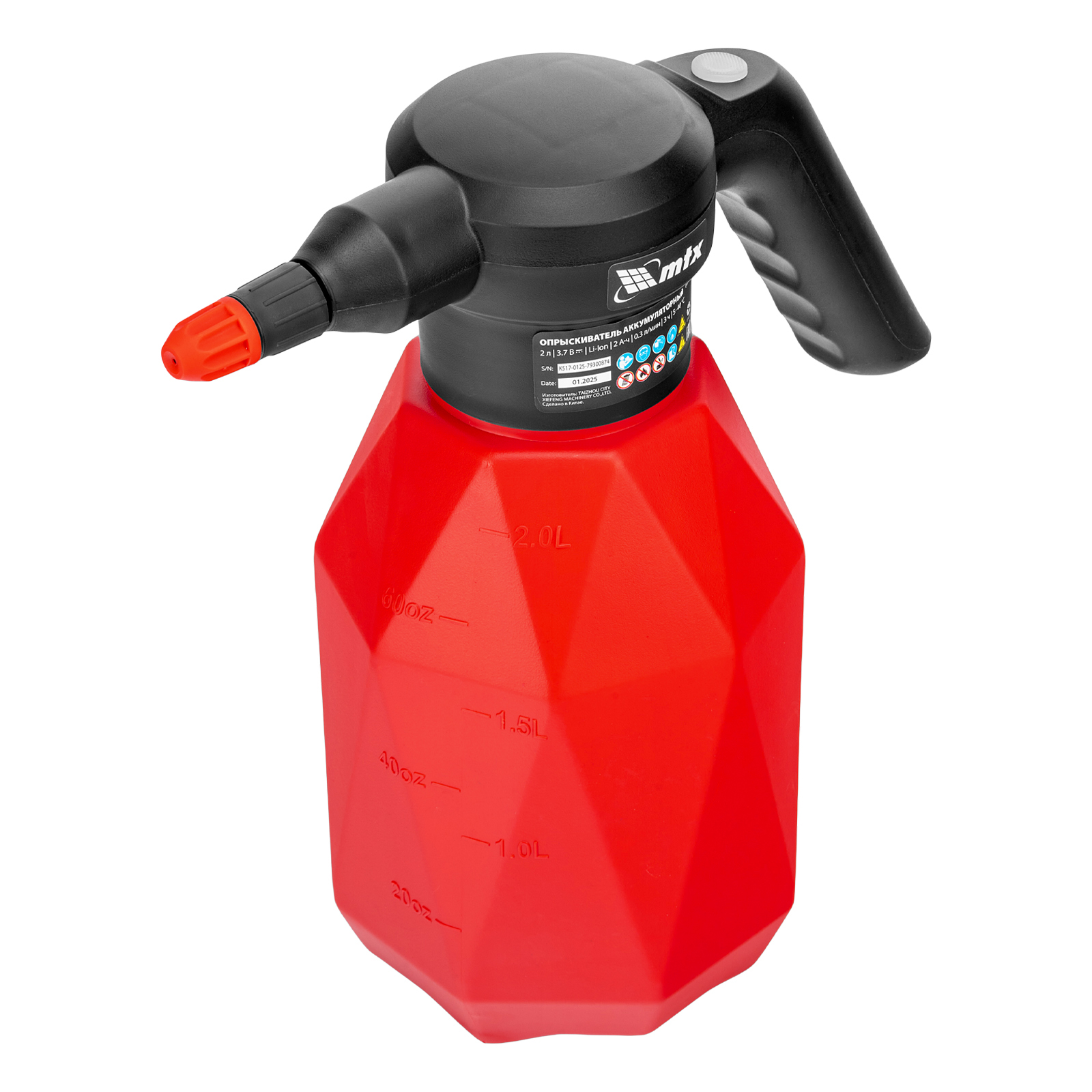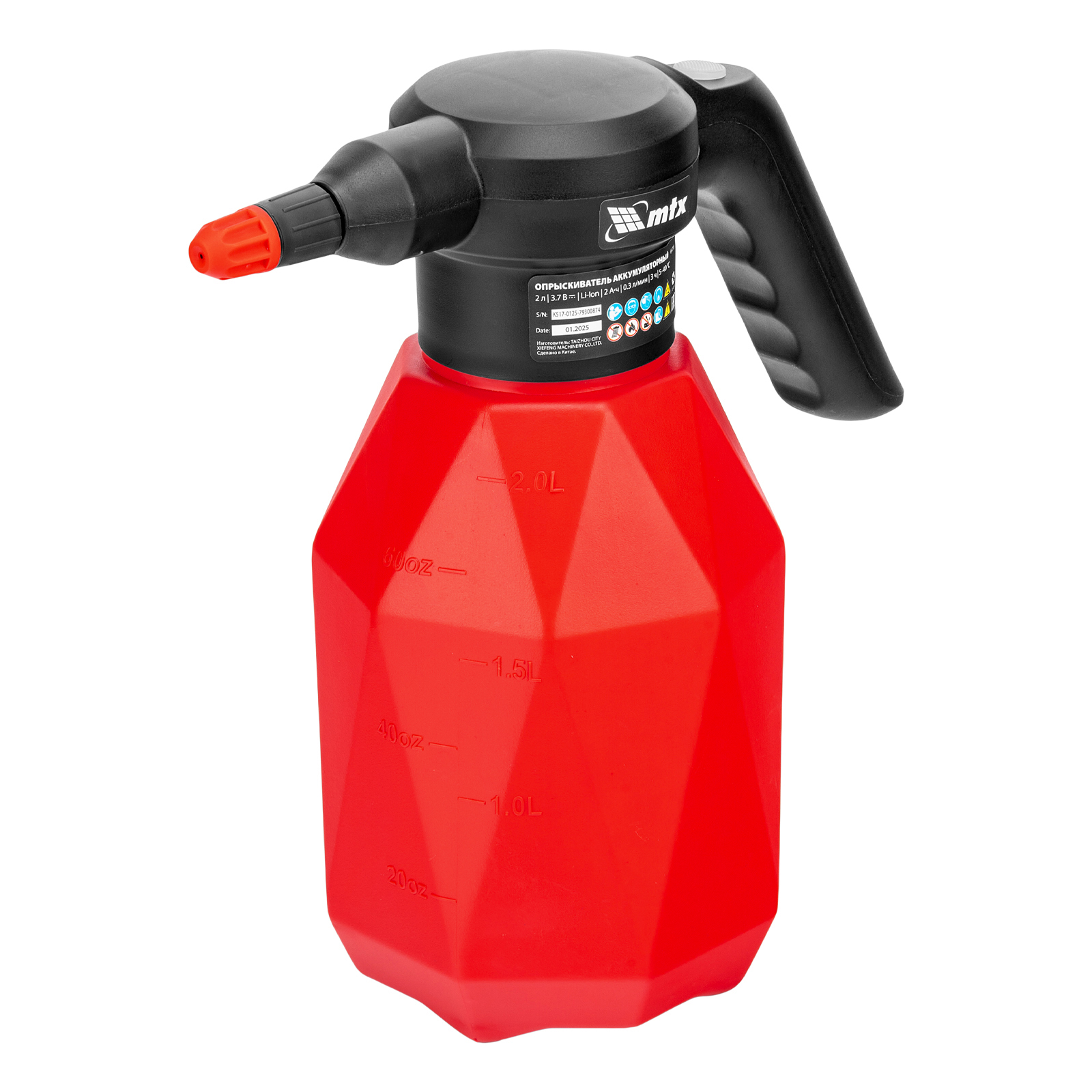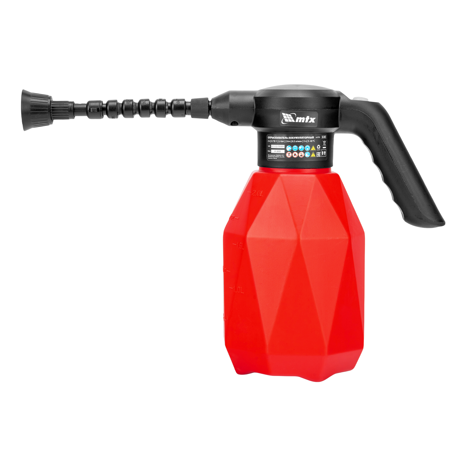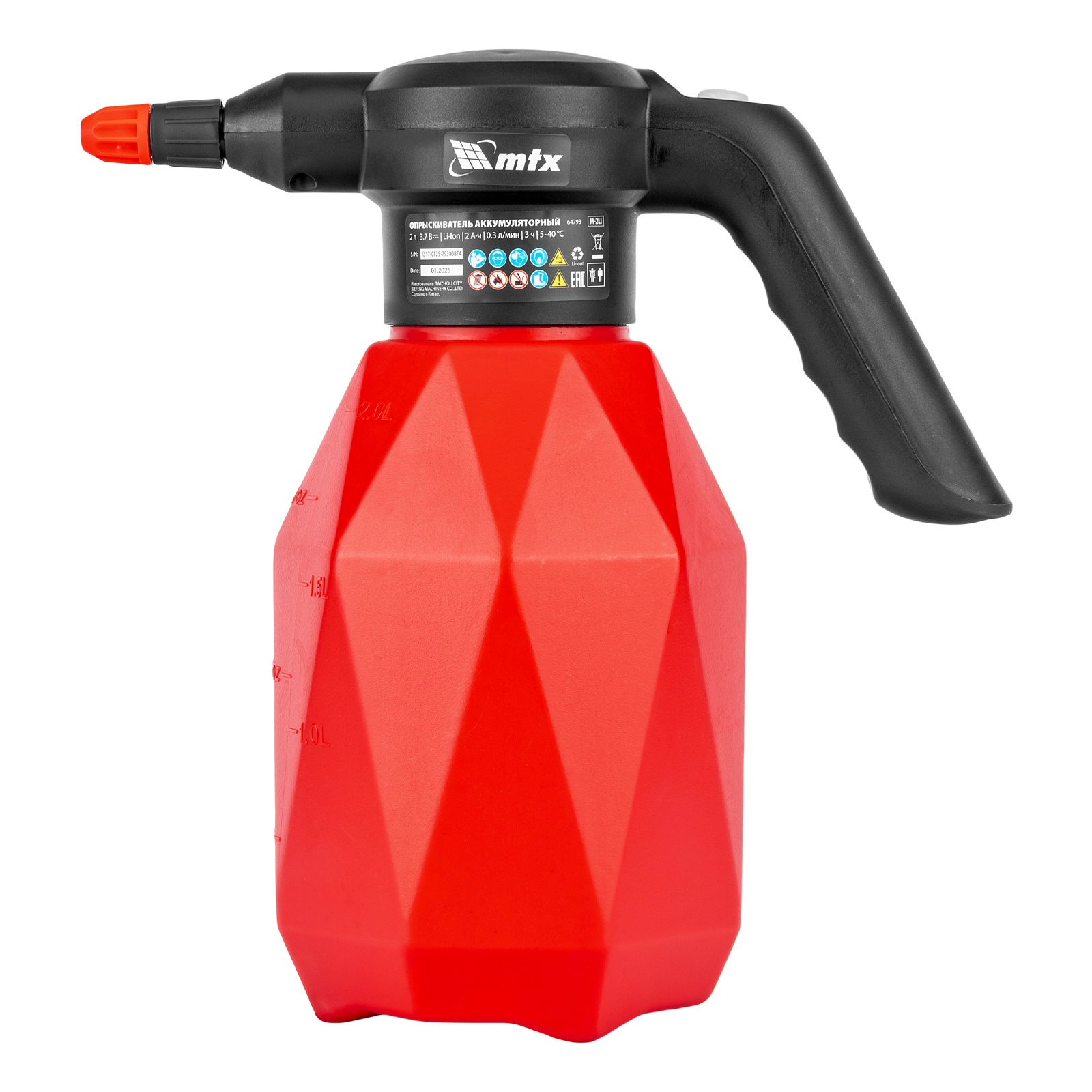 Аккумуляторный опрыскиватель MTX M-2LI 64793 с баком объемом 2 л и Li-Ion батареей на 3,7 В, емкостью 2 Ач, предназначен для ухода за растениями — внесения жидких удобрений, распыления инсектицидных жидкостей. Также может использоваться для мытья окон, фасадов, дорожек, садового инвентаря. Размер и форма факела регулируются, максимальная дальность распыления составляет 2 м, что позволяет обрабатывать участки различной площади и труднодоступные места. Опрыскиватель экономит силы и время пользователя, будет полезен в быту и на производстве.