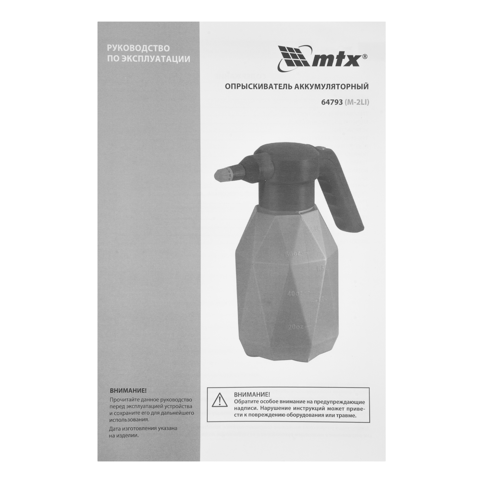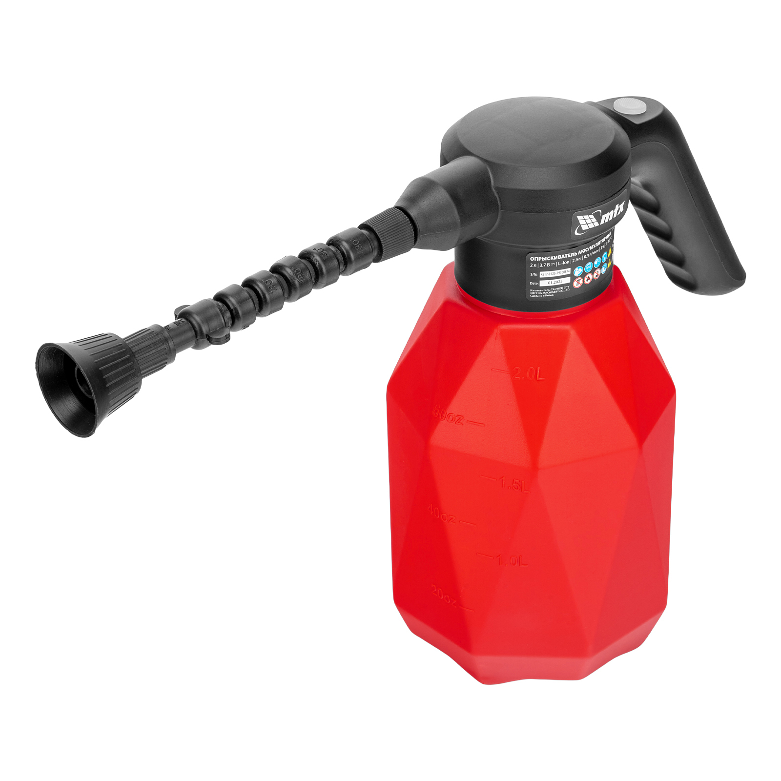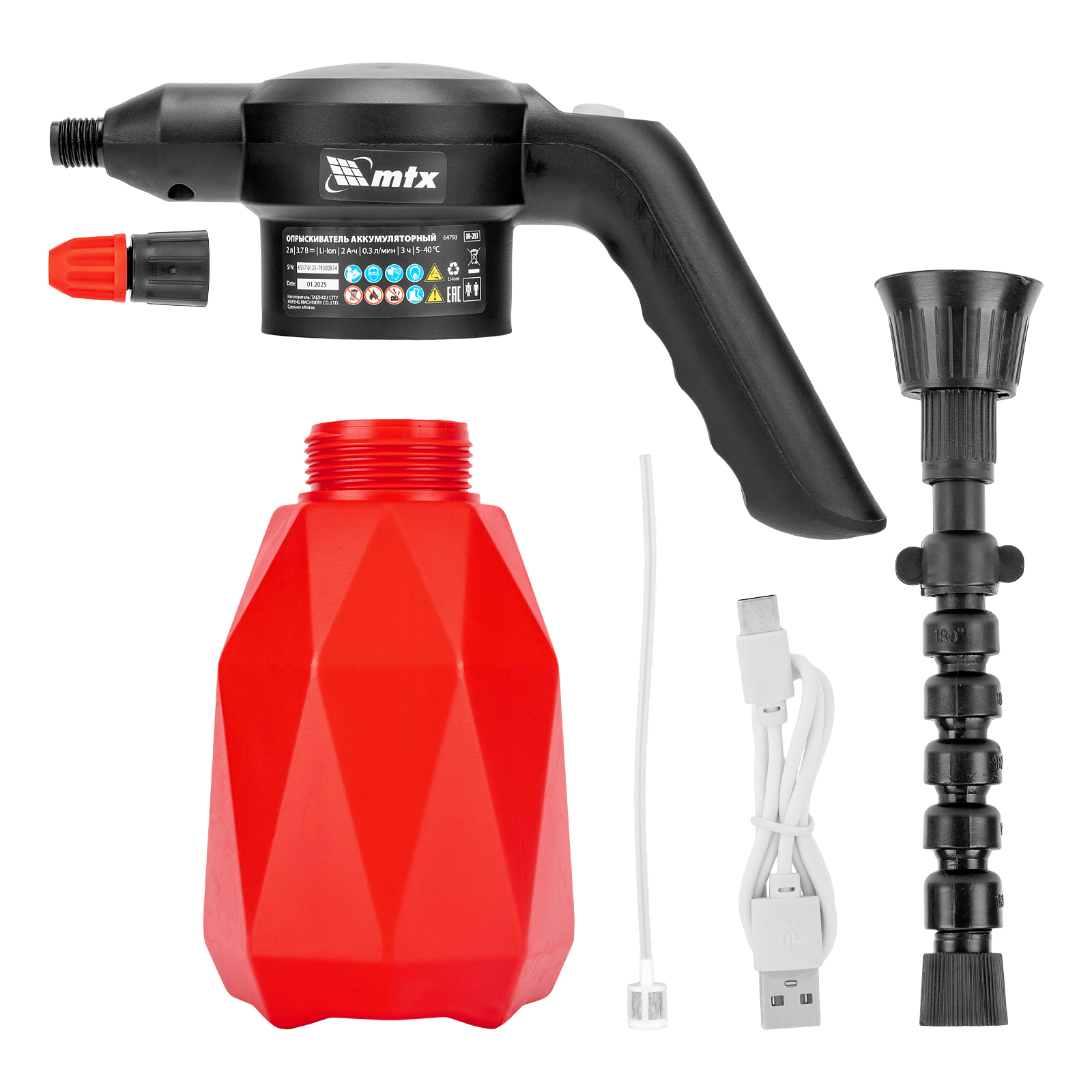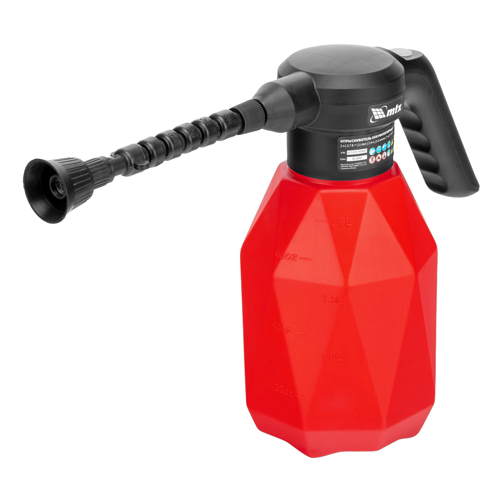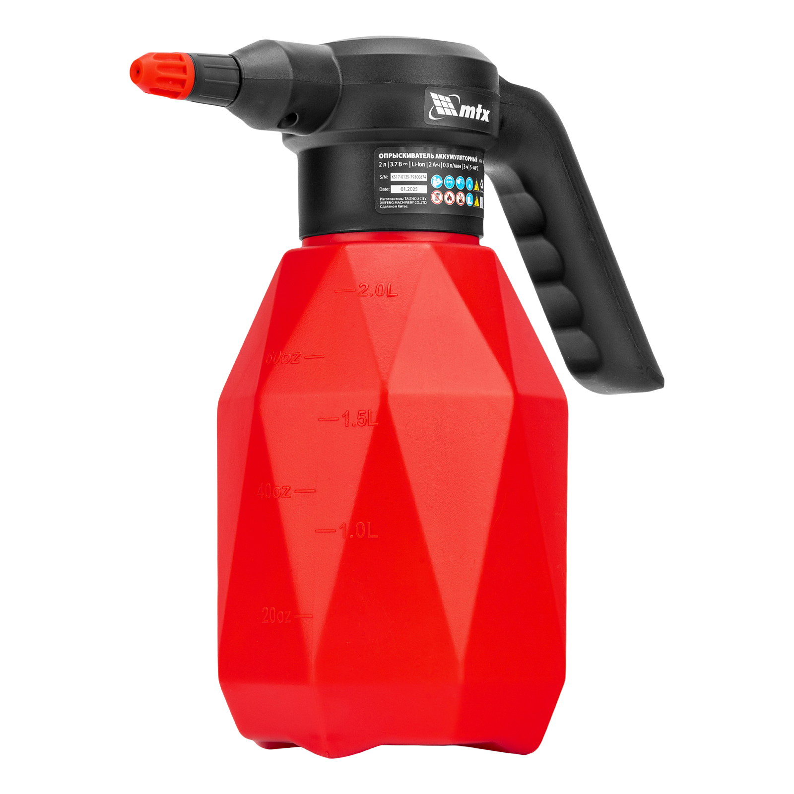 Аккумуляторный опрыскиватель MTX M-2LI 64793 с баком объемом 2 л и Li-Ion батареей на 3,7 В, емкостью 2 Ач, предназначен для ухода за растениями — внесения жидких удобрений, распыления инсектицидных жидкостей. Также может использоваться для мытья окон, фасадов, дорожек, садового инвентаря. Размер и форма факела регулируются, максимальная дальность распыления составляет 2 м, что позволяет обрабатывать участки различной площади и труднодоступные места. Опрыскиватель экономит силы и время пользователя, будет полезен в быту и на производстве.