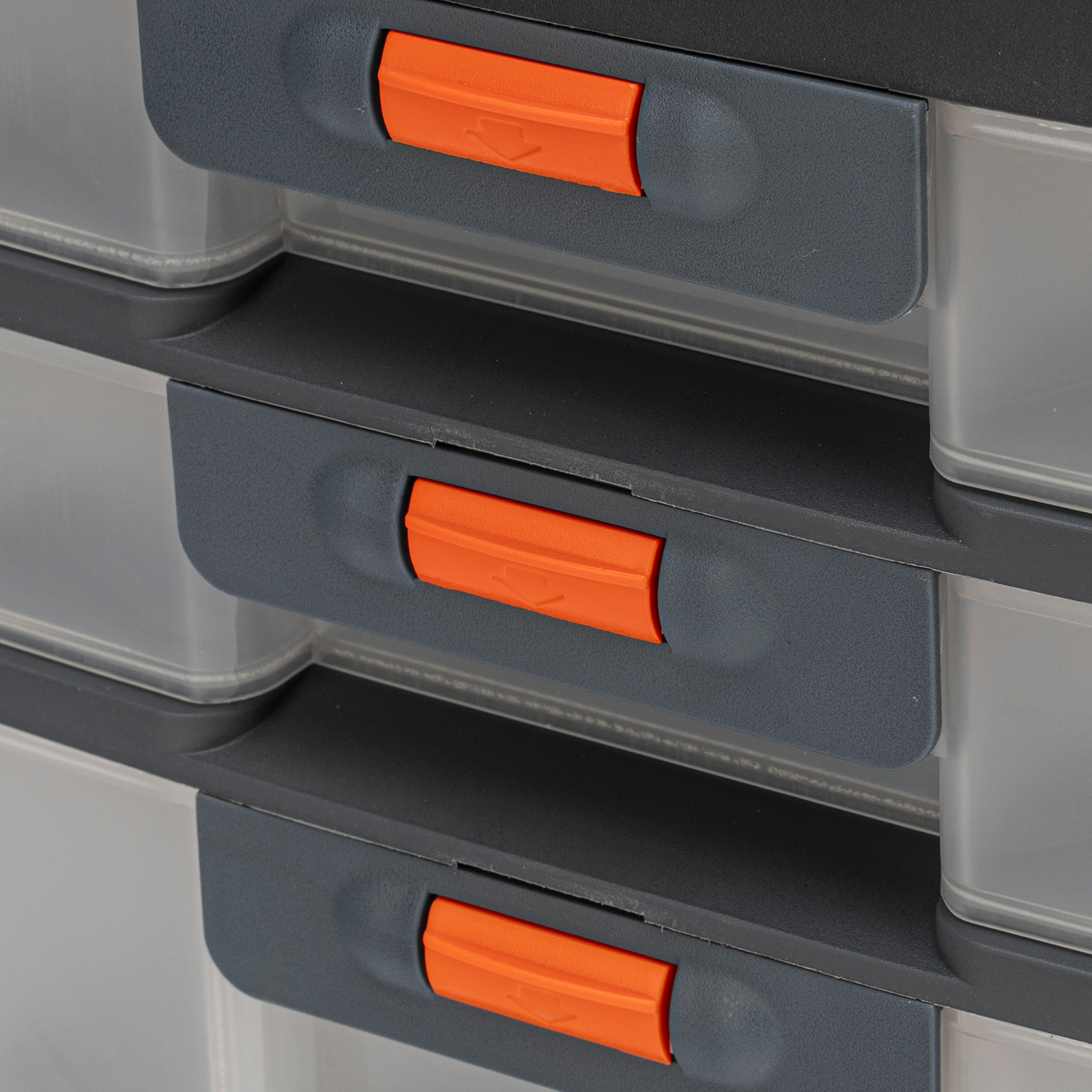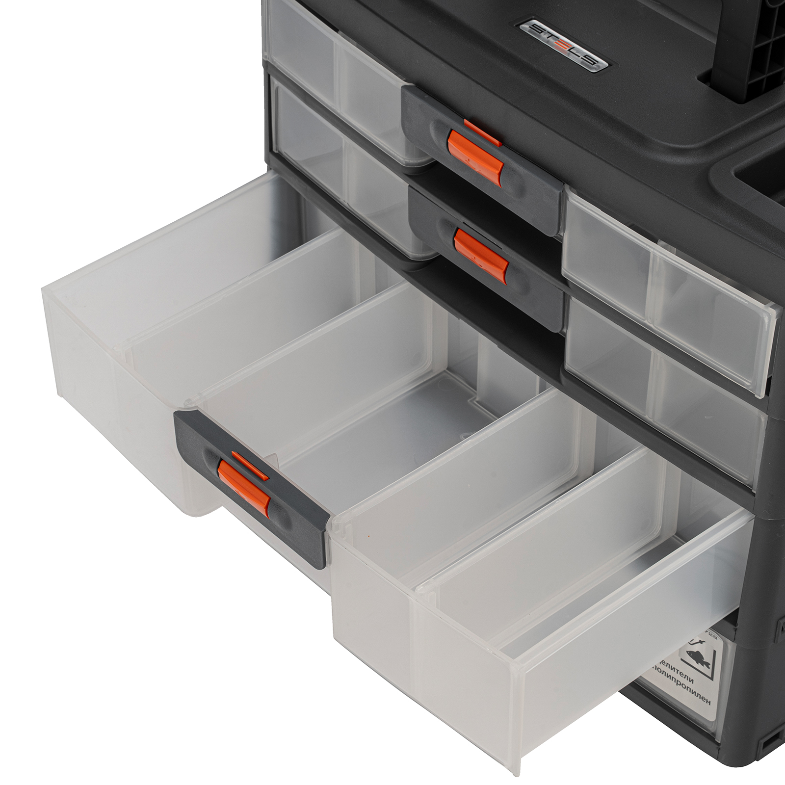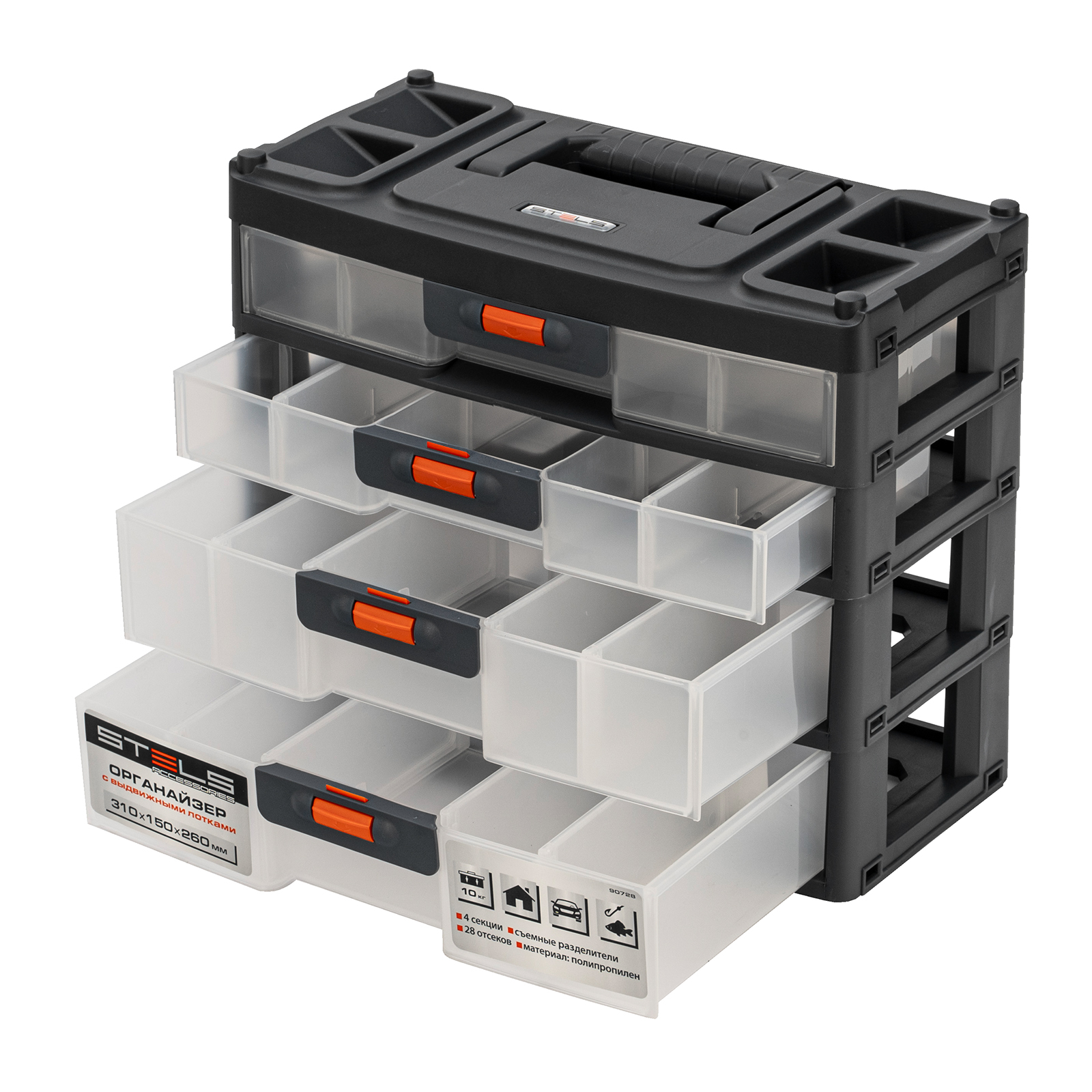 Органайзер Stels 90728 размером 310 х 150 х 260 мм, из пластика, имеет 4 секции с выдвижными лотками и используется для хранения крепежных элементов, принадлежностей для рукоделия, снастей и т.д. Обеспечивает быстрый доступ к предметам, позволяет избежать их перемешивания и утери. Пригодится в гараже, мастерской, будет полезен в домашнем хозяйстве.