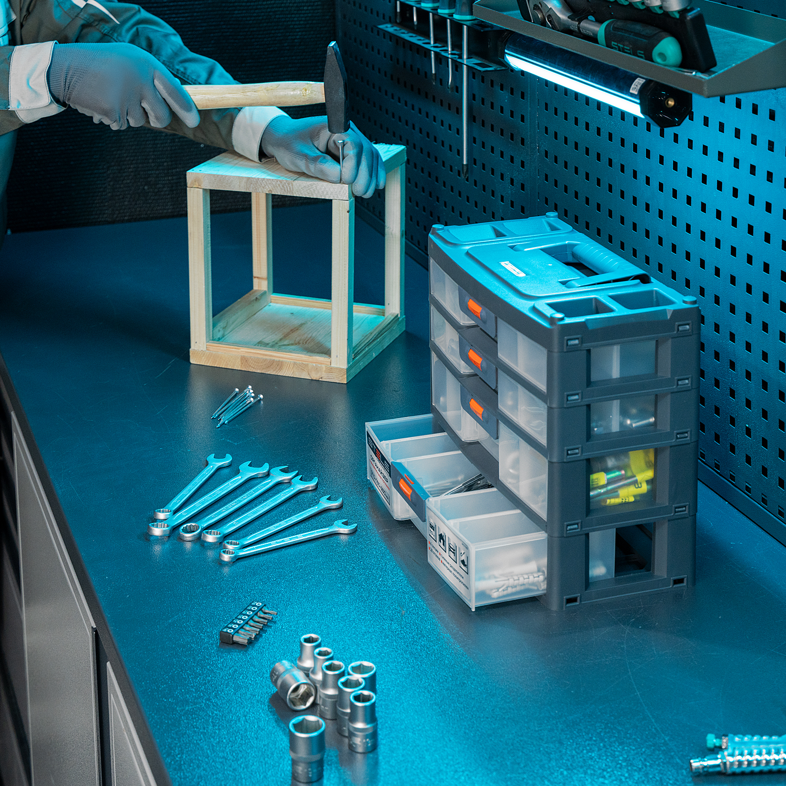 - Продуманная организация внутреннего пространства — в каждый лоток можно установить разделители для сортировки предметов по размеру, это позволит создать до 28 отсеков.