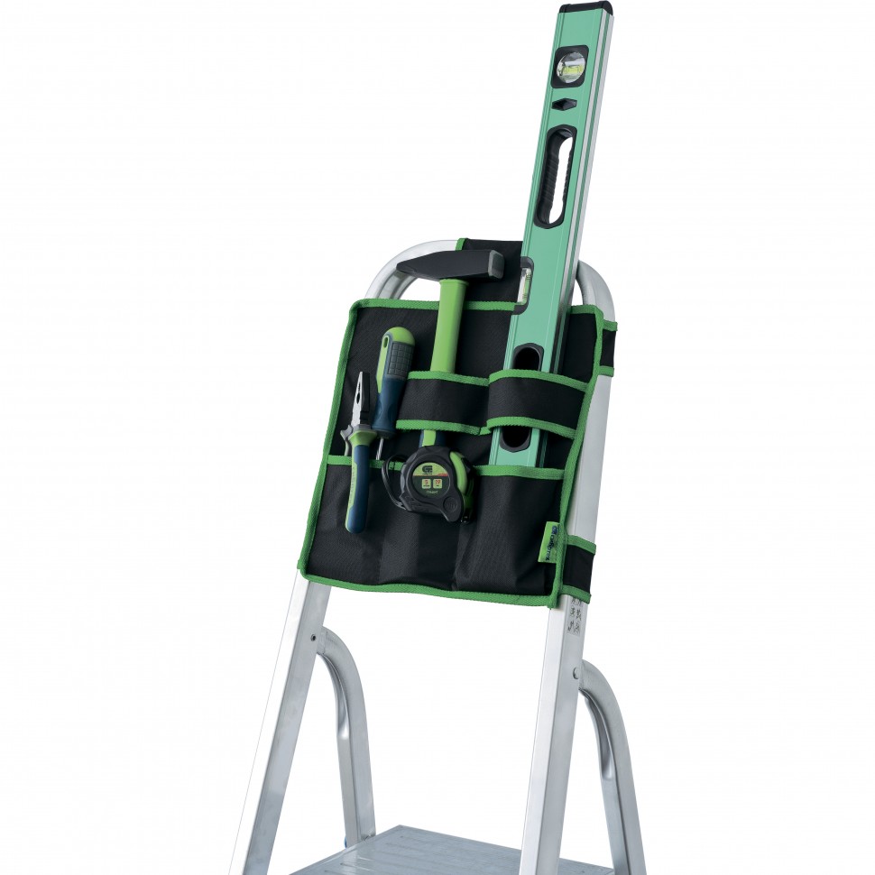 <ul><li>Органайзер для инструмента на стремянку.</li></ul><ul><li>Подходит для стальных и алюминиевых стремянок с разной толщиной профиля.</li></ul><ul><li>Три глубоких кармана для инструмента.</li></ul><ul><li>Два удерживающих ремня над карманами для длиномерного инструмента - уровня, молотка и т.д.</li></ul><ul><li>Легко снимается и чистится.</li></ul><ul><li>Ткань Оксфорд 600D прочная ткань из химических волокон (100% полиэстер) определенной структуры с покрытием PU, которое обеспечивает ее водонепроницаемость.</li></ul><ul><li>Ткань обладает высокой прочностью, эластичностью, устойчивостью к истиранию, многократному сгибу, термо и светостойкостью.</li></ul>