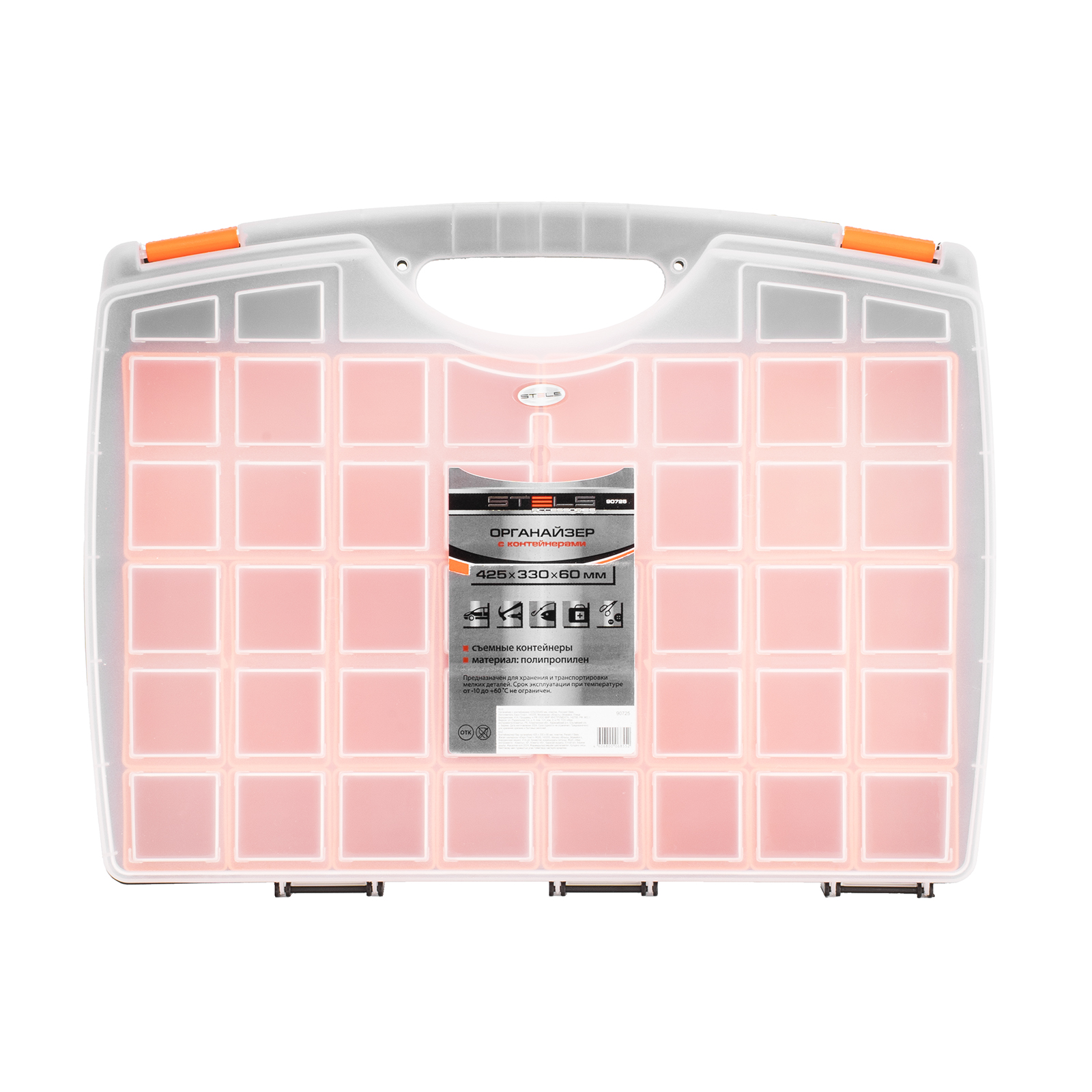 Органайзер с контейнерами Stels 90725 размером 425 х 330 х 60 мм, из пластика, пригодится в хозяйстве и мастерской для хранения крепежных элементов, принадлежностей для рукоделия, снастей и т.д. Он обеспечивает быстрый доступ к предметам, не допуская их перемешивания и утери.