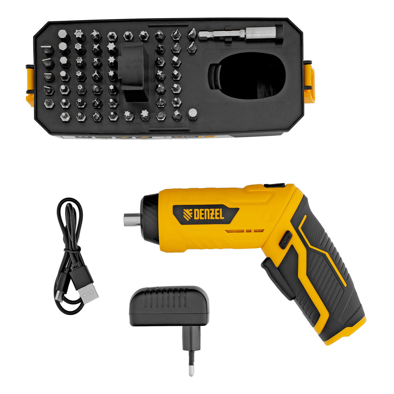 Аккумуляторная отвертка Denzel CSH-3.6 26004 работает от источника питания Li-Ion 3,6 В емкостью 1,5 А·ч и поставляется с набором из 54 бит. Предназначена для закручивания и откручивания резьбового крепежа в ходе проведения монтажных работ. Максимальный крутящий момент составляет 4,5 Н·м, что позволяет эффективно решать поставленные задачи. Патрон снабжен магнитом, поэтому оснастка надежно фиксируется в нем и не выпадает во время работы. Отвертка пригодится в быту.