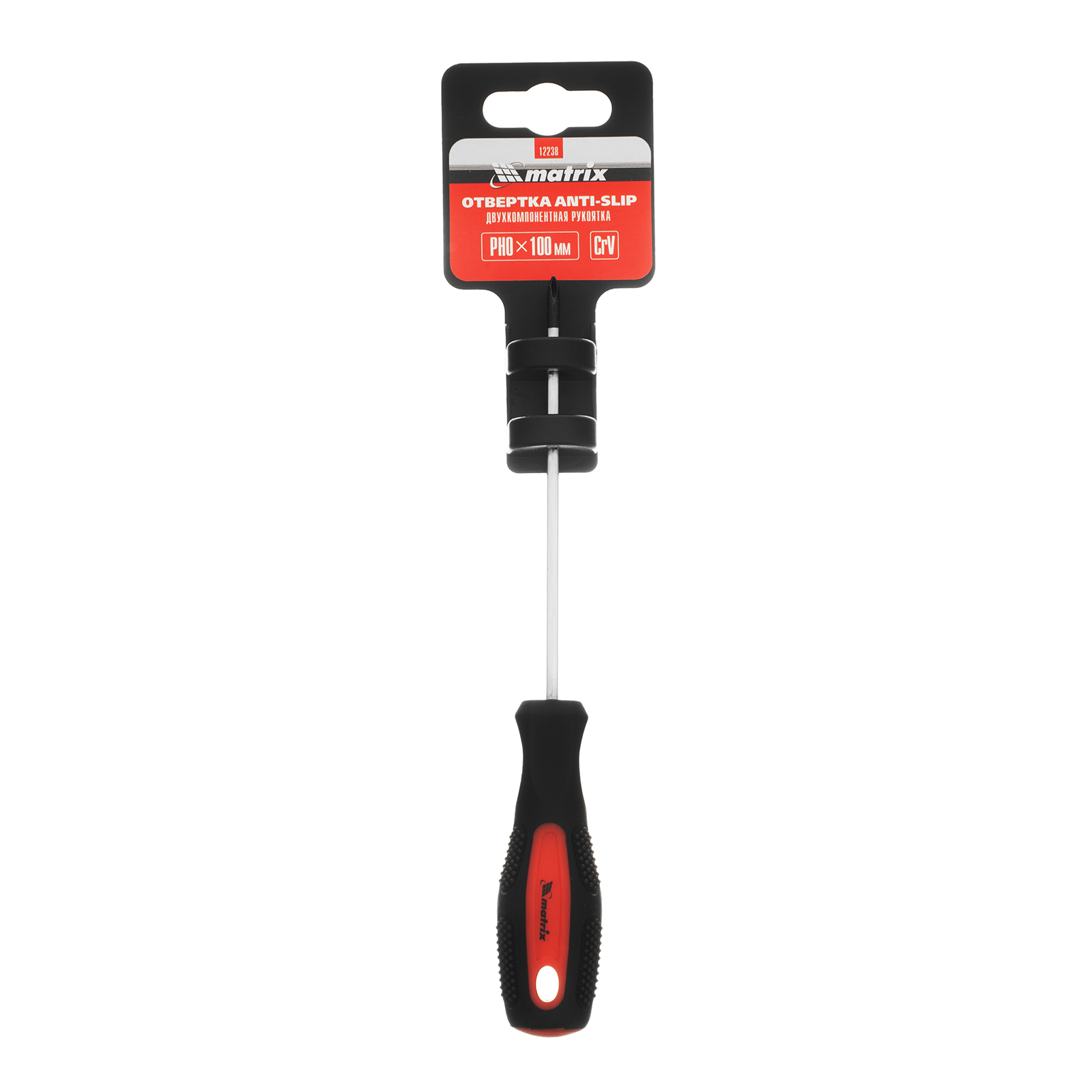 <p>Отвертка Matrix Anti-Slip 12238, PH0 х 100 мм, из стали CrV, с двухкомпонентной рукояткой, позволяет решить профессиональные задачи на строительной площадке, в автомастерской, в квартире. Она используется для работы с крепежом типоразмера Phillips «крест». Отвертка оснащена стержнем длиной 100 мм, благодаря чему удобно работать на поверхностях и в углублениях.</p><h2>Преимущества</h2><ul><li>Высокое качество и долговечность отвертки гарантирует стержень из легированной стали CrV, закаленной до твердости 50-52 HRC.</li><li>Фосфатированный шлиц обеспечивает улучшенное сцепление с крепежом, повышает точность работы.</li><li>Намагниченное жало позволяет насадить на него саморез и работать одной рукой, а другой удерживать закрепляемую деталь.</li><li>Двухкомпонентная рукоятка с подпальцевыми выемками и мелкими насечками удобно лежит в руке и не проскальзывает.</li></ul>