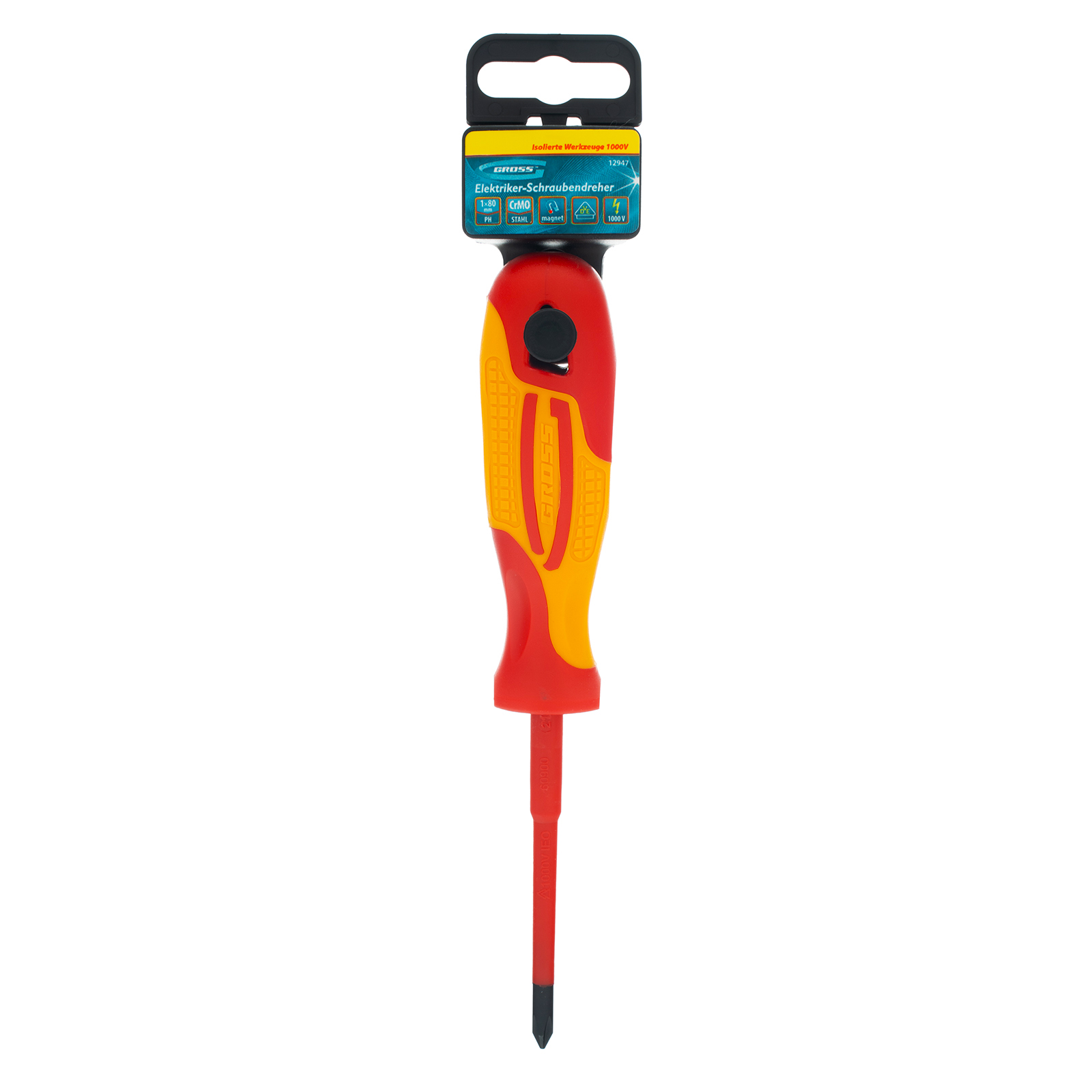 Диэлектрическая отвертка Gross 12947 до 1000 В, PH1 х 80 мм, из стали CrMo, с двухкомпонентной рукояткой, применяется при проведении работ с крепежом типа Phillips. С ее помощью можно установить электросчетчики, клеммники, розетки и т.д. Отвертка со стержнем длиной 80 мм оптимально подходит для работы на поверхностях и в углублениях. Внимание — техника безопасности запрещает выполнять работы под напряжением!