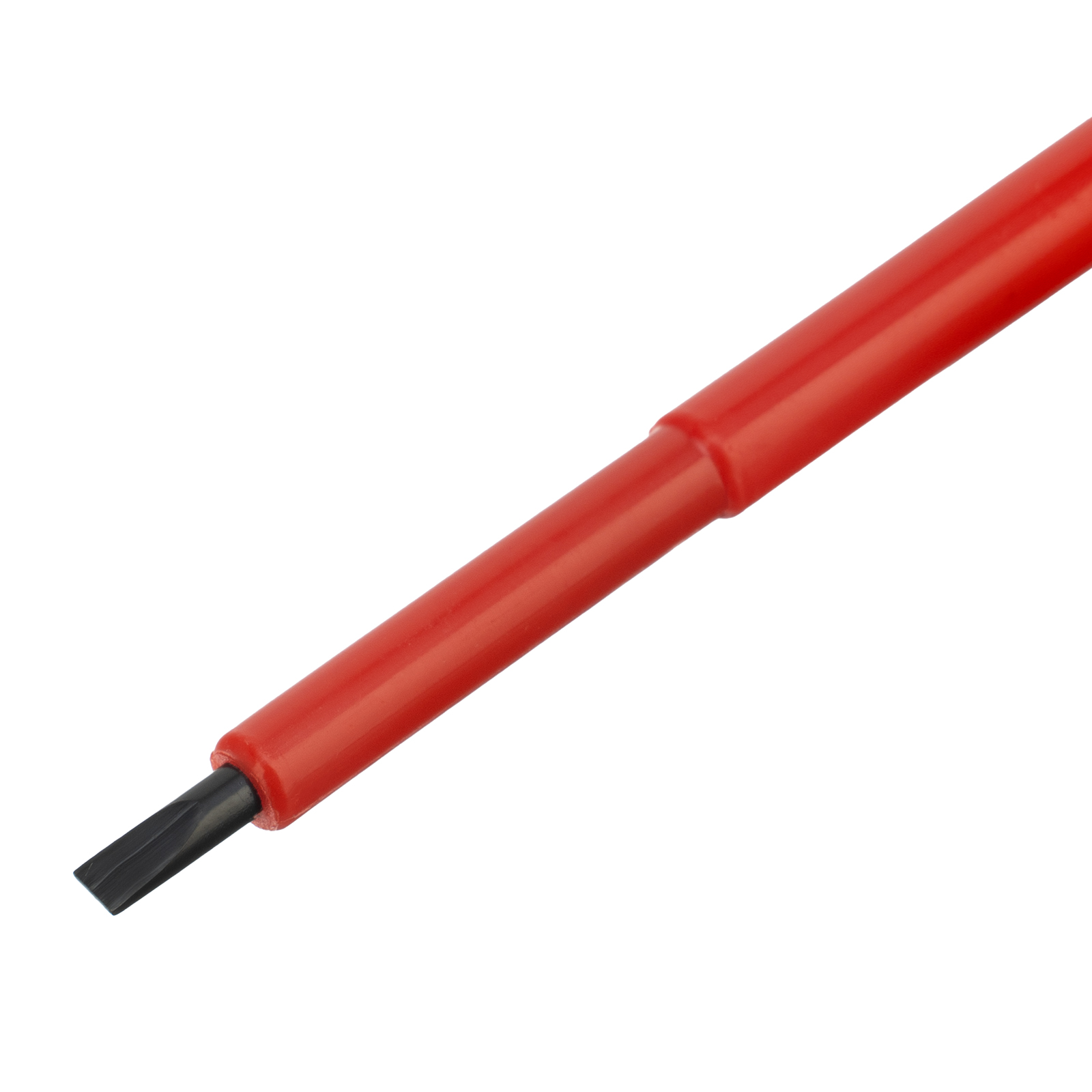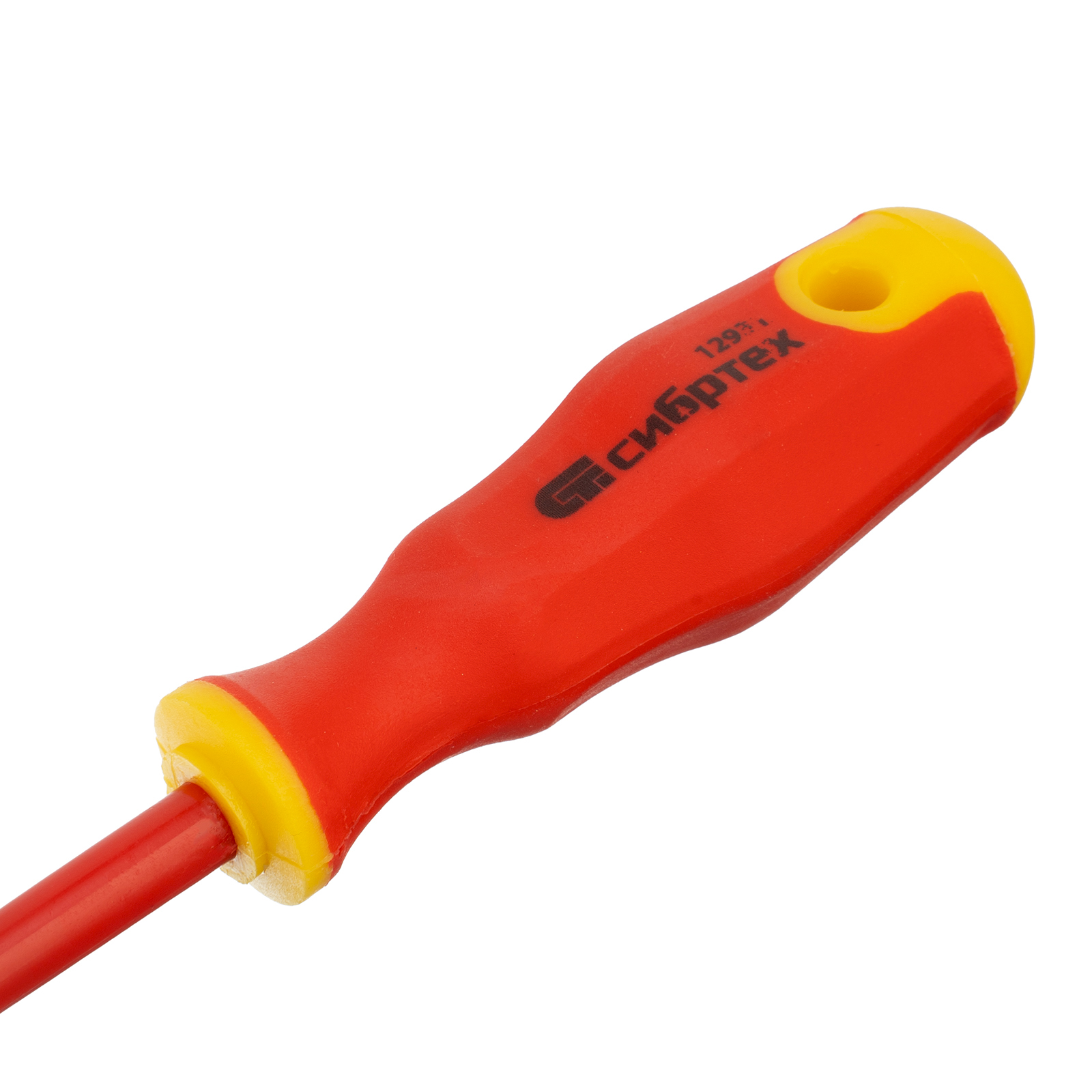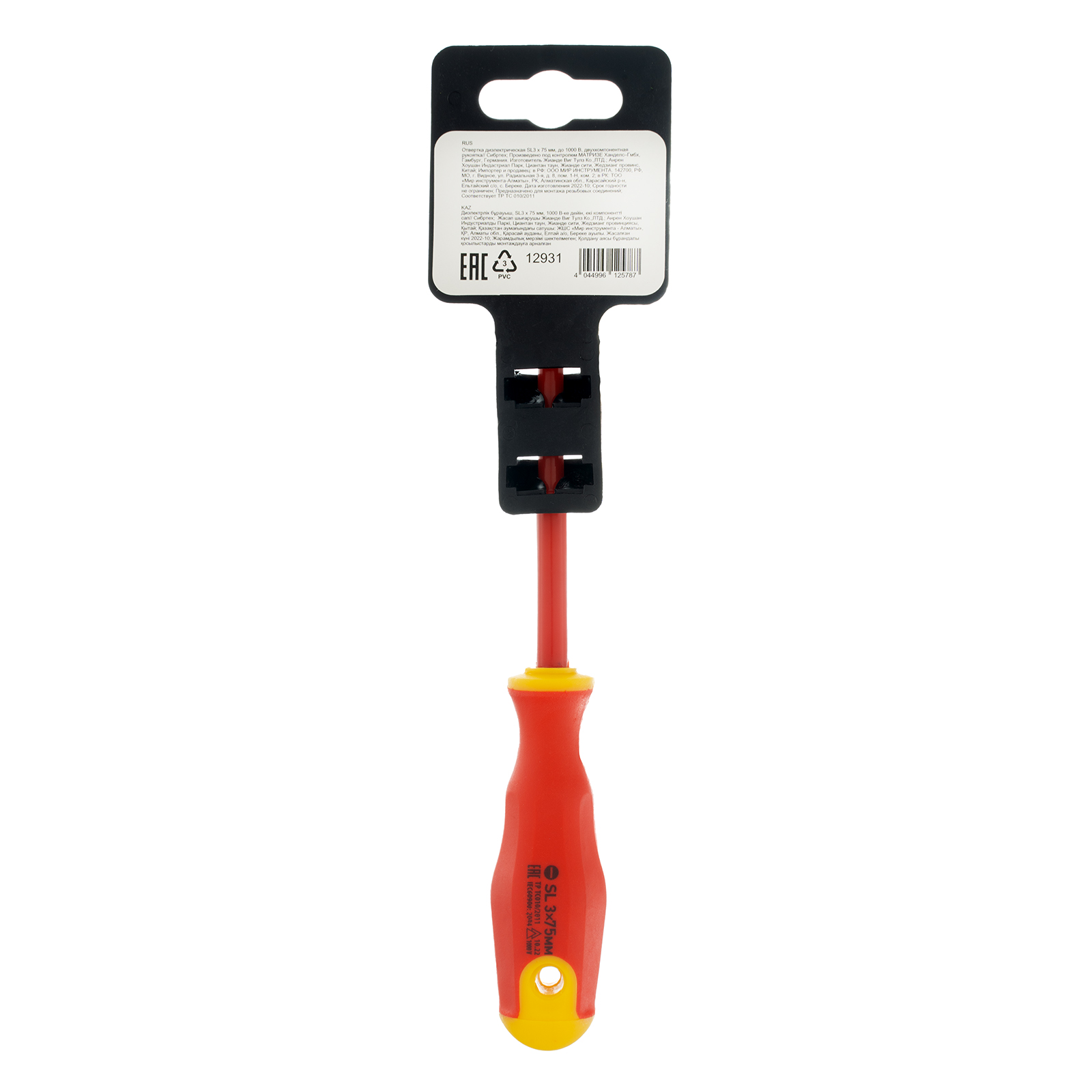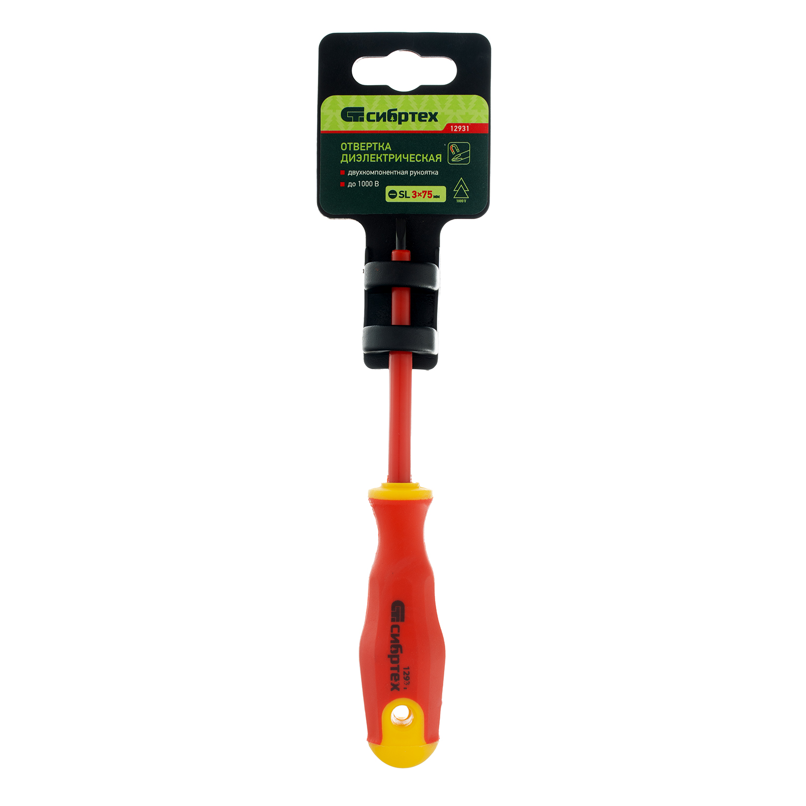 Диэлектрическая отвертка Сибртех 12931, SL3 х 75 мм, из стали CrV, с двухкомпонентной рукояткой, используется для монтажа/демонтажа крепежных элементов типа Slotted «минус». Отвертка рассчитана на полупрофессиональное применение: замену розеток, подключение электросчетчиков и т.д. Длина стержня 75 мм удобна для работы с крепежом на поверхности и в углублениях. Внимание — техника безопасности запрещает выполнять работы под напряжением!
