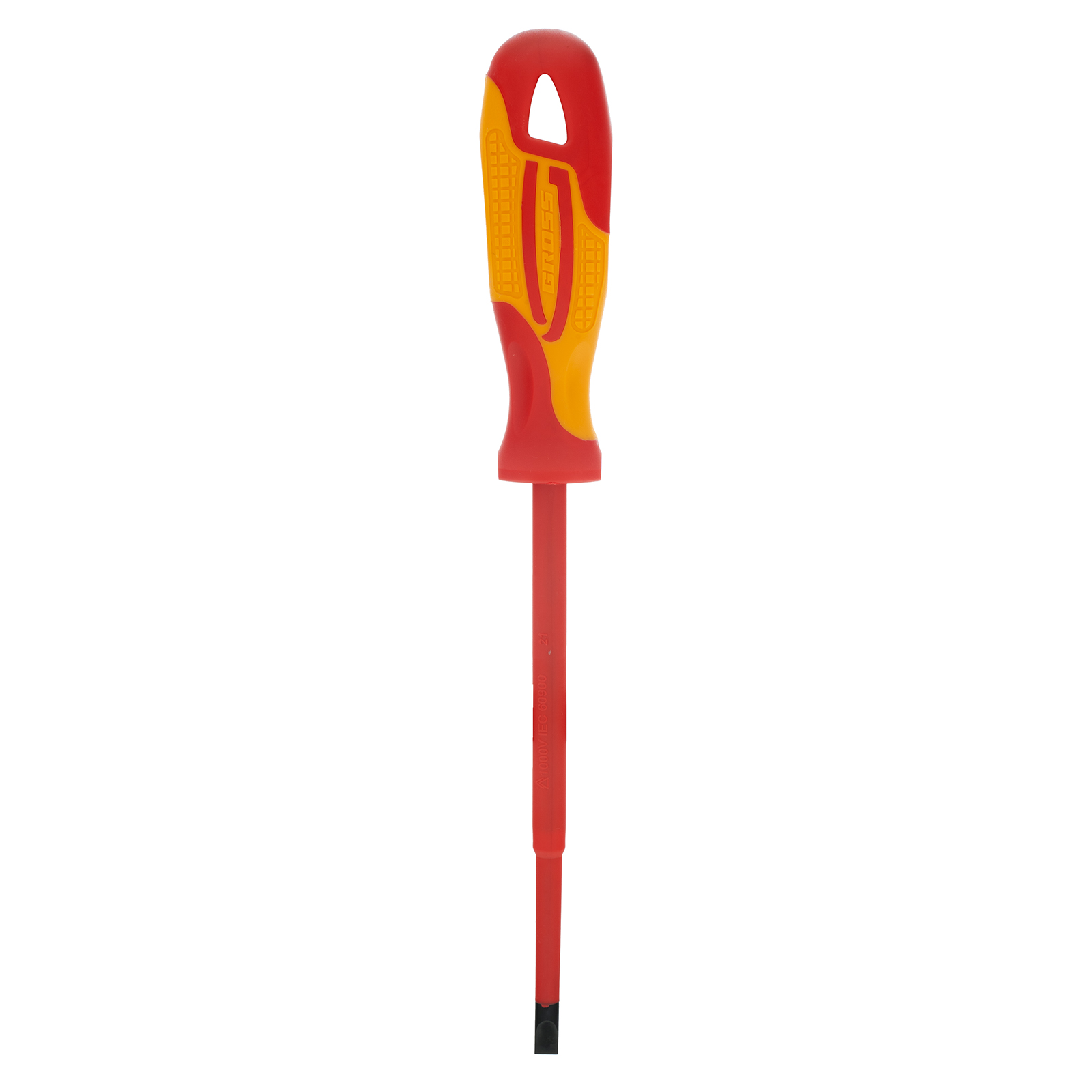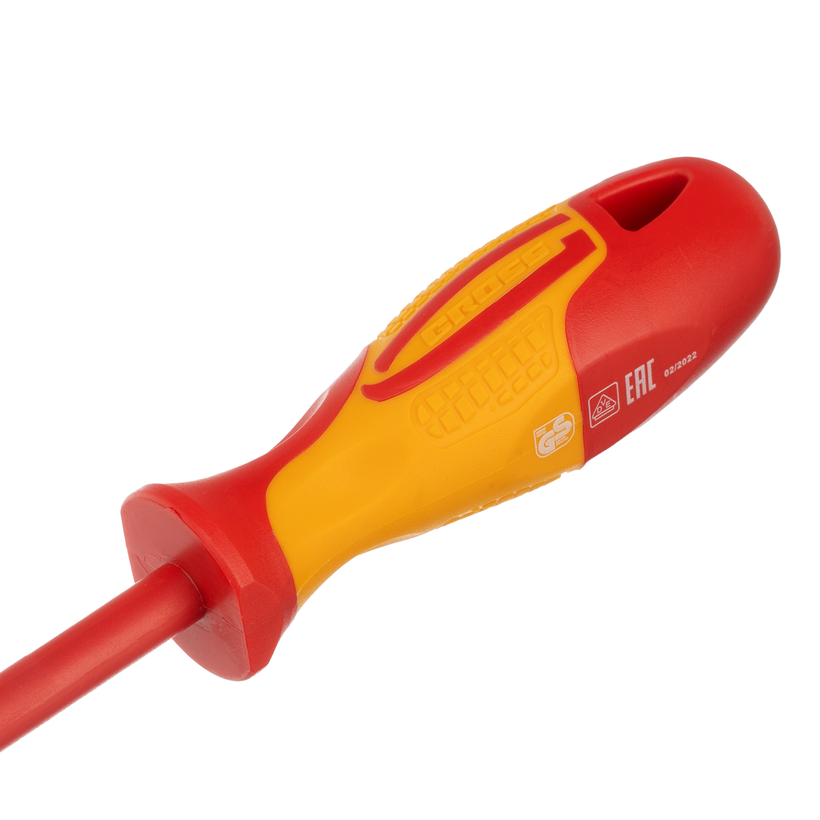 Диэлектрическая отвертка Gross 12944, SL6,5 х 150 мм, из стали CrMo, до 1000 В,с двухкомпонентной рукояткой, позволяет решать профессиональные задачи при работе с электрооборудованием. Отверткой со шлицем «минус» осуществляется монтаж или извлечение крепежа типа Slotted при замене розеток, установке электросчетчиков, клеммников и т.д. За счет стержня длиной 150 мм инструмент подходит для работы в углублениях и с легкодоступным крепежом. Внимание — техника безопасности запрещает выполнять работы под напряжением!