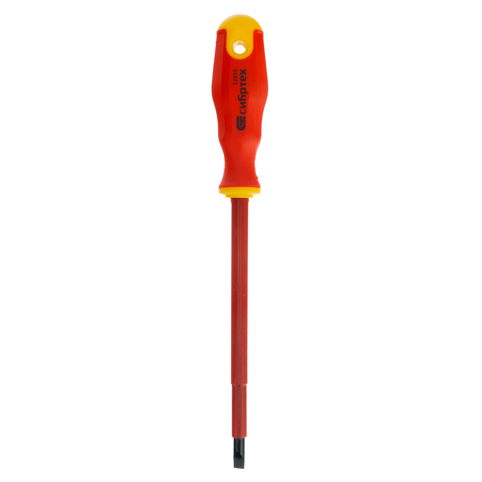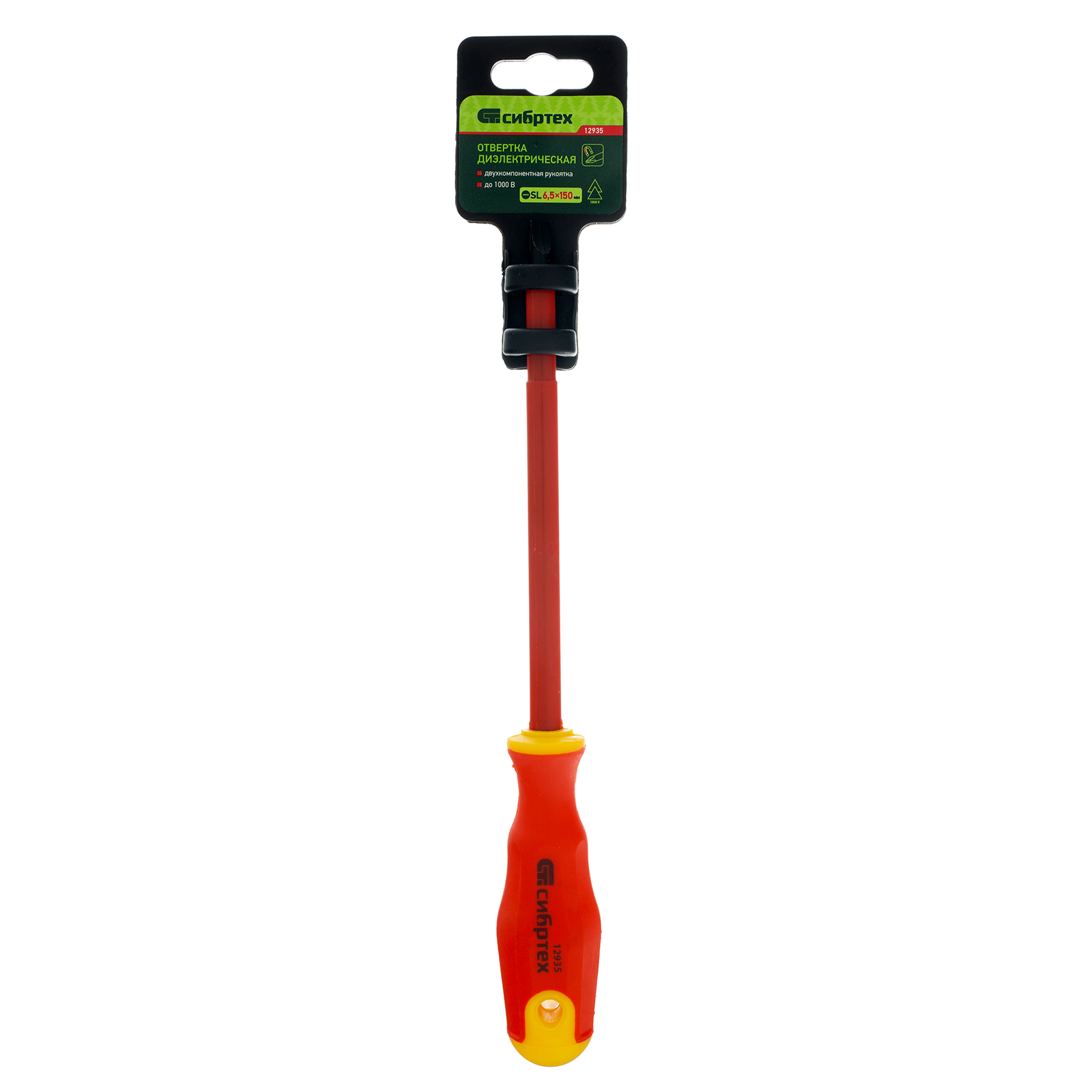 Диэлектрическая отвертка Сибртех 12935, SL6,5 х 150 мм, из стали CrV, с двухкомпонентной рукояткой, используется для монтажа/демонтажа крепежных элементов типа Slotted «минус». Отвертка рассчитана на полупрофессиональное применение: замену розеток, подключение электросчетчиков и т.д. Длина стержня 150 мм удобна для работы с крепежом на поверхности и в углублениях. Внимание — техника безопасности запрещает выполнять работы под напряжением!