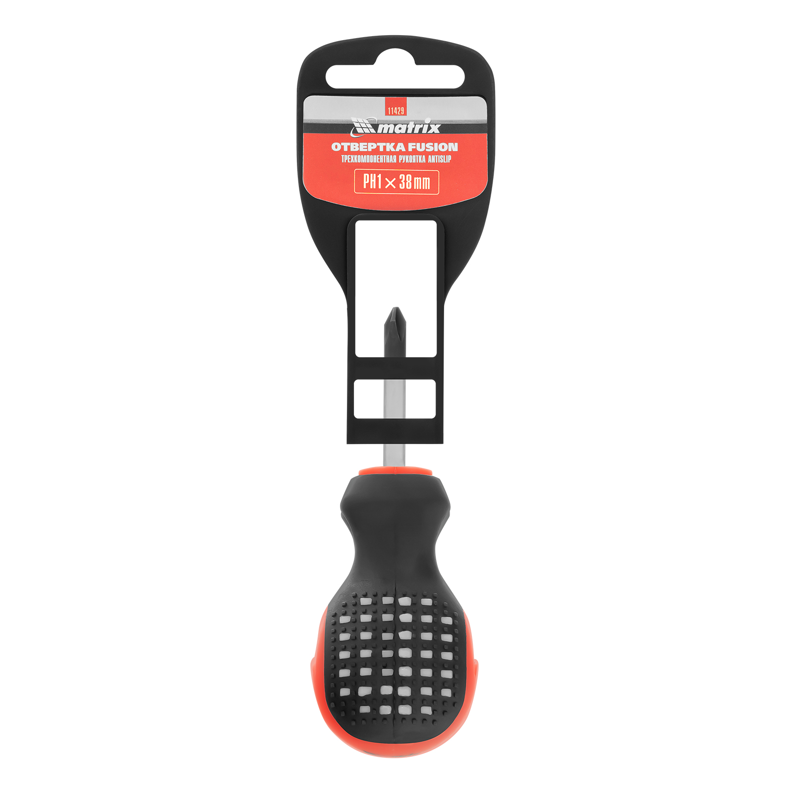 Отвертка Matrix Fusion 11429, PH1 х 38 мм, из стали CrV, с 3-х компонентной рукояткой «anti slip», предназначена для работ с резьбовым крепежом, имеющим крестообразный шлиц Phillips. Профессиональная отвертка пригодится при выполнении строительных, монтажных и ремонтных работ, а также при сборке мебели и ремонте автомобиля. Небольшая длина стержня 38 мм позволяет проводить работы в труднодоступных местах и ограниченном пространстве.
