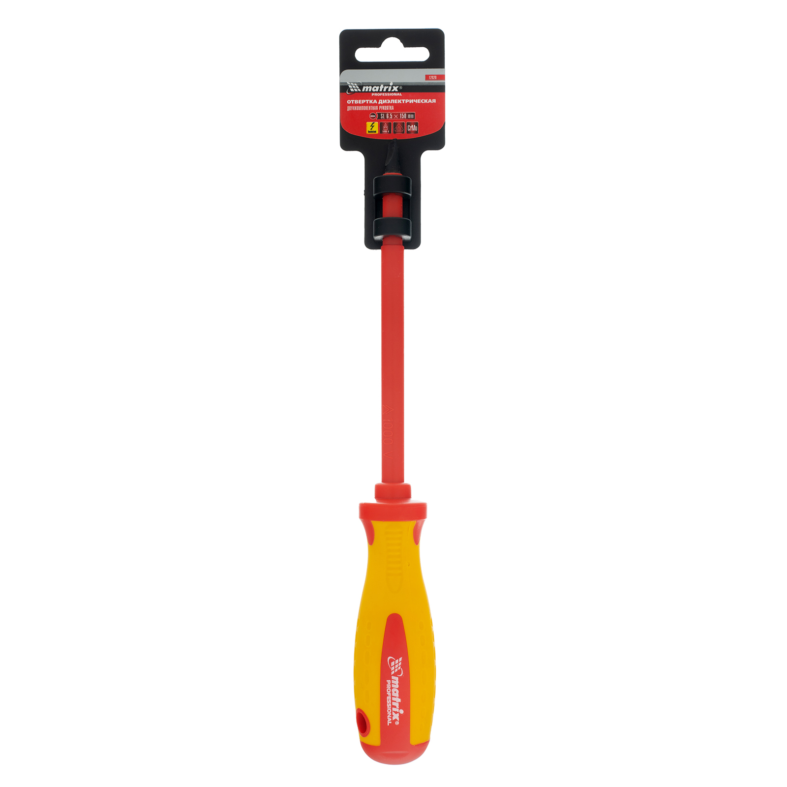 Отвертка Matrix Insulated 12920, SL6,5 x 150 мм, из стали CrMo, с двухкомпонентной рукояткой до 1000 В, используется при проведении ремонтных с крепежом типа Slotted «минус». Благодаря диэлектрическому покрытию она выдерживает напряжение до 1000 В, поэтому оптимально подходит для настройки электрооборудования, установки розеток и др. Важно — техника безопасности запрещает работать под напряжением!
