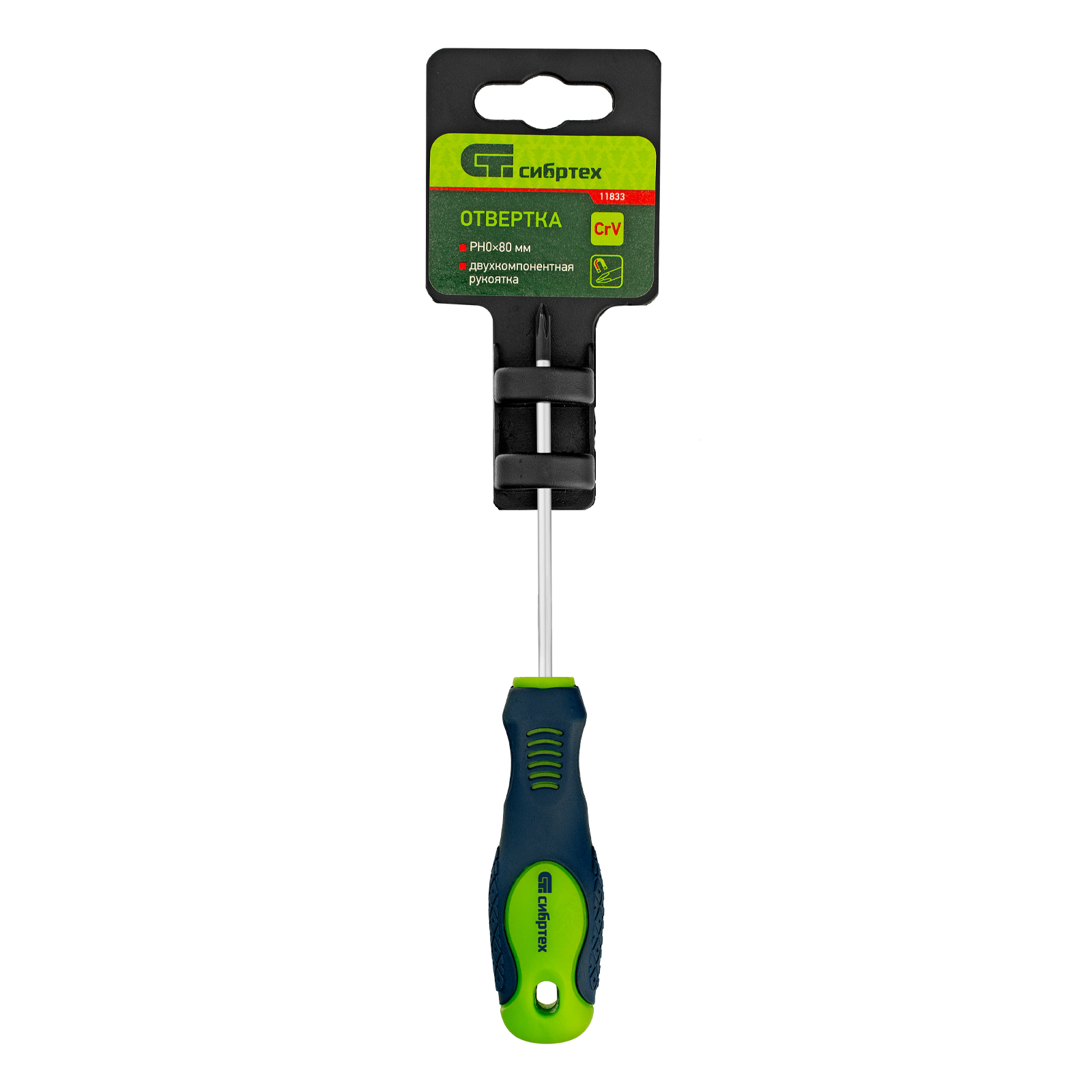 Отвертка Сибртех 11833 типоразмера PH0 х 80 мм, из стали CrV, с двухкомпонентной рукояткой и крестовым шлицем, позволяет проводить монтаж/демонтаж крепежных элементов типа Phillips. Полупрофессиональная отвертка поможет отремонтировать бытовую технику, повесить полки, собрать мебель и выполнить другие работы.
