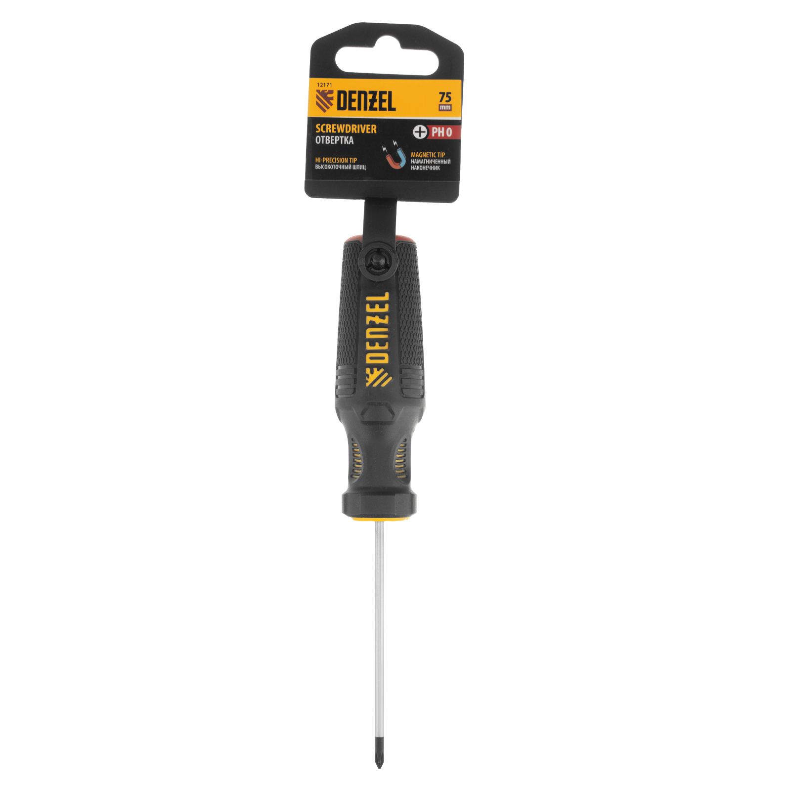 Отвертка PH0 х 75 мм Denzel 12171 из стали CrV, с трехкомпонентной рукояткой, предназначена для закручивания и откручивания резьбовых крепежей типа Philips. Шлиц намагничен, что избавляет от необходимости придерживать винт или саморез рукой. Отвертка рекомендована для профессионального использования.