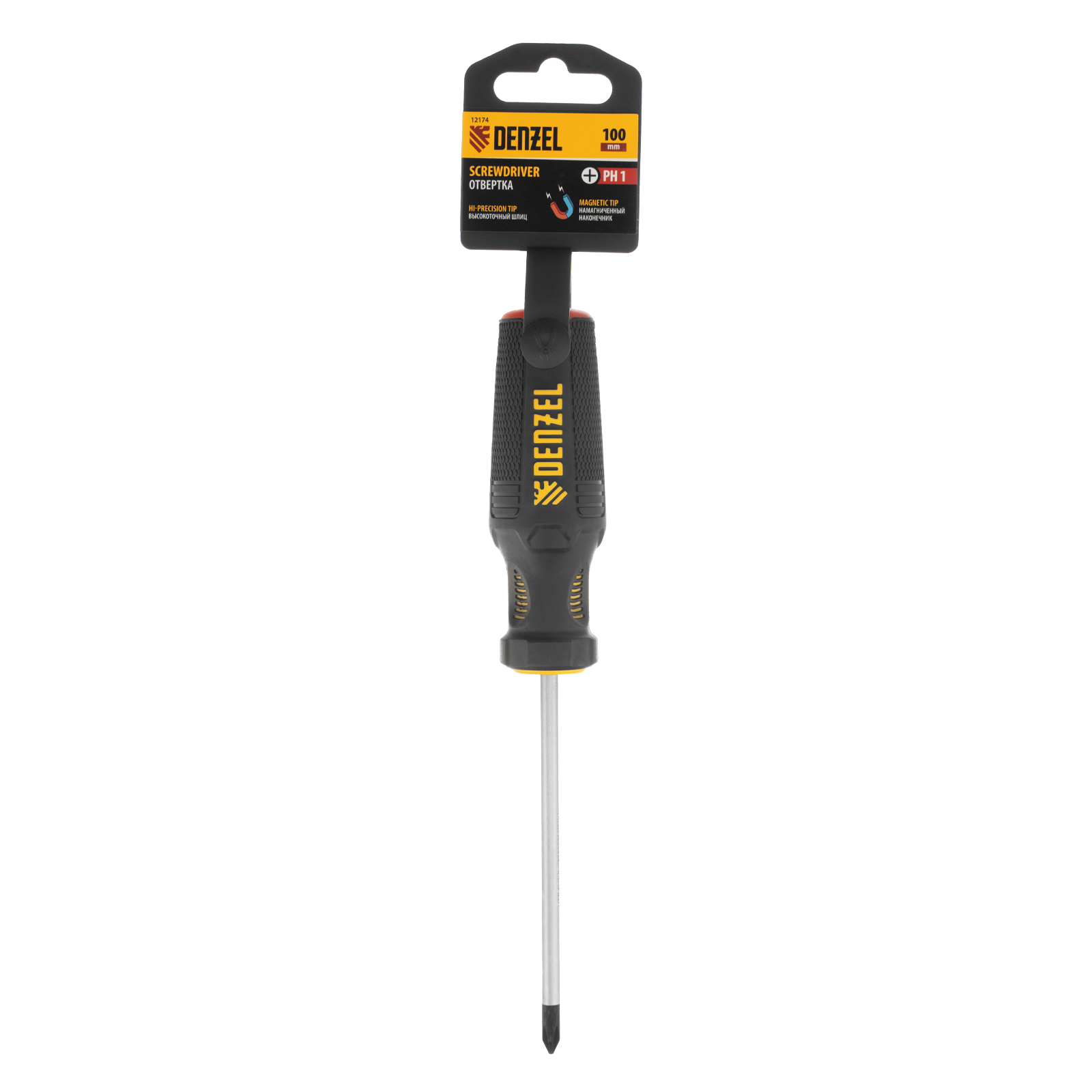 Отвертка PH1 х 100 мм Denzel 12174 из стали CrV, с трехкомпонентной рукояткой, предназначена для закручивания и откручивания резьбовых крепежей типа Philips. Шлиц намагничен, что избавляет от необходимости придерживать винт или саморез рукой. Отвертка рекомендована для профессионального использования.