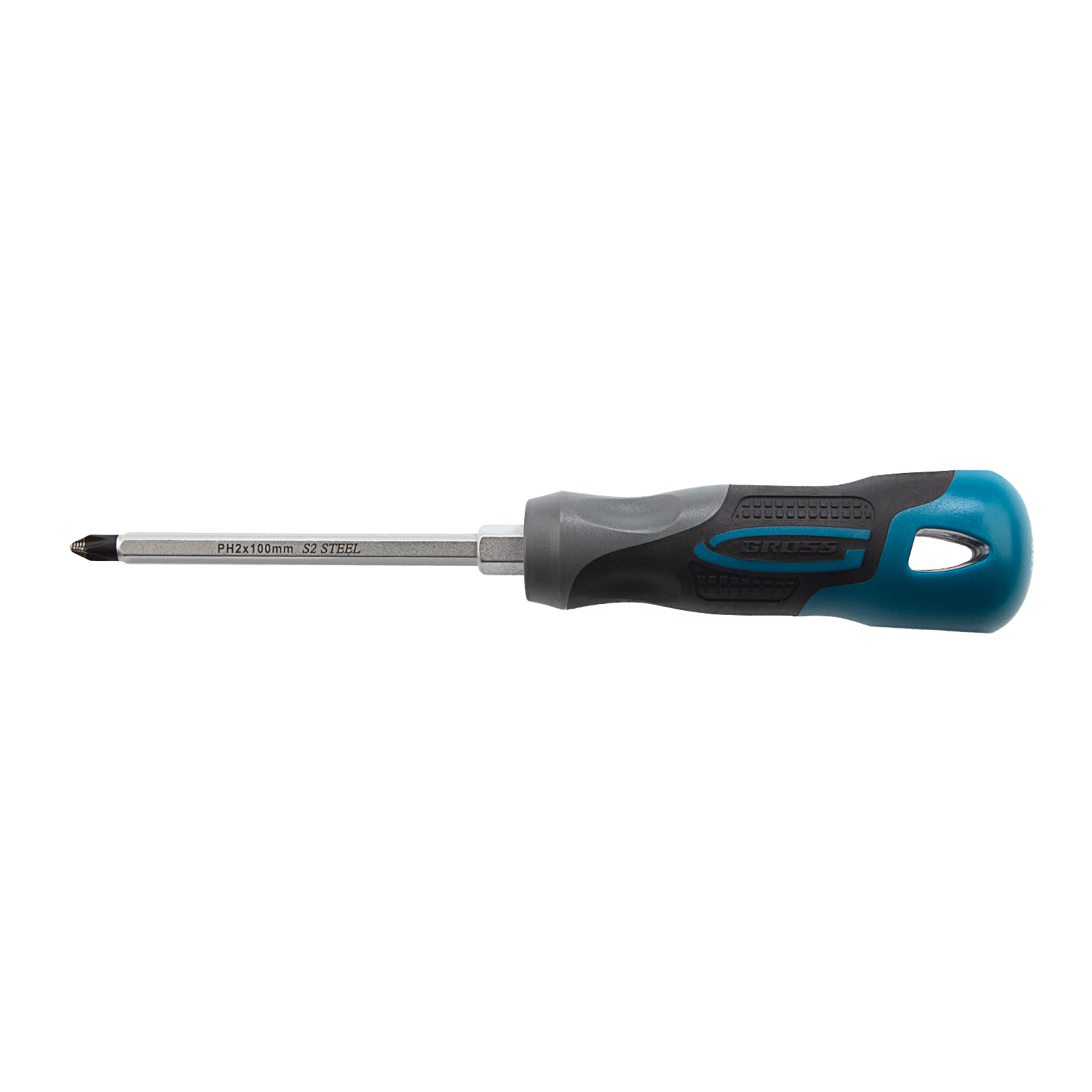 Отвертка Gross 12144, PH2 x 100 мм, из стали S2, с трехкомпонентной рукояткой, применяется при необходимости монтажа и демонтажа крепежных элементов типа Phillips «крест». Пригодится на строительной площадке или дома во время ремонта. Отверткой можно работать в углублениях благодаря стержню длиной 100 мм. Инструмент подходит для профессионального использования.