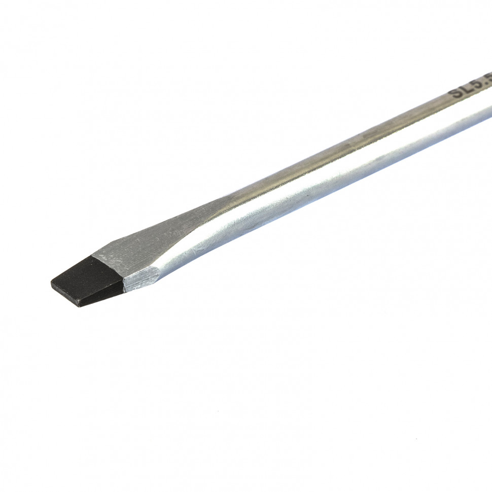 - Твердость и прочность обеспечивается высоким качеством материалов: стержень выполнен из стали CrV, а жало — из закаленной инструментальной стали S2.