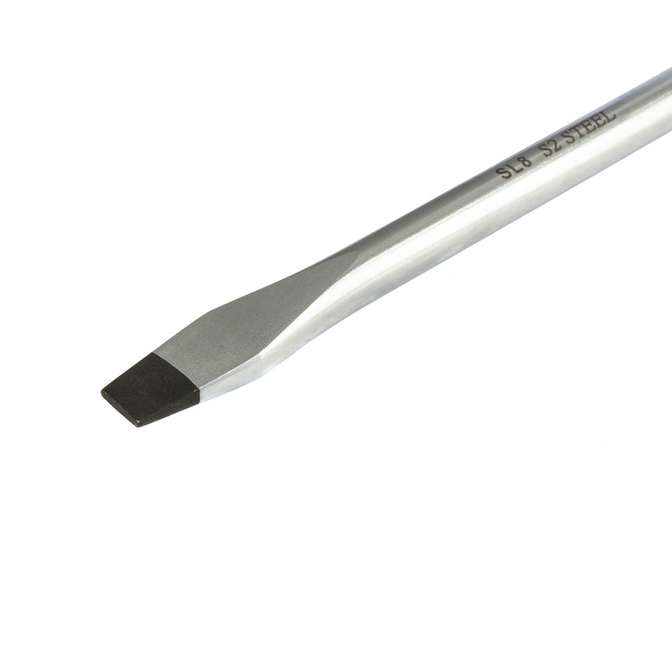 - Твердость и прочность обеспечивается высоким качеством материалов: стержень выполнен из стали CrV, а жало — из закаленной инструментальной стали S2.