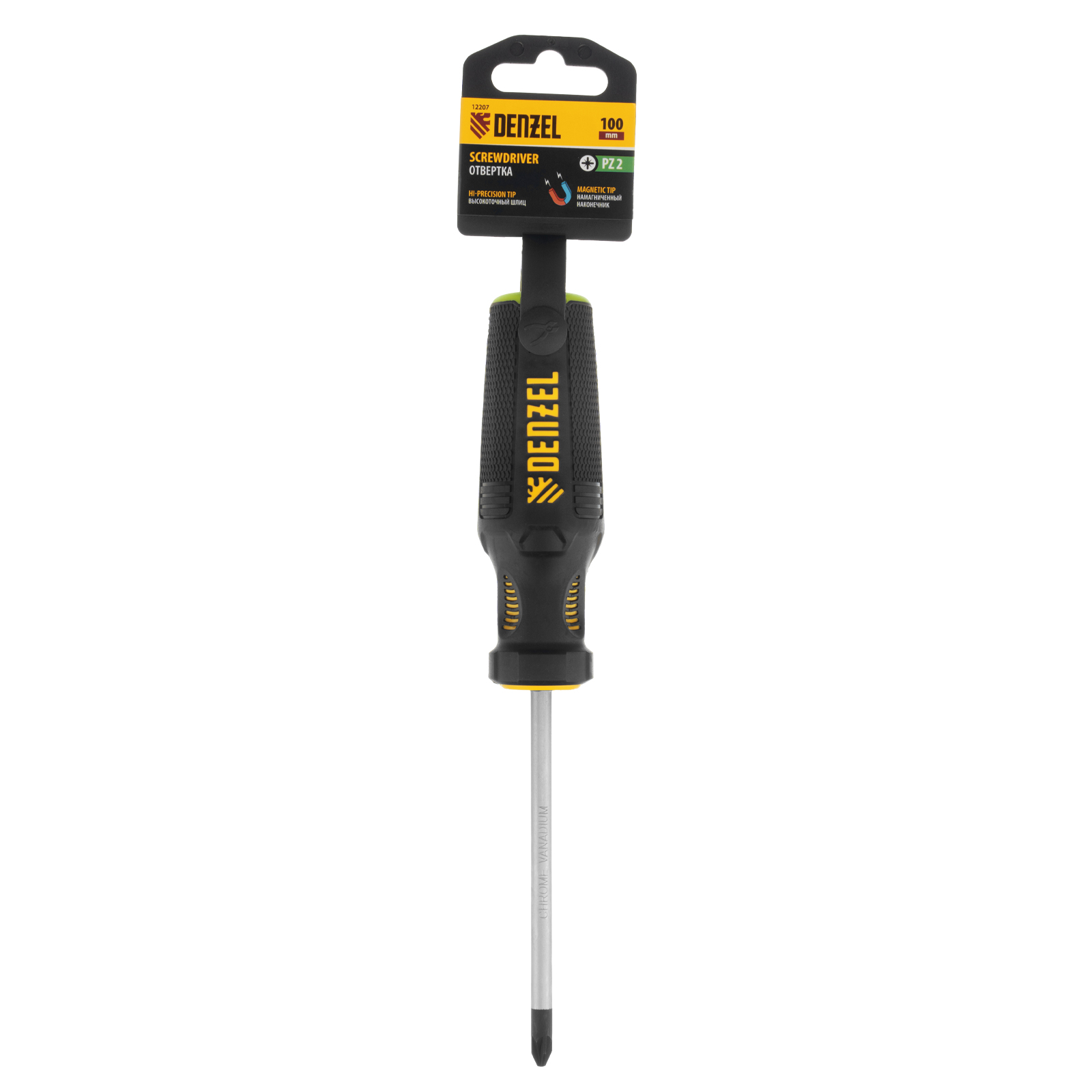 Отвертка PZ2 x 100 мм Denzel 12207 из стали CrV, c трехкомпонентной рукояткой, предназначена для монтажных и демонтажных работ с резьбовыми соединениями типа Pozidriv. Благодаря намагниченному шлицу отвертку с крепежом можно направлять одной рукой, удерживая другой закрепляемую деталь. Инструмент подходит для профессионального использования.