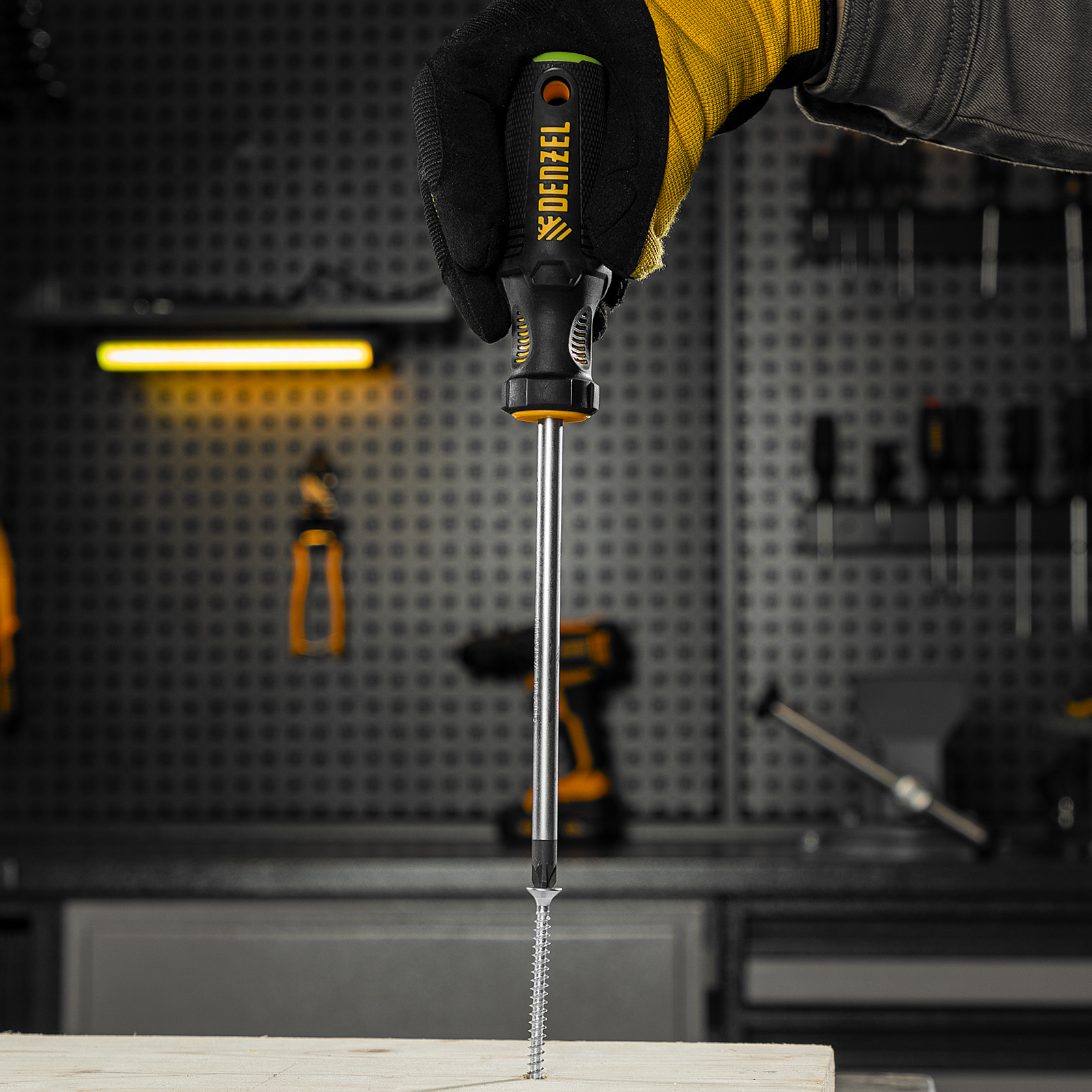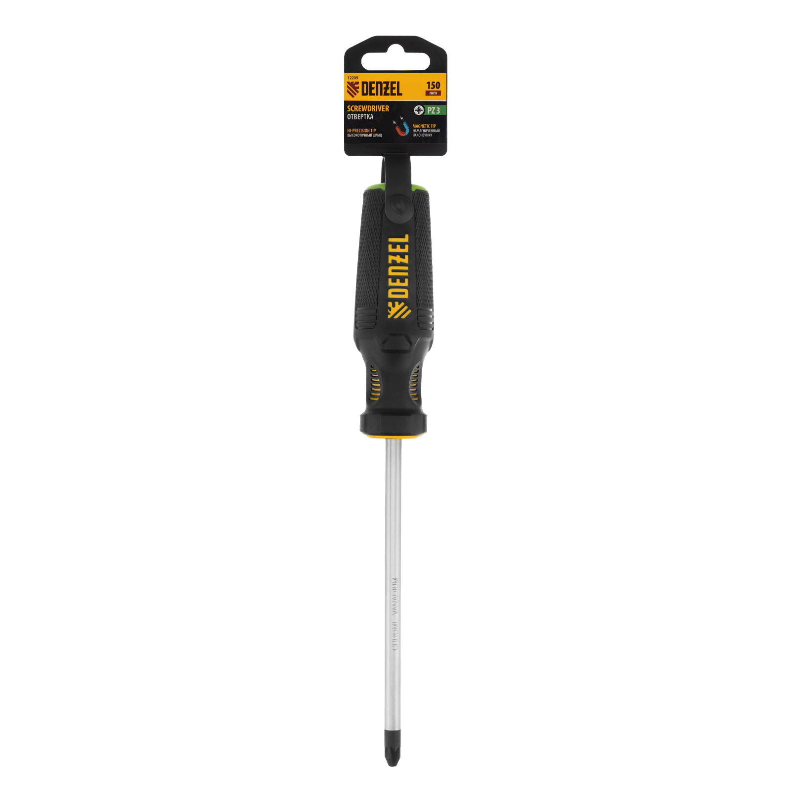 Отвертка PZ3 x 150 мм Denzel 12209 из стали CrV, c трехкомпонентной рукояткой, предназначена для монтажных и демонтажных работ с резьбовыми соединениями типа Pozidriv. Благодаря намагниченному шлицу отвертку с крепежом можно направлять одной рукой, удерживая другой закрепляемую деталь. Инструмент подходит для профессионального использования.