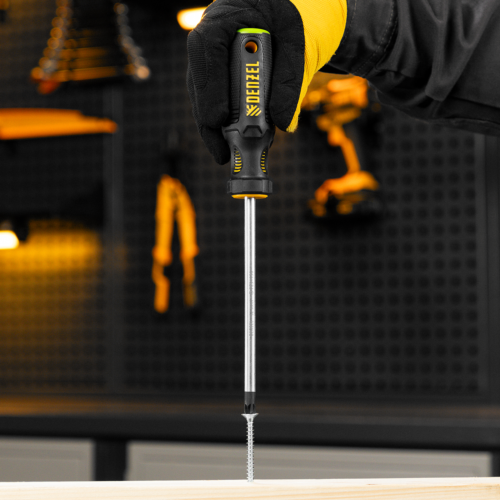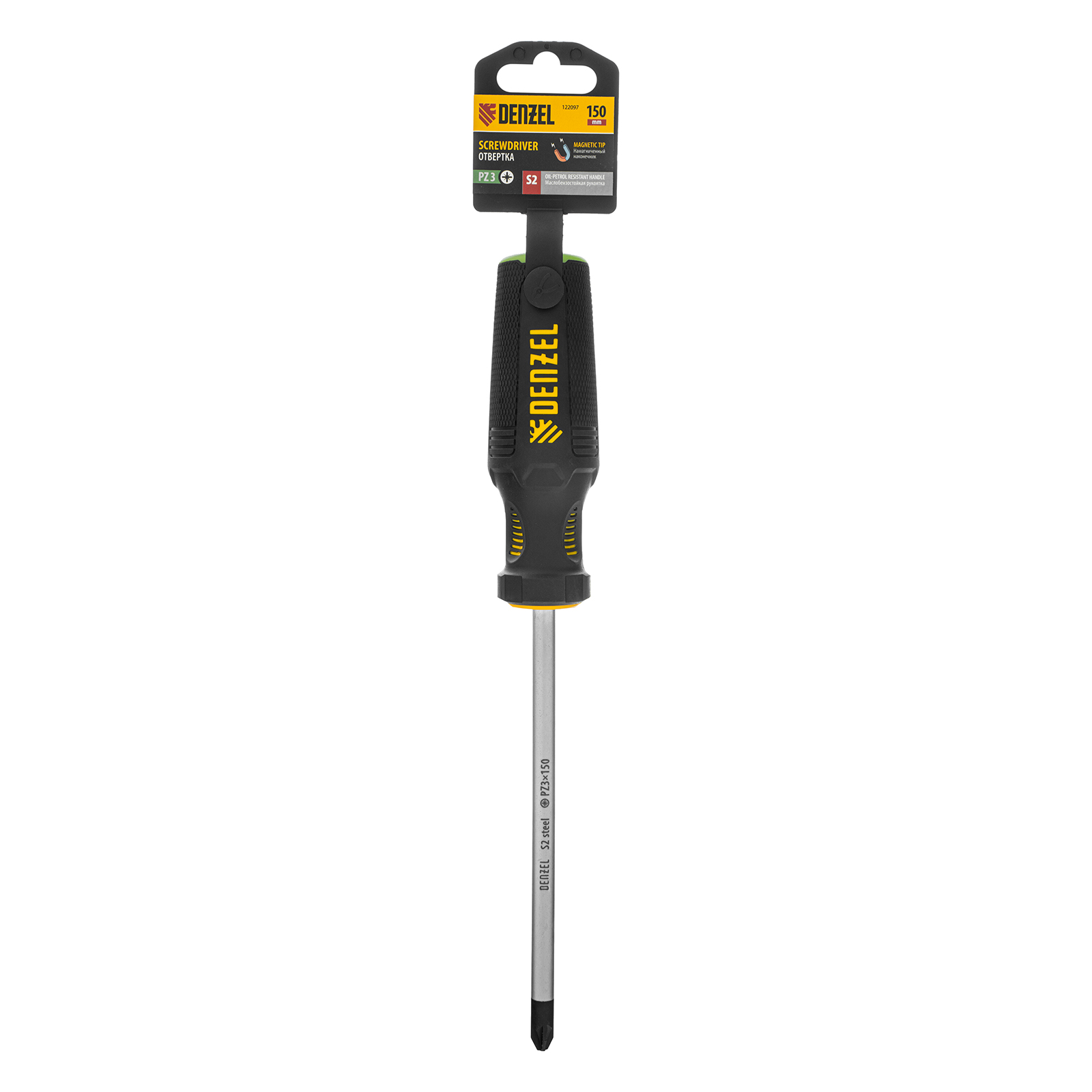 Отвертка Denzel 122097 с трехкомпонентной рукояткой, со стержнем из стали S2, длиной 150 мм, имеет шлиц PZ3 и предназначена для монтажных и демонтажных работ с резьбовыми соединениями типа Pozidriv. Благодаря намагниченному высокоточному шлицу отвертку с крепежом можно направлять одной рукой, удерживая другой закрепляемую деталь. Инструмент подходит для профессионального использования.