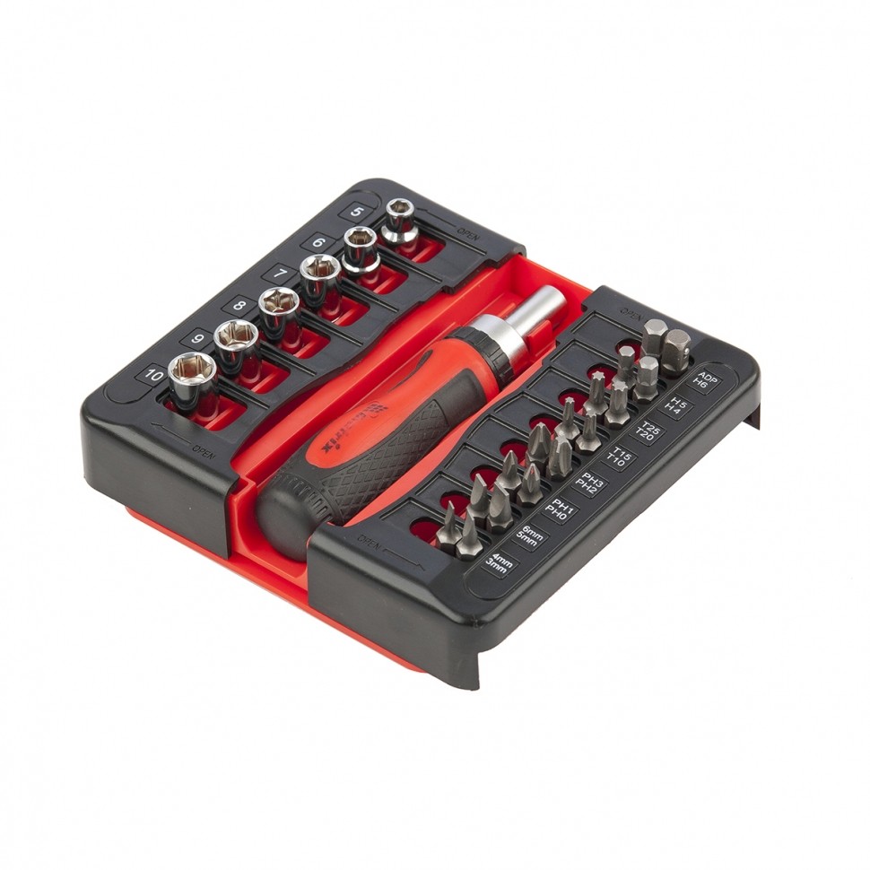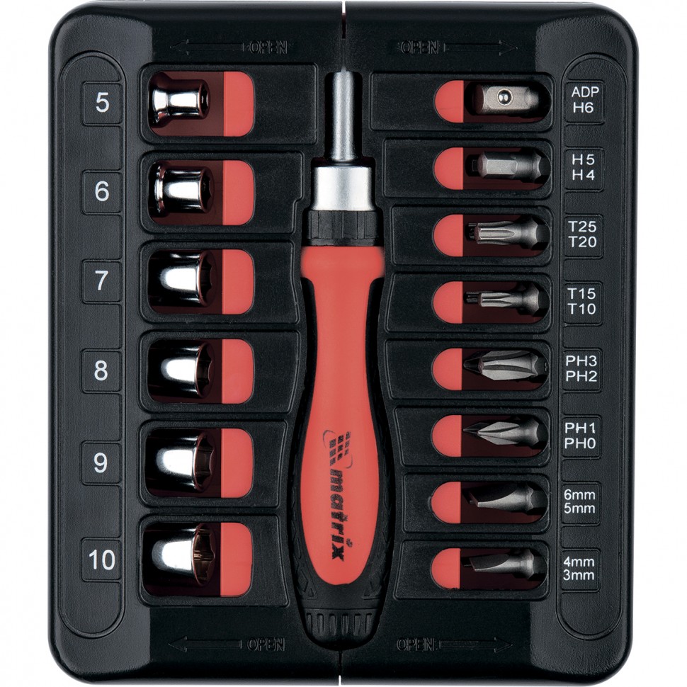 Отвертка реверсивная с набором бит и торцевых головок, 23 шт, CrV Matrix