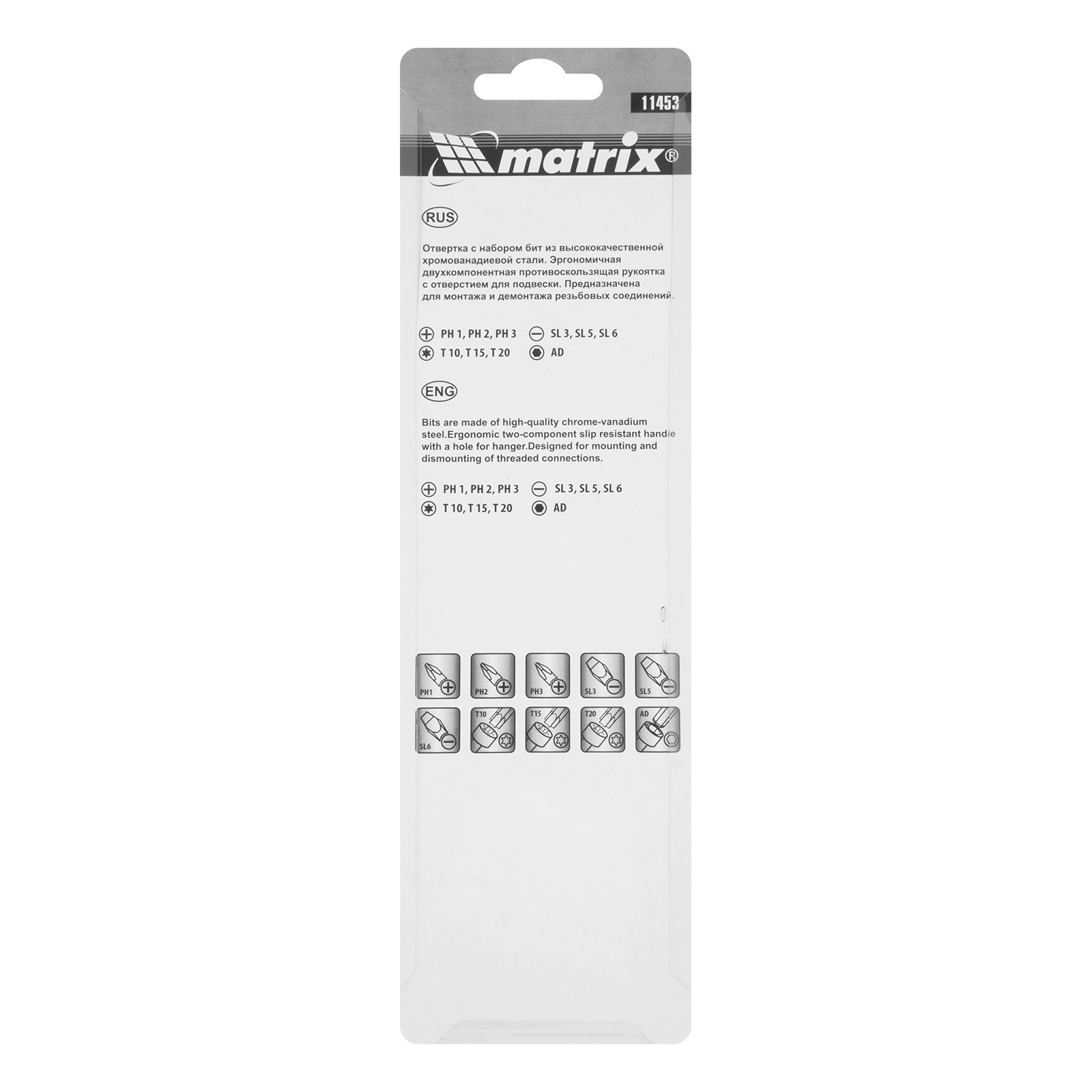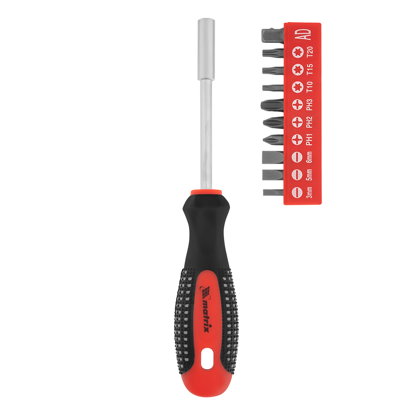 Отвертка с набором бит Matrix Fusion 11453 из стали CrV, с трехкомпонентной рукояткой «Anti slip», входит в комплект из 11 предметов, предназначенный для работы с резьбовым крепежом. Представляет собой отвертку-держатель и поставляется с битами наиболее распространенных размеров со шлицами PH, SL и Torx, поэтому заменяет собой несколько стандартных отверток. Набор пригодится для сборки мебели, ремонта электроприборов, будет полезен в гараже.