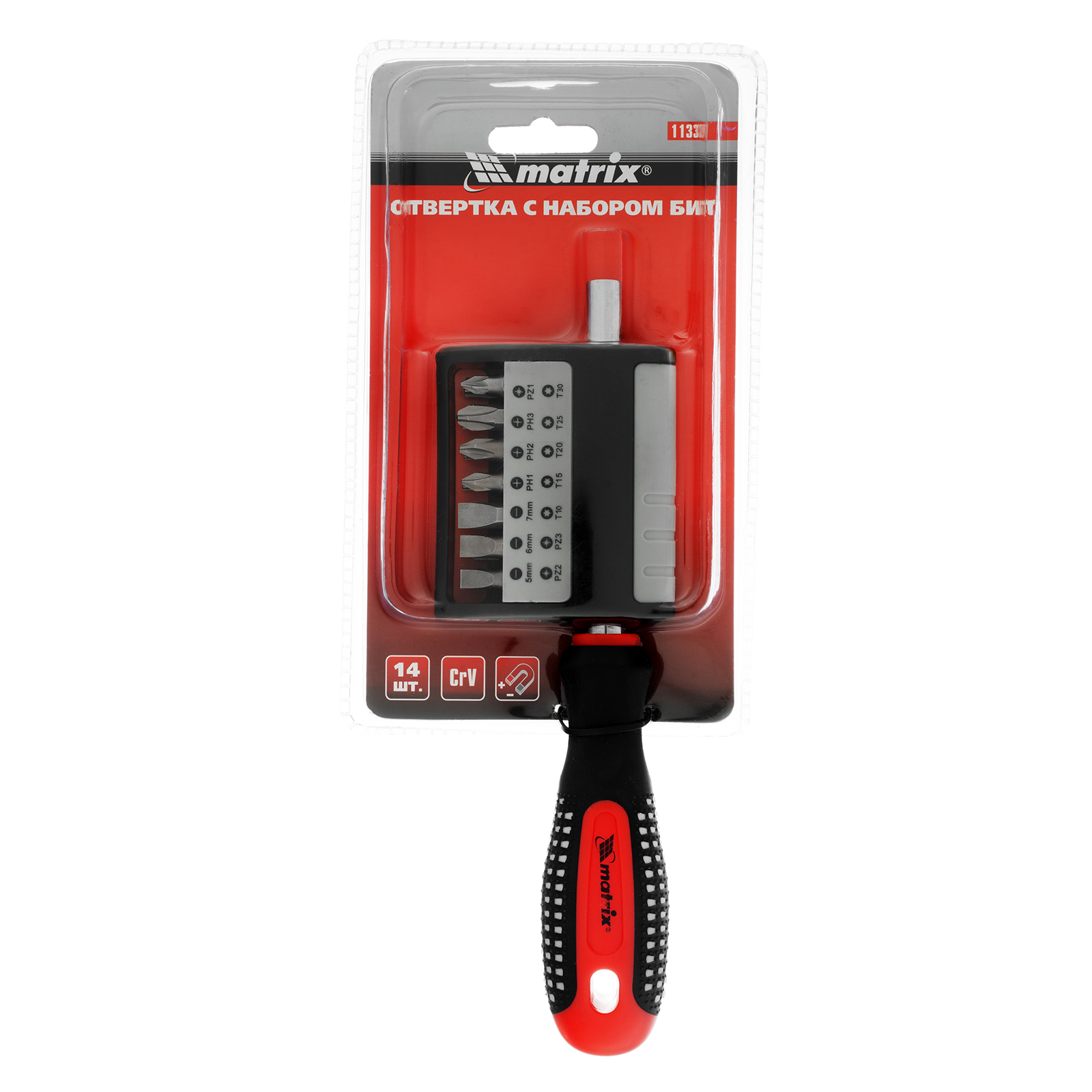 Отвертка Matrix 11337 с набором из 14 бит из стали CrV служит для откручивания и закручивания резьбового крепежа со шлицами SL, PH, PZ и Torx. Заменяет комплект стандартных отверток. Присоединительный шестигранник с магнитом надежно удерживает биту, не давая ей выскочить во время работы. Набор подходит для профессионального и бытового применения.
