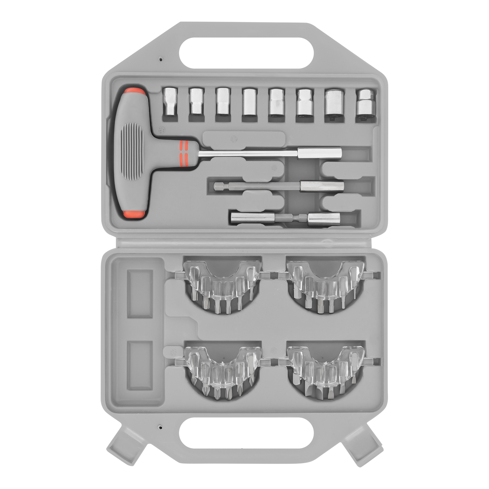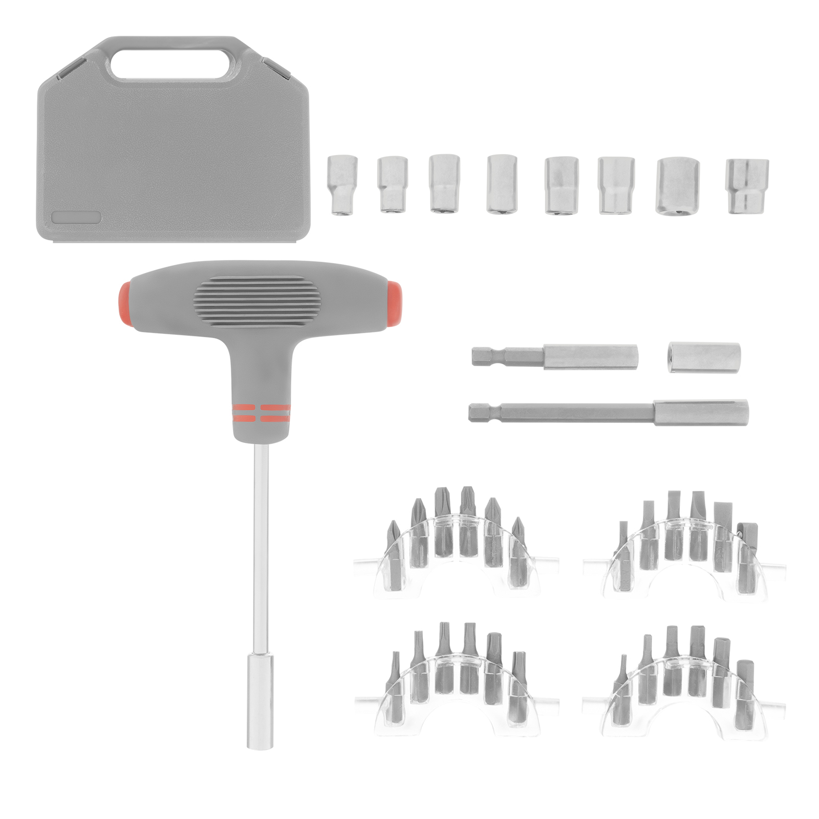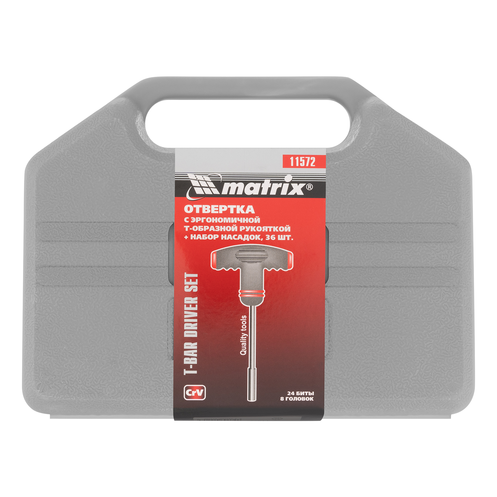 Отвертка Matrix 11572 с Т-образной эргономичной ручкой, с набором насадок из стали CrV, входит в комплект из 36 предметов, упакованный в пластиковый бокс. Используется для монтажа и демонтажа резьбовых крепежей. В набор входят биты со шлицами SL, PH, PZ, Torx и HEX, а также торцевые головки с адаптером, что позволяет работать с болтами, шурупами и гайками. Битодержатели-удлинители 60 и 90 мм облегчают работу в ограниченном пространстве. Набор будет полезен во время ремонта электроприборов, сборки мебели, монтажных работ, обслуживания автомобилей, кроме того, его можно взять с собой в поездку.