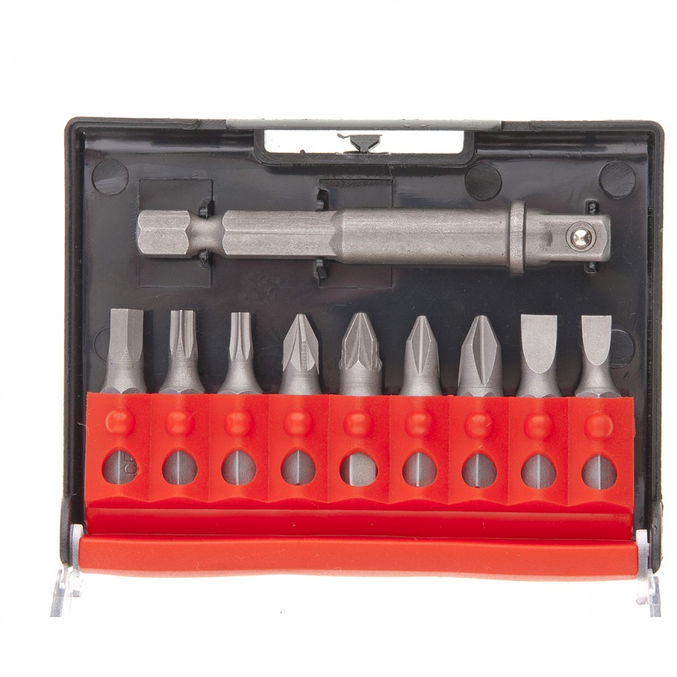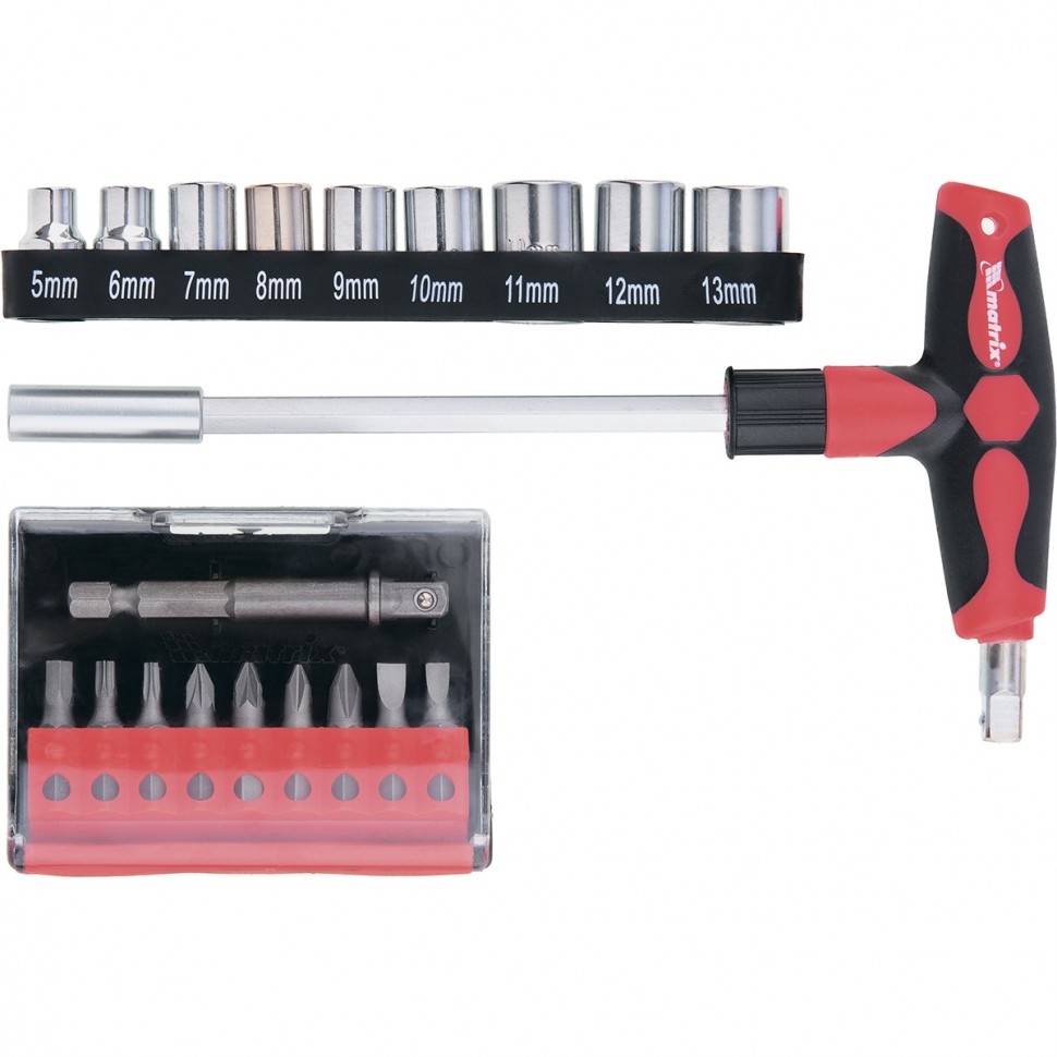 Отвертка Matrix 11574 с Т-образной эргономичной ручкой, набором бит и насадок (торцевых головок) из стали CrV, входит в комплект из 20 предметов, предназначенный для работы с резьбовым крепежом. В нем 9 бит и 9 торцевых головок, поэтому набор подходит для монтажа и демонтажа болтов, шурупов и гаек. Для фиксации бит предусмотрен присоединительный шестигранник размером 1/4", для торцевых головок имеется адаптер. Использование присоединительного квадрата размером 1/4", встроенного в ручку отвертки, позволяет увеличить длину рычага и работать со значительным усилием. Набор рекомендован для профессионального применения.