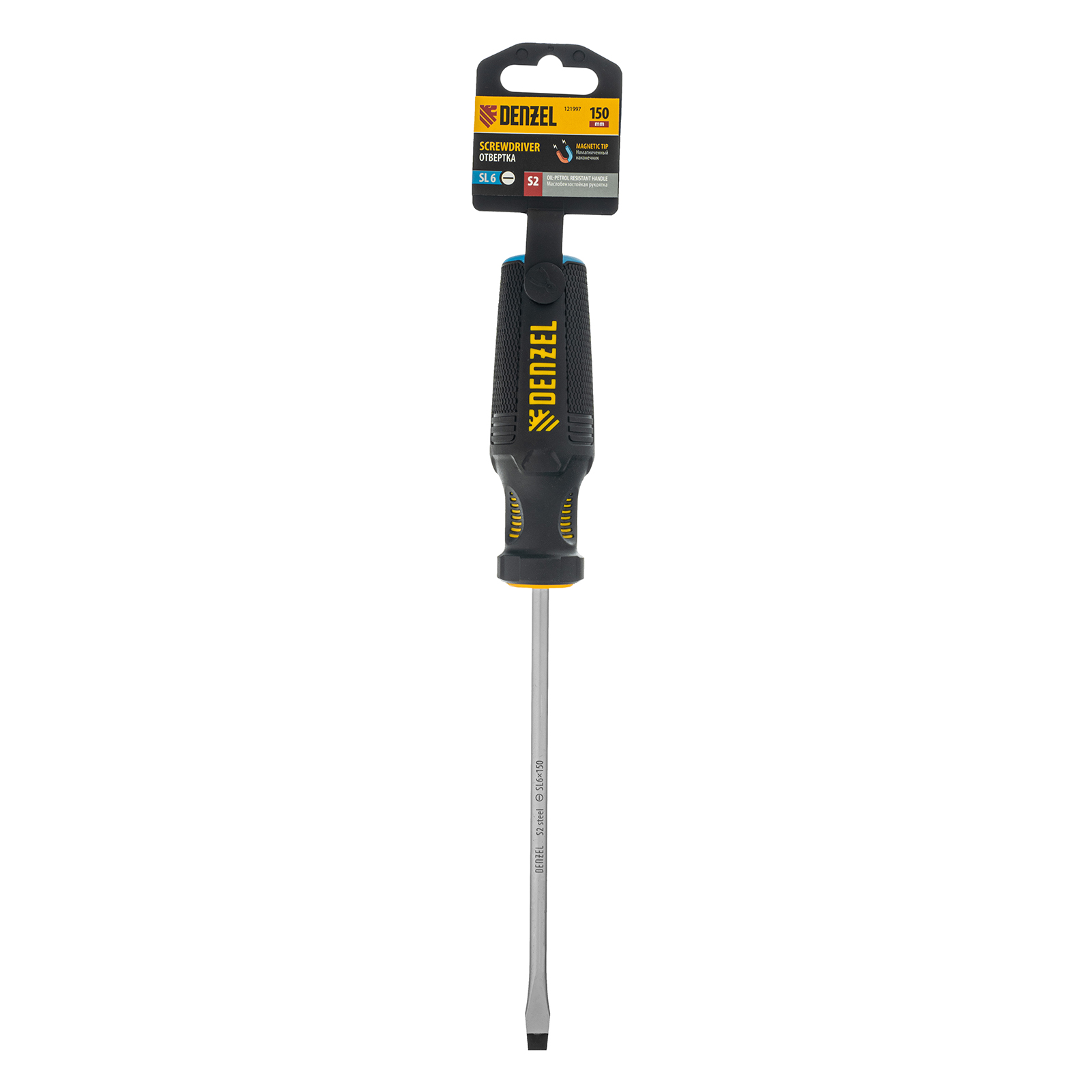 Отвертка Denzel 121997 с трехкомпонентной рукояткой, со стержнем из стали S2, длиной 150 мм, предназначена для монтажа и демонтажа винтов и саморезов с прямым шлицем SL6. Высокоточный намагниченный шлиц крепко фиксируется в головке крепежа. Отвертка выдерживает интенсивное применение, предназначена для выполнения профессиональных ремонтных и монтажных работ.